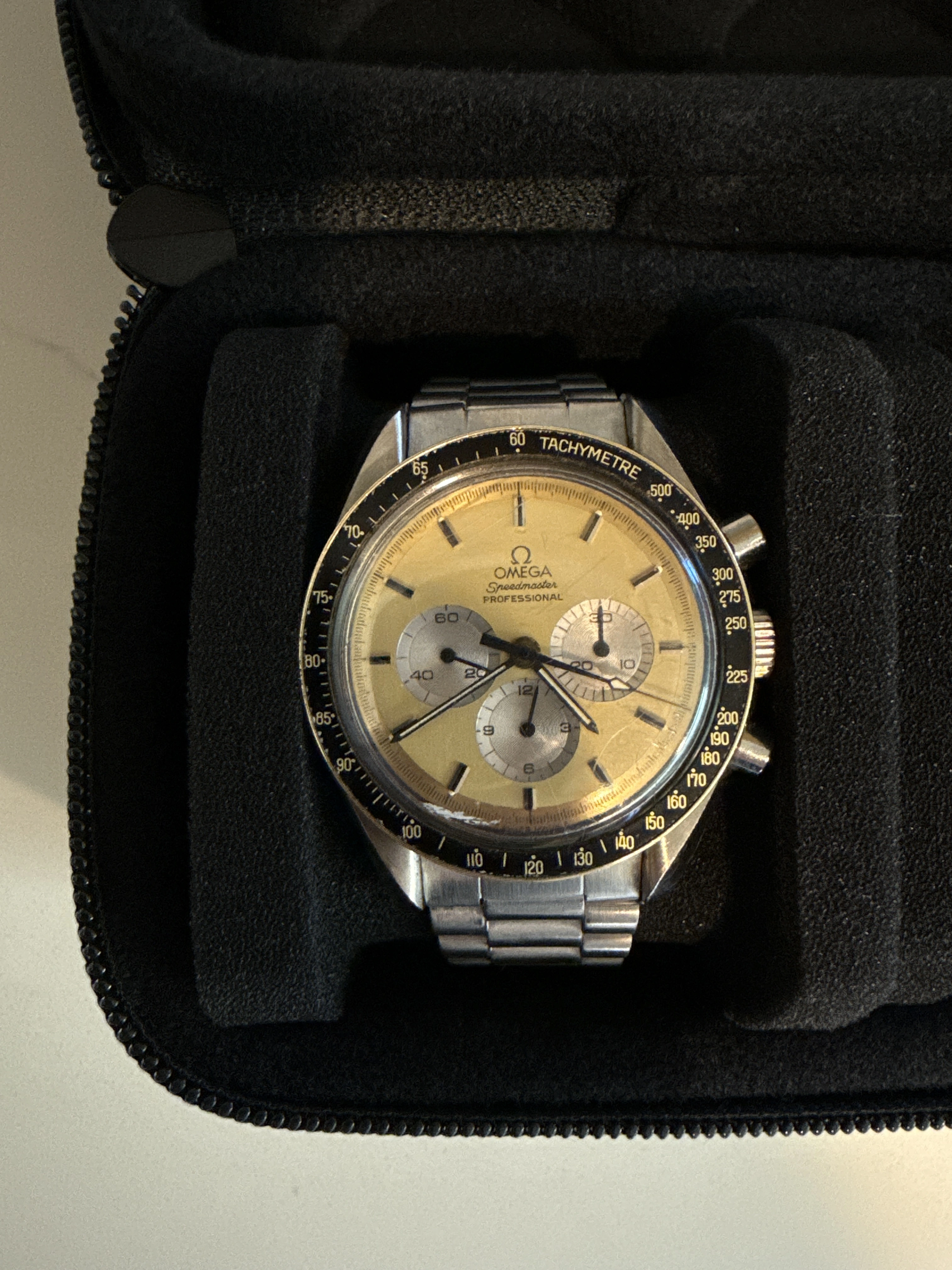 ·I’m trying to identify this Speedmaster Professional I received from a family member. It’s manual-wind, has the “Flight-Qualified by NASA…” caseback, a champagne/gold-tone dial, and a black bezel with gold tachymeter text. The case and pushers are stainless steel, and it’s on a vintage-style 1171 bracelet.