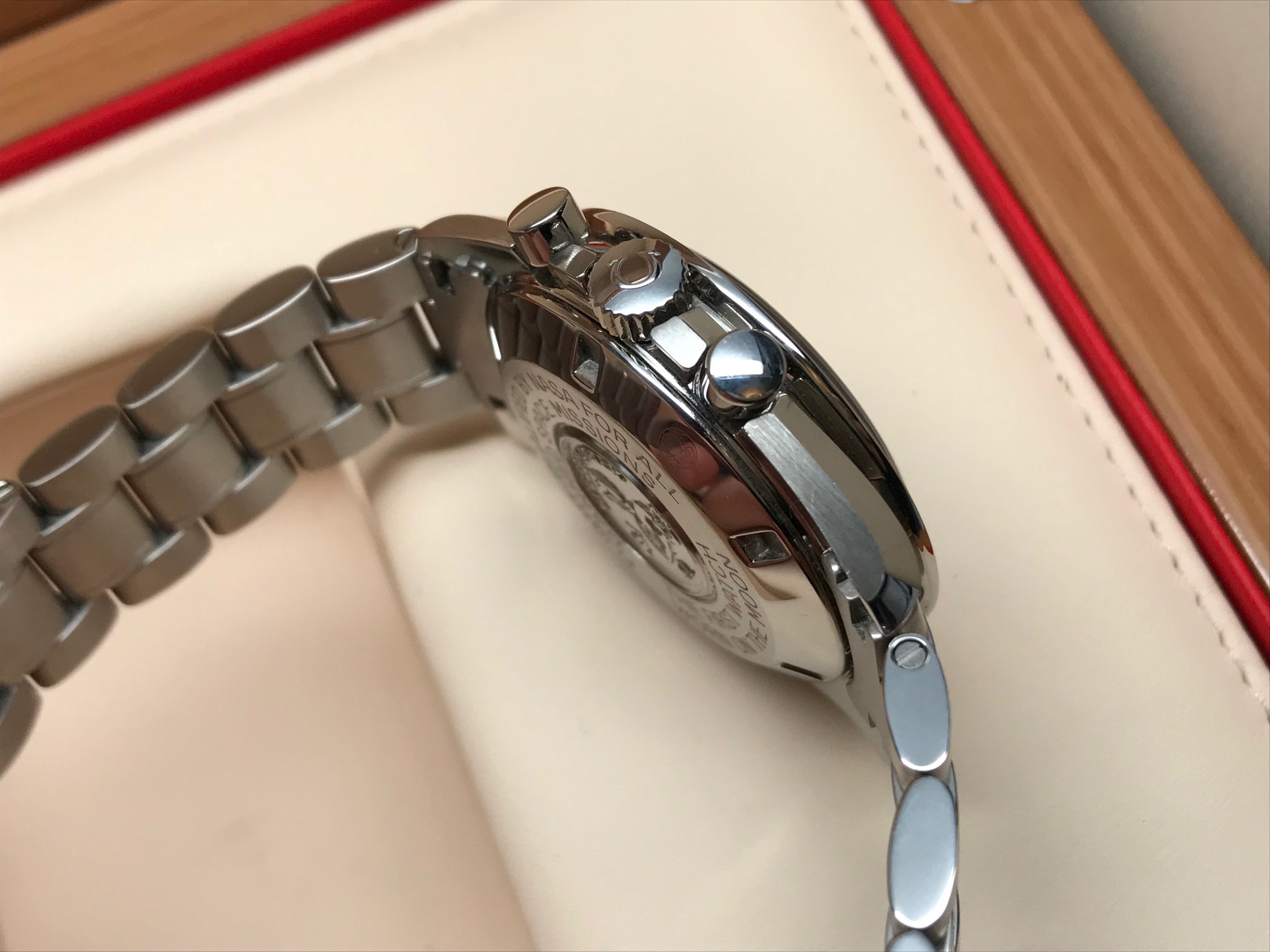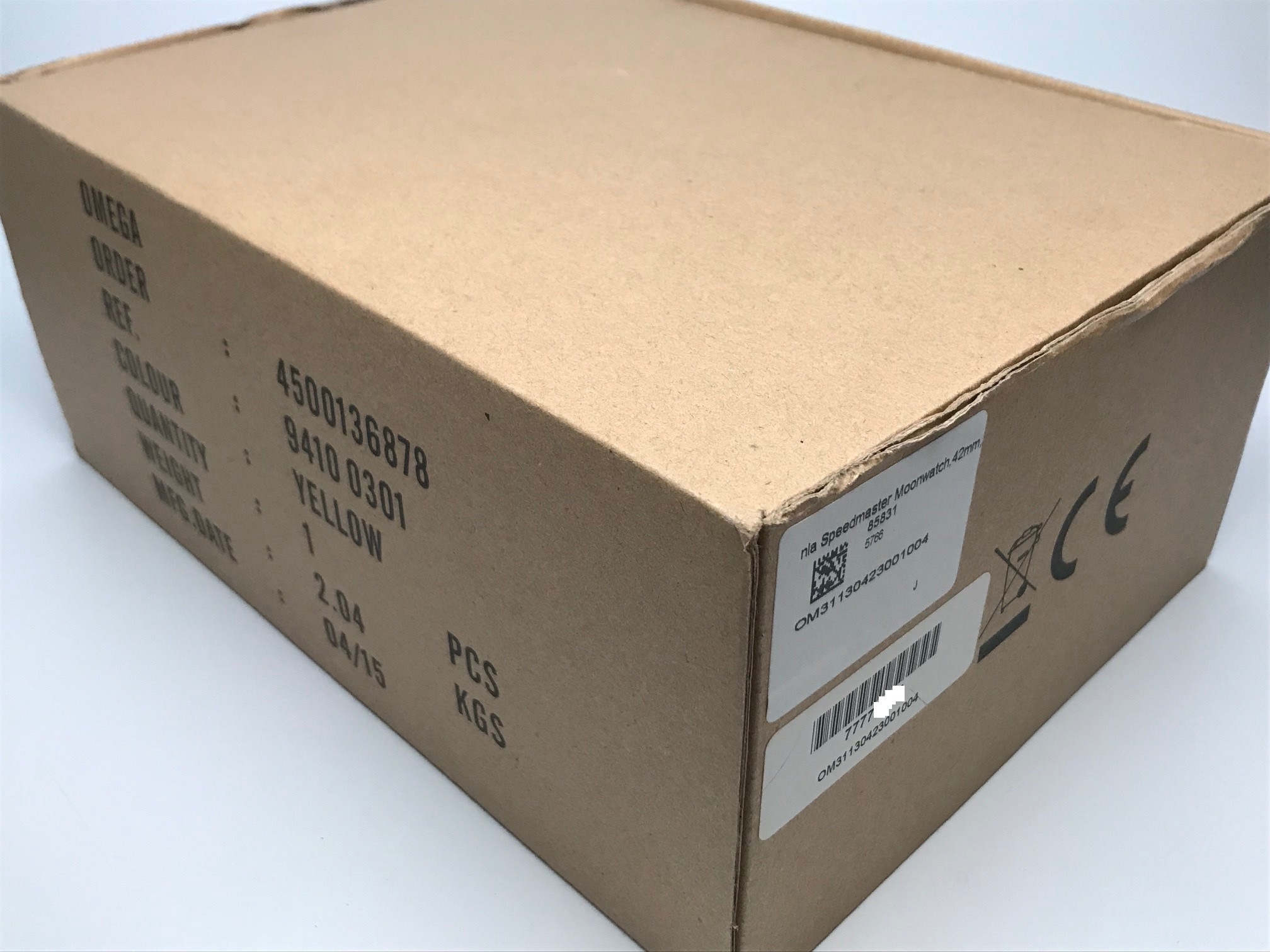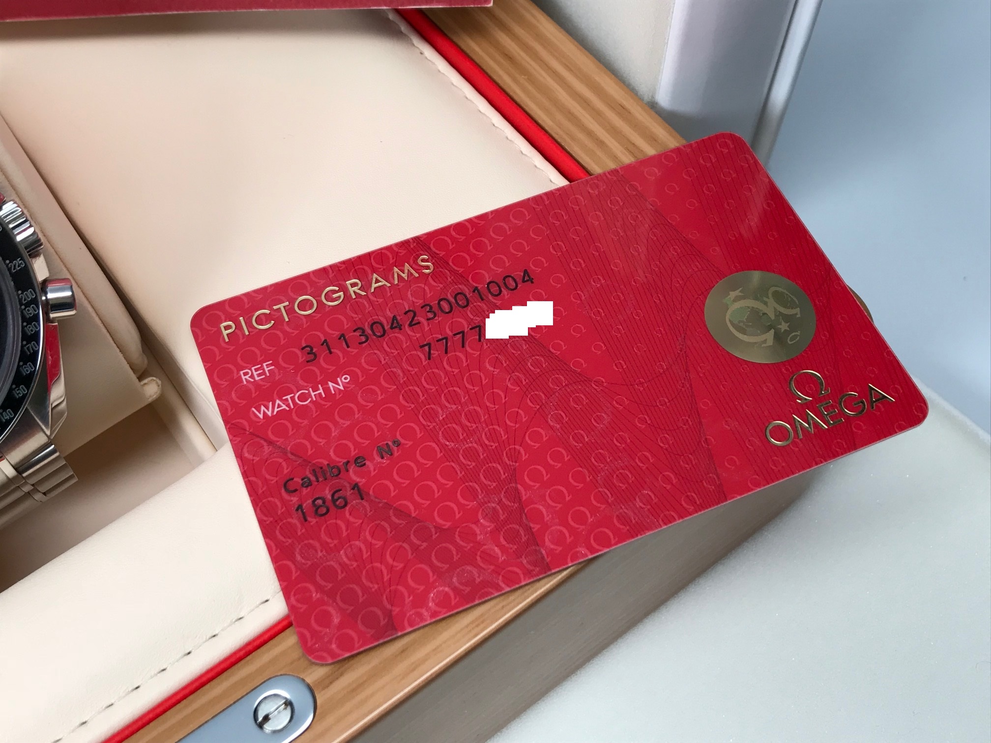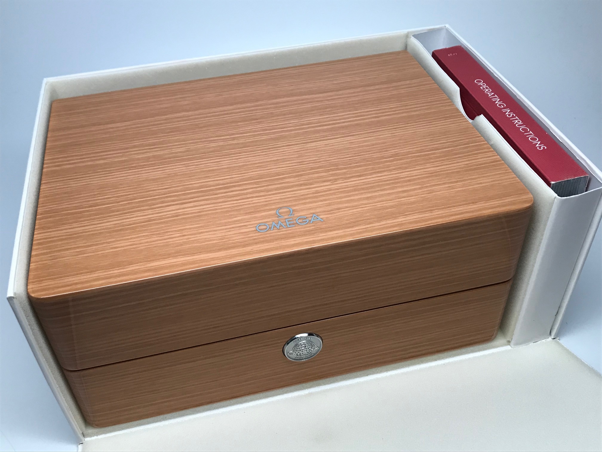 This watch includes the luxury Omega newer style wooden box with double cardboard boxes as well as the pictogram card with matching serial and hang tag with matching serial. Many of these (including this one) were sold through gray dealers because of the marketing issues and low initial demand so the warranty cards were not included.