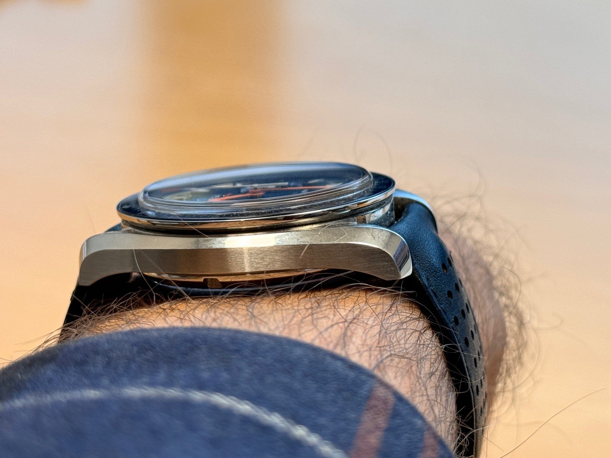 Comparing to manual-wind watches (as i.e. model 57) it is definitely thicker and feels larger. Model 57 and also such like Speedmaster Professional are more delicate/elegant in appearance.