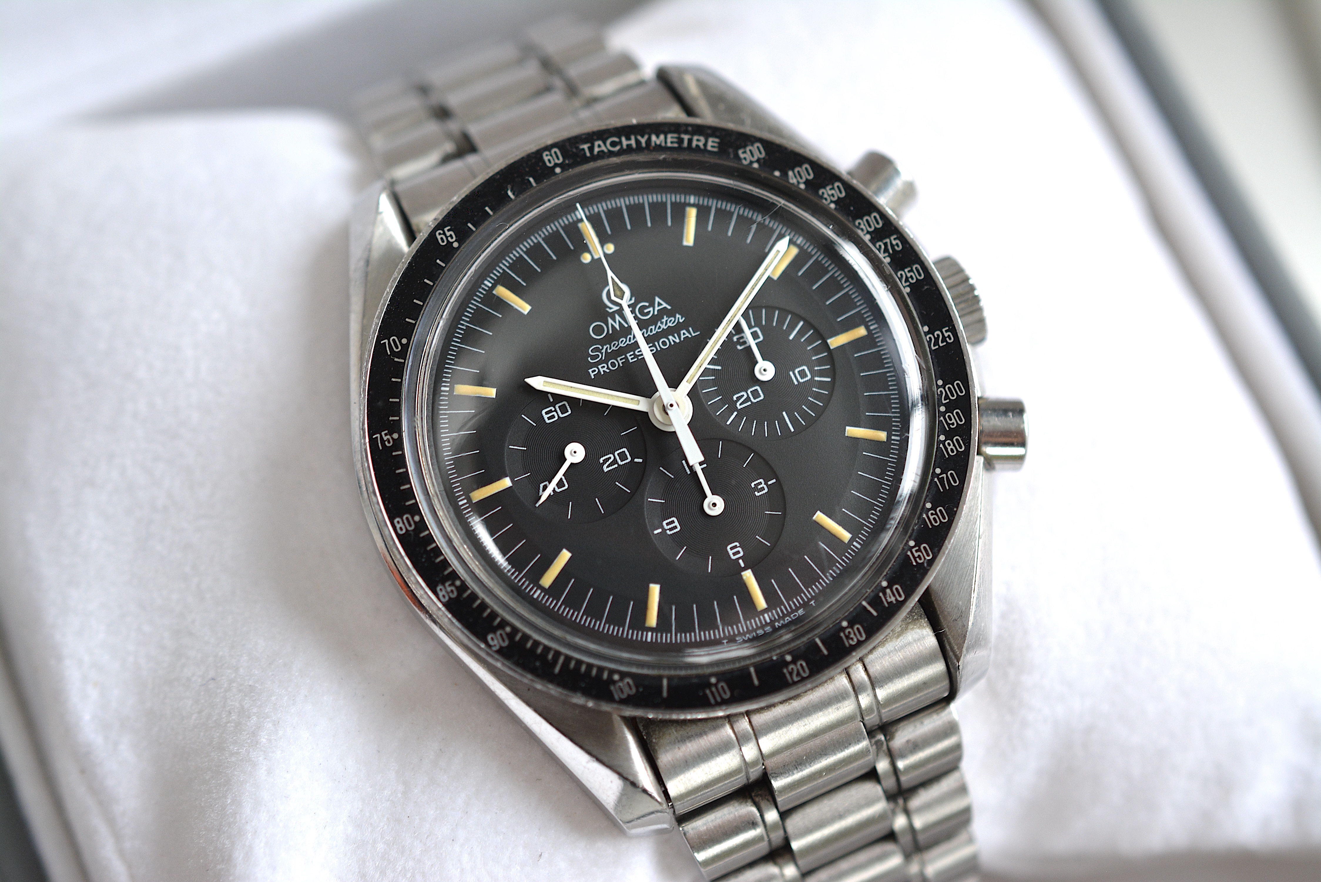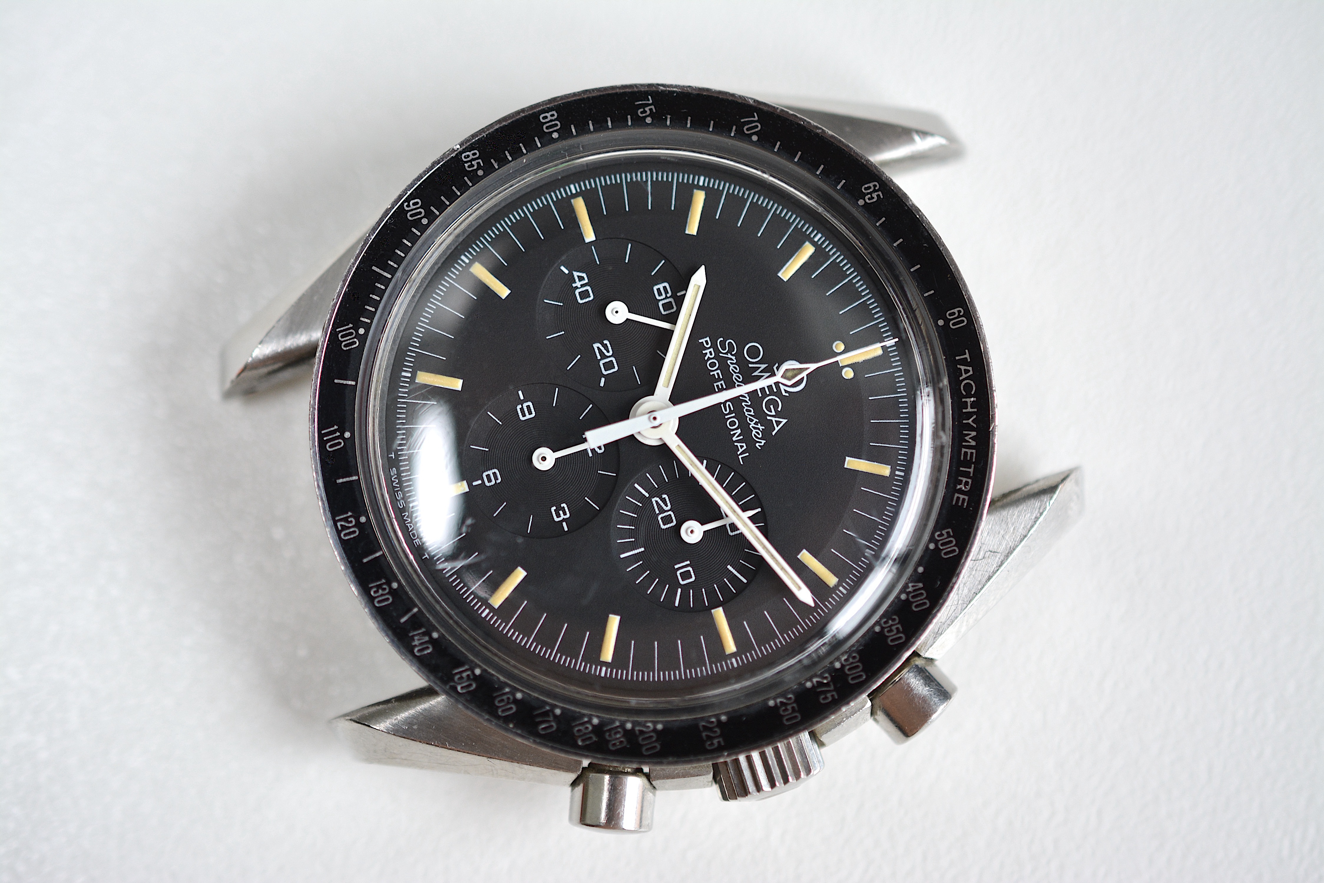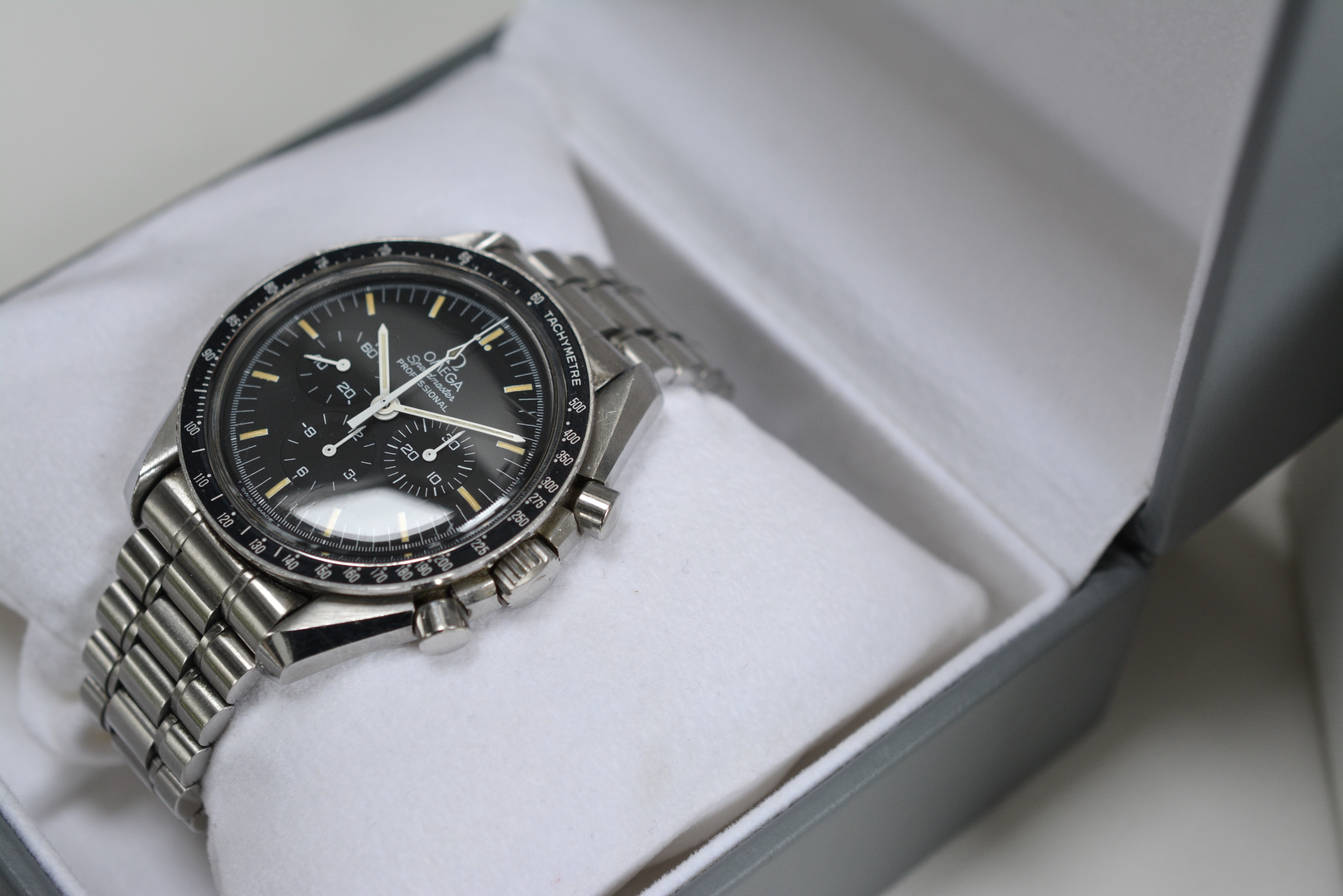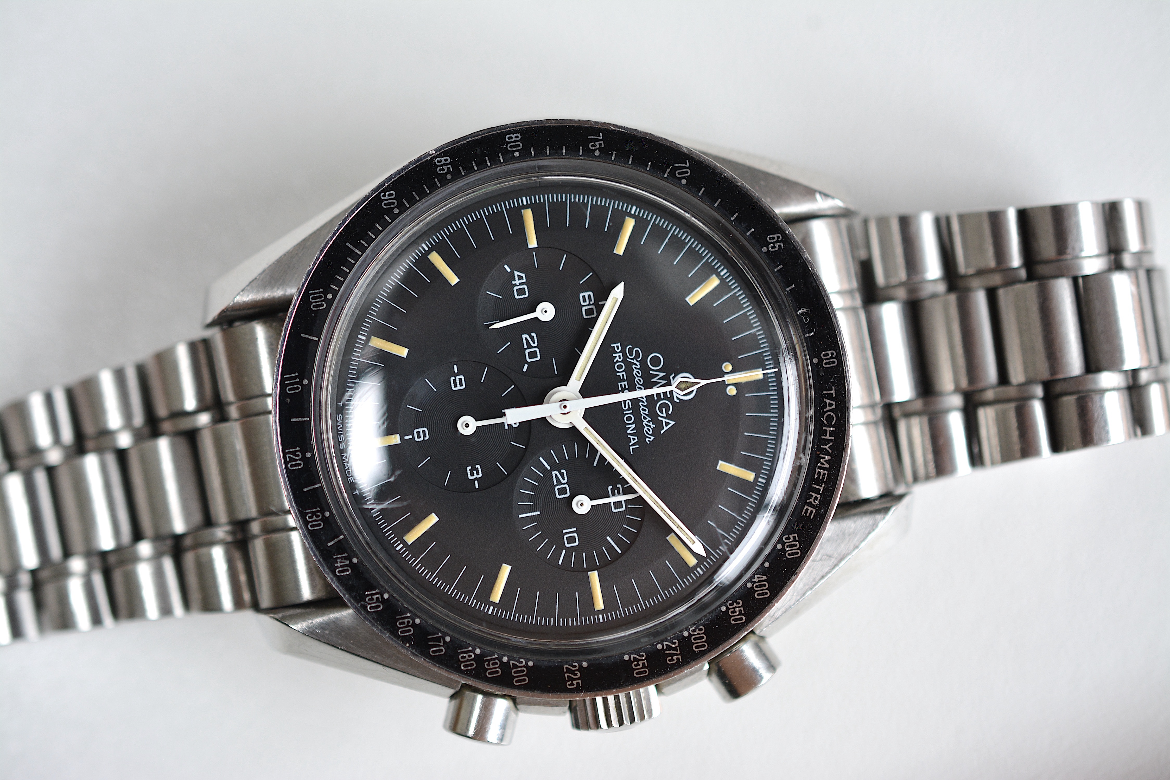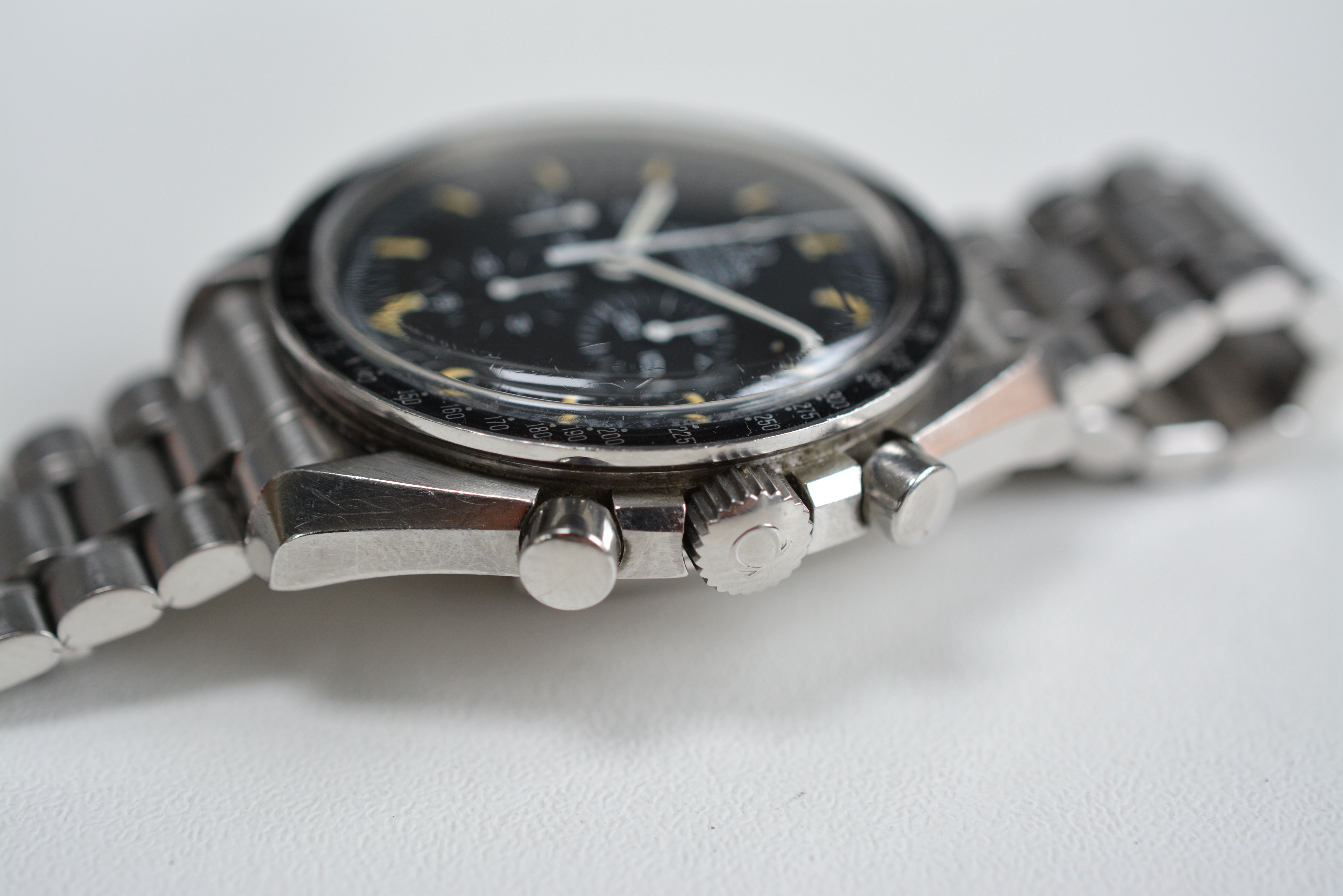 The dial has those beautiful indices we all expect from a 90's Speedmaster. There are no spots or scratches in the dial. While the indices have that yellow/orange color the hands have a more creamy lume color.