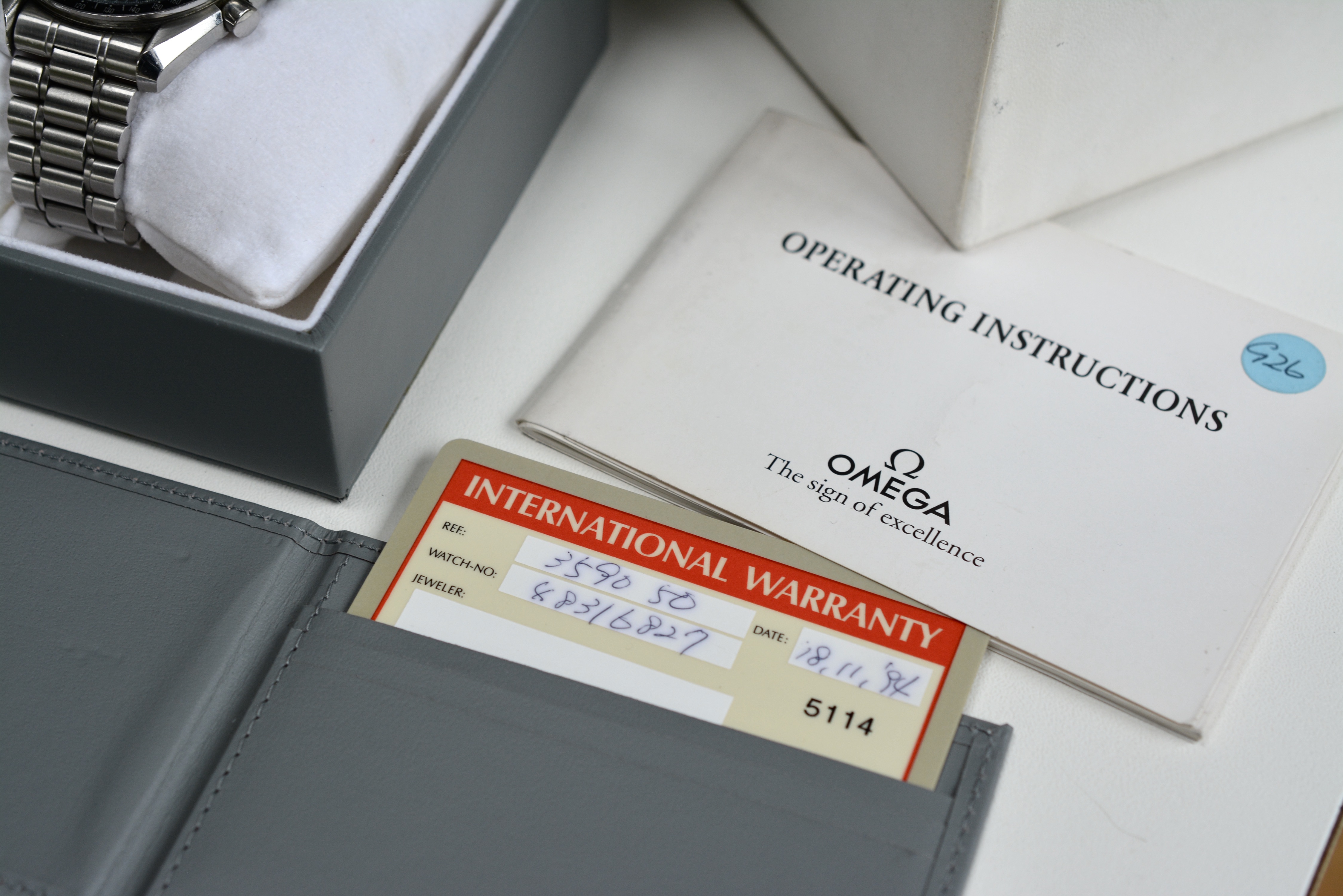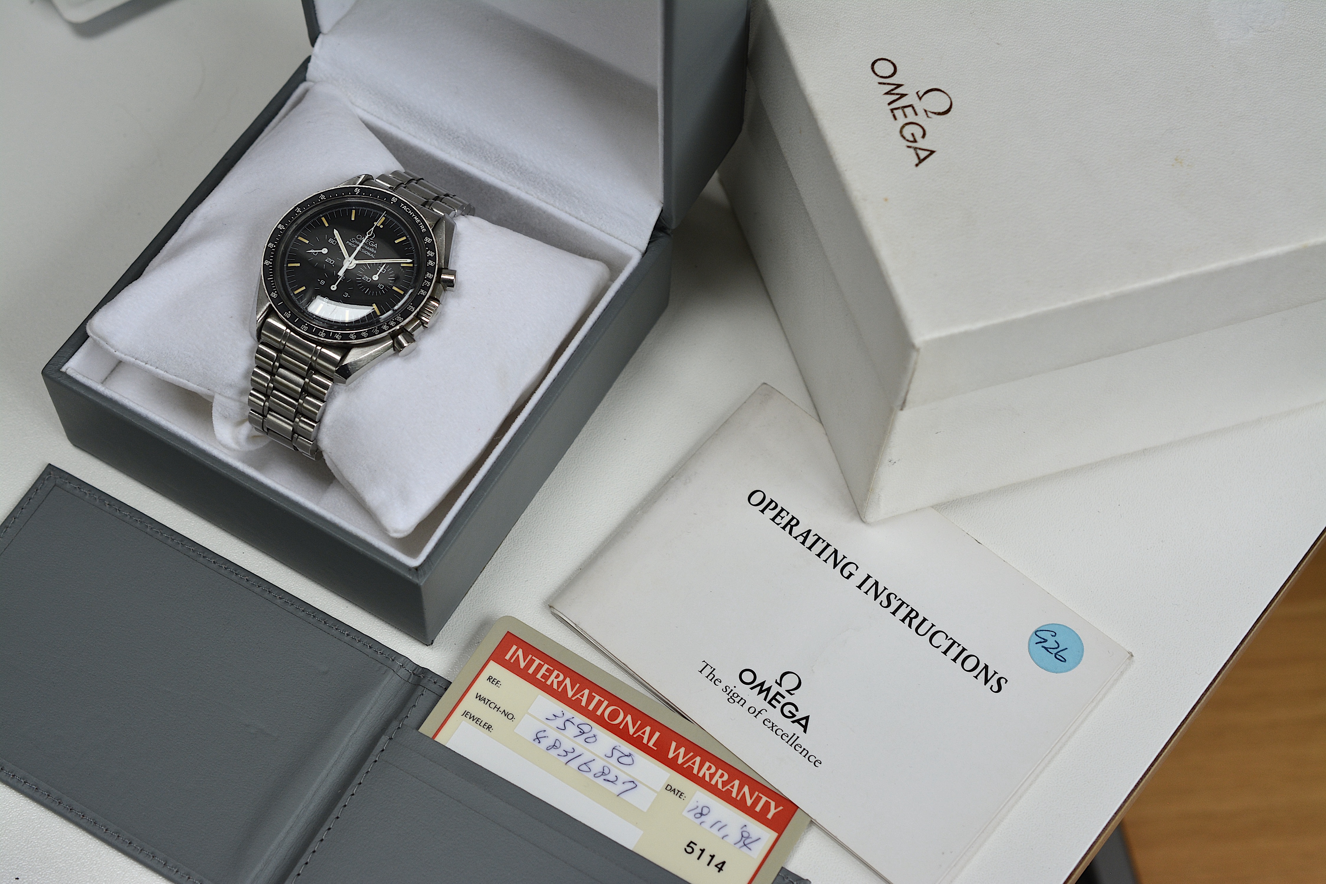 I am offering another Speedmaster ref. 3590.50. This time it's a 1994 full set, consisting of both boxes ( inner light grey box with cushion and outer box, both in excellent condition ), the operating instructions ( you don't see these very often ) and the grey card holder with international warranty card ).