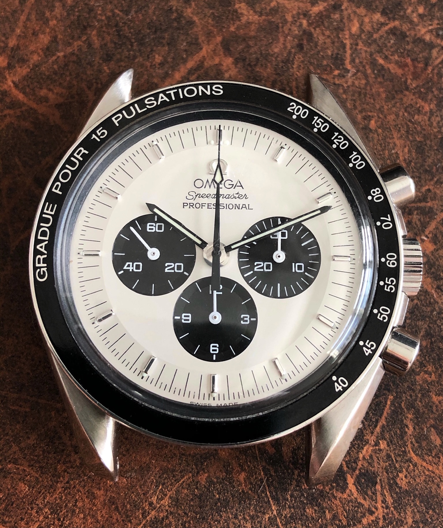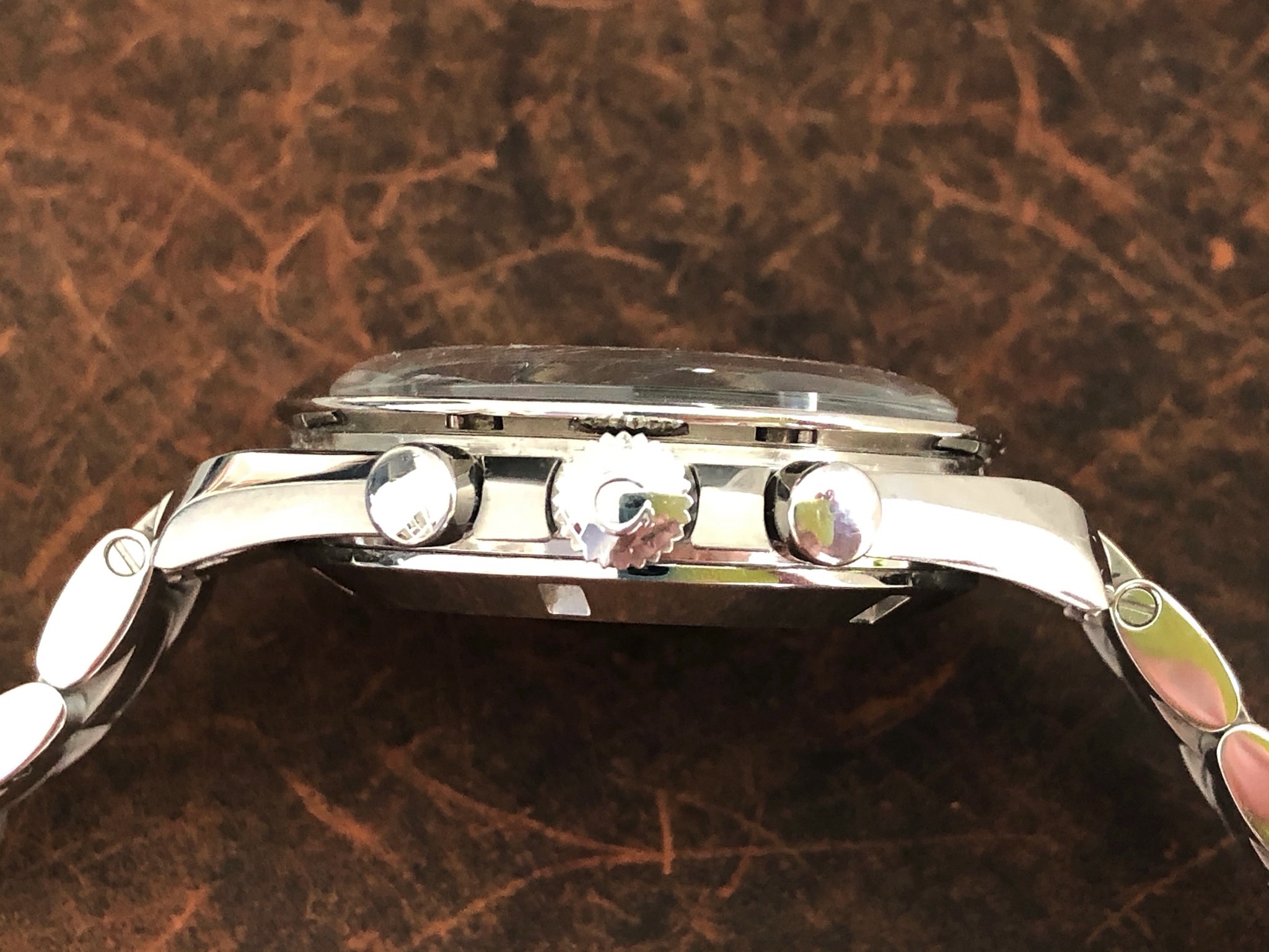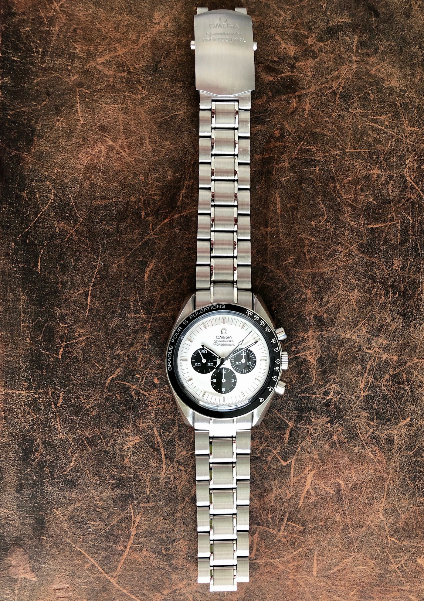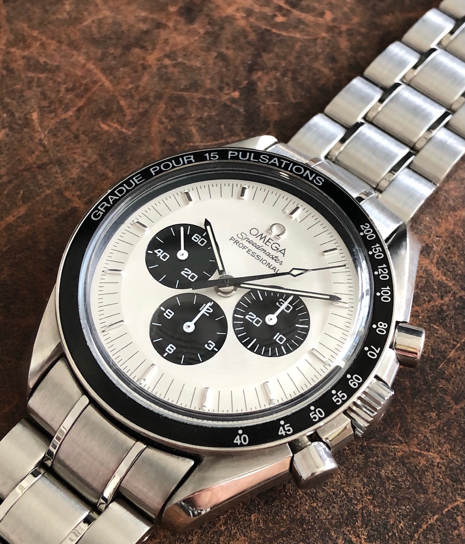 This Speedmaster 3590.50 has been “modded” with the installation of Omega’s Mitsukoshi limited-edition dial, contrasting black hour/minute/chrono & white sub-register hands, and a modern stainless steel bracelet with deployant clasp. All modded parts are Omega OEM. The Mitsukoshi panda dial (originally made for the Omega reference 3570.31 limited edition, sold only through Mitsukoshi department stores in Japan) is becoming increasingly difficult and expensive to source, and even then must still be installed by a qualified watchmaker. Here’s your chance to own one with the work already done.