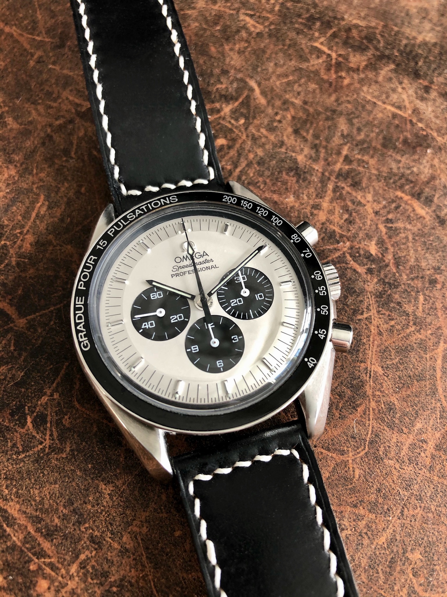 - Lightly worn custom horween leather strap, black with white stitching.