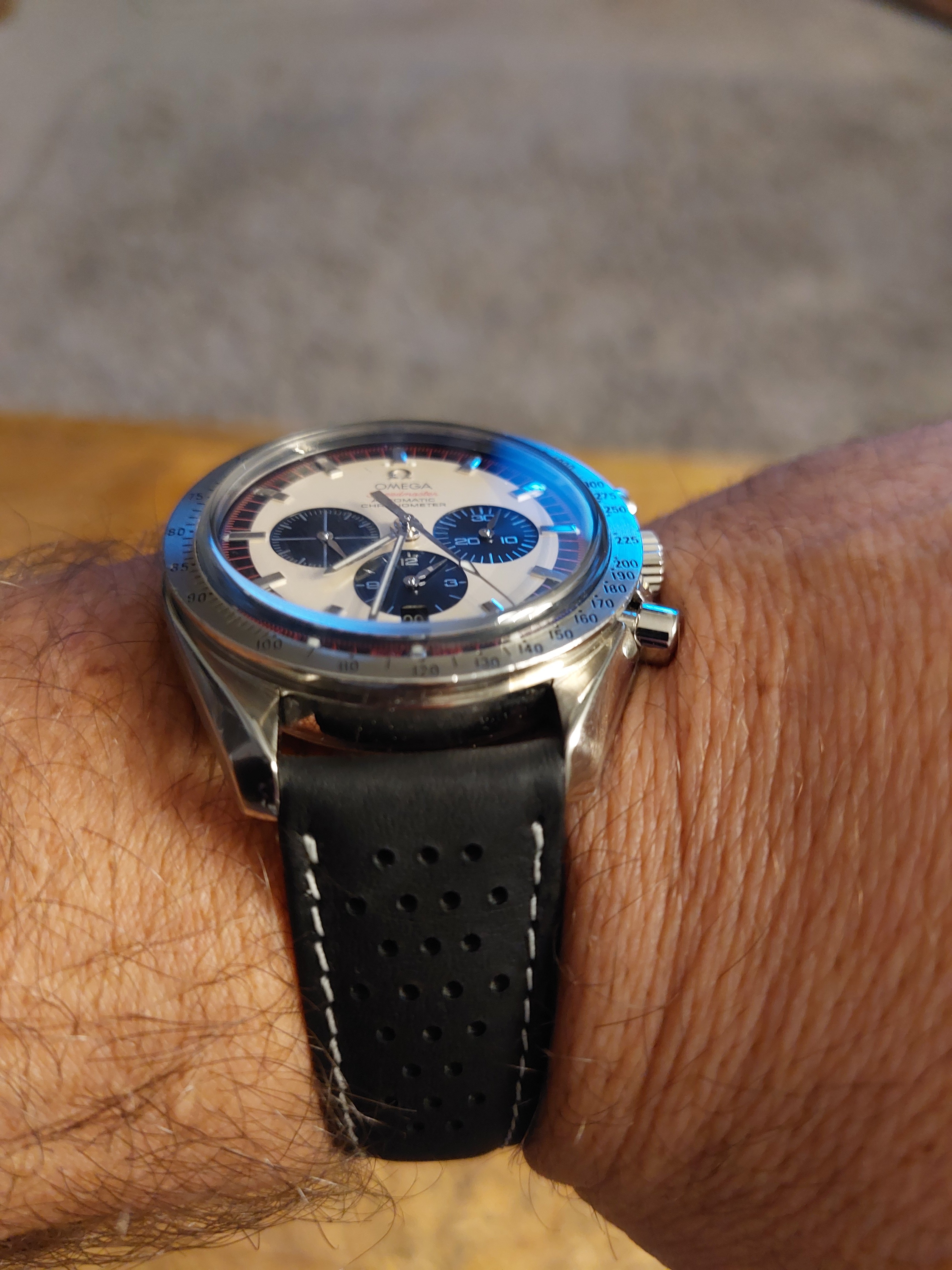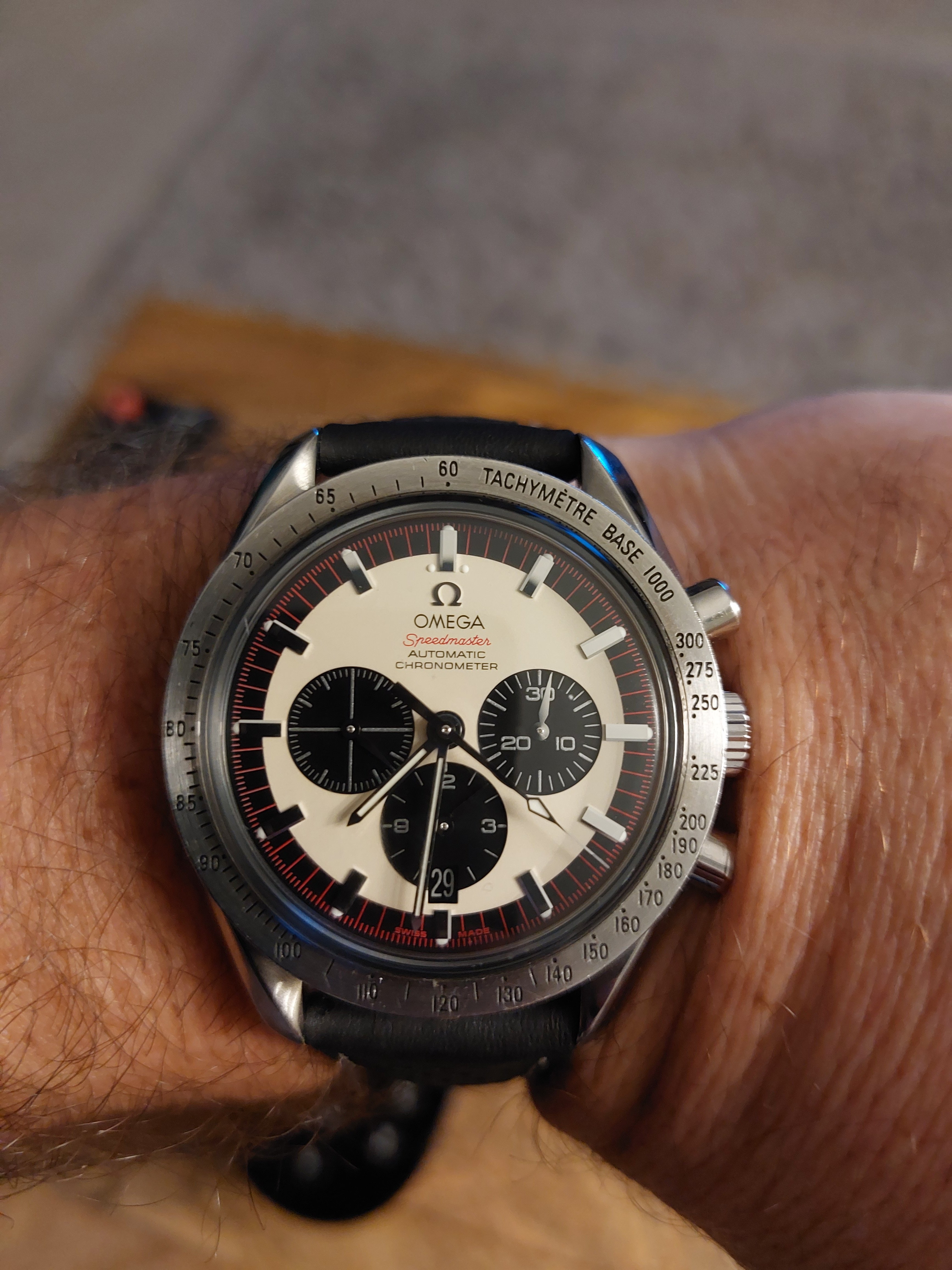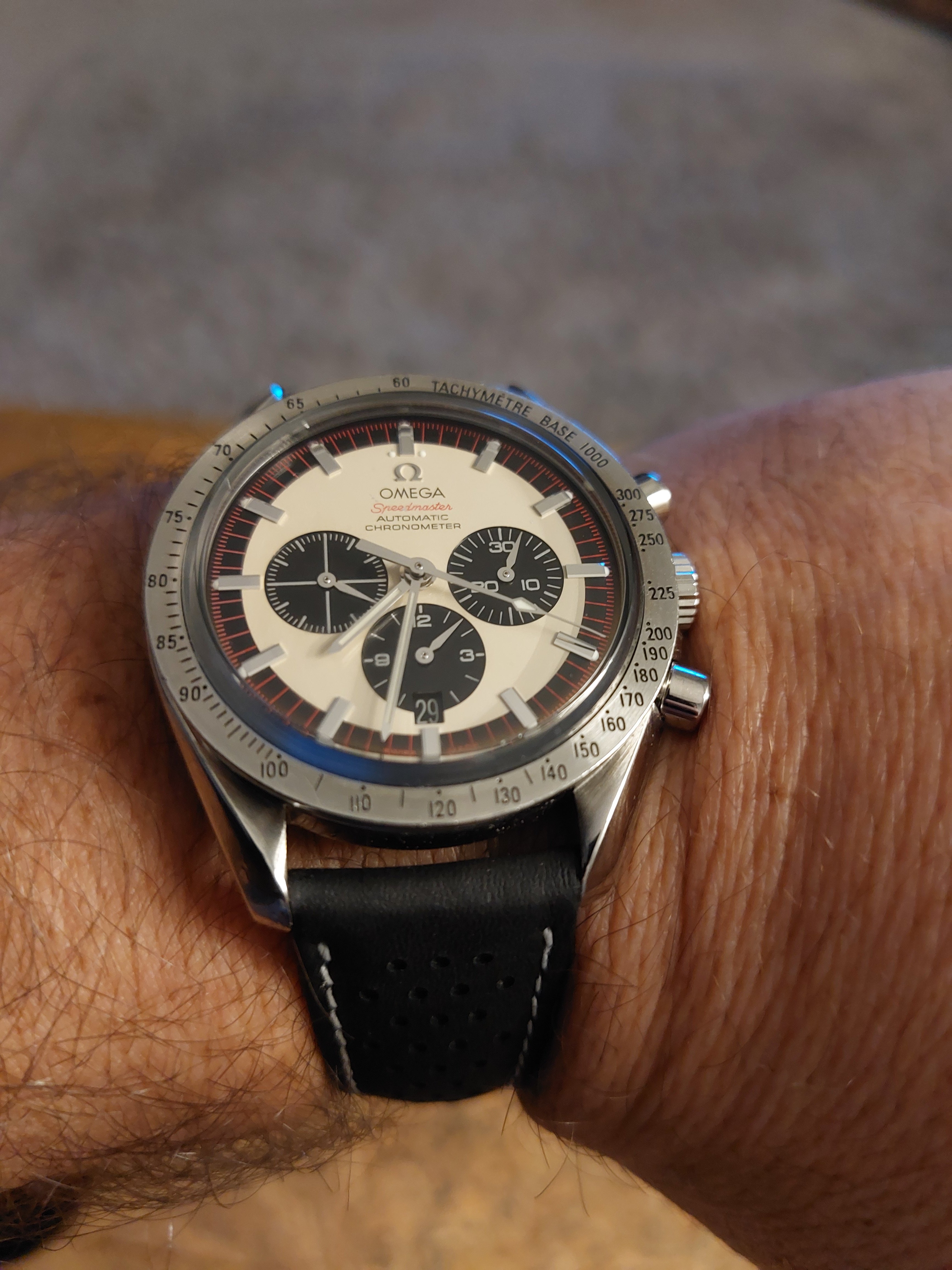 路I tried this watch on 2 years ago in a local jewellers. The jeweller is a friend of mine and I've bought several watches off him both omega and rolex. He has very little interest shown on the watch so 2 years later it was still there. I made him an offer and bought it but wasn't keen on the metal bracelet it was on so bought a racing strap in omega boutique and very pleased with the result. I wouldn't normally go for a limited edition but it's a beautiful watch and I think it looks great.