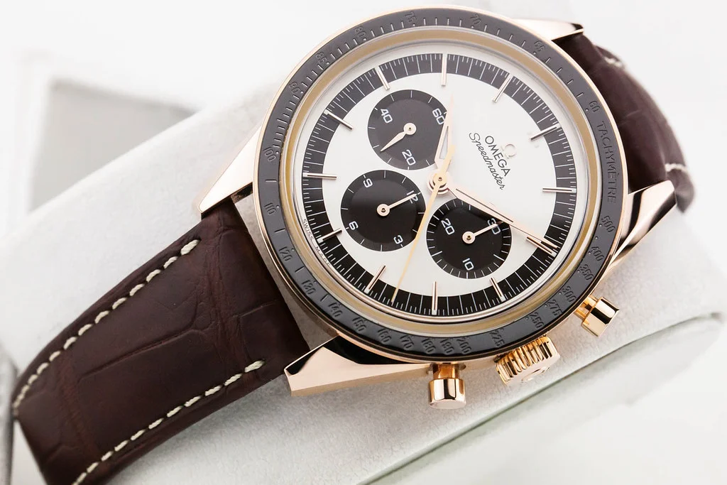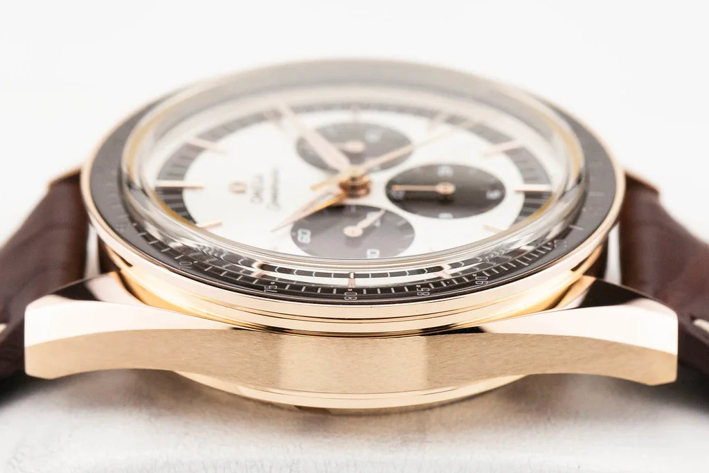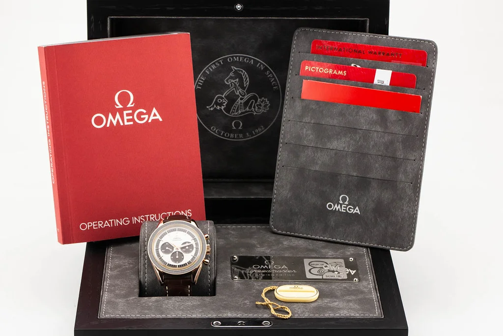 ·Up for sale is an excellent condition Omega Speedmaster Moonwatch First Omega In Space ( FOIS ) Numbered Edition in Sedna Gold 39.7mm Panda Dial on Leather Strap, reference # 311.63.40.30.02.001. It comes complete with all boxes, papers, booklets, hang tag and Omega Warranty Card dated March 2019.