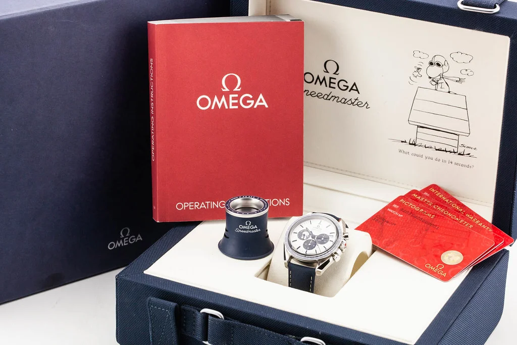 ·Up for sale is an excellent condition Omega Speedmaster Moonwatch Silver Snoopy Award 50th Anniversary, reference # 310.32.42.50.02.001. It comes with all boxes, papers, booklets, loupe tool, and Omega Warranty Card dated November 2021.