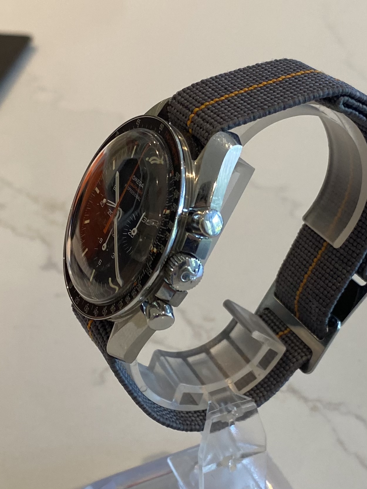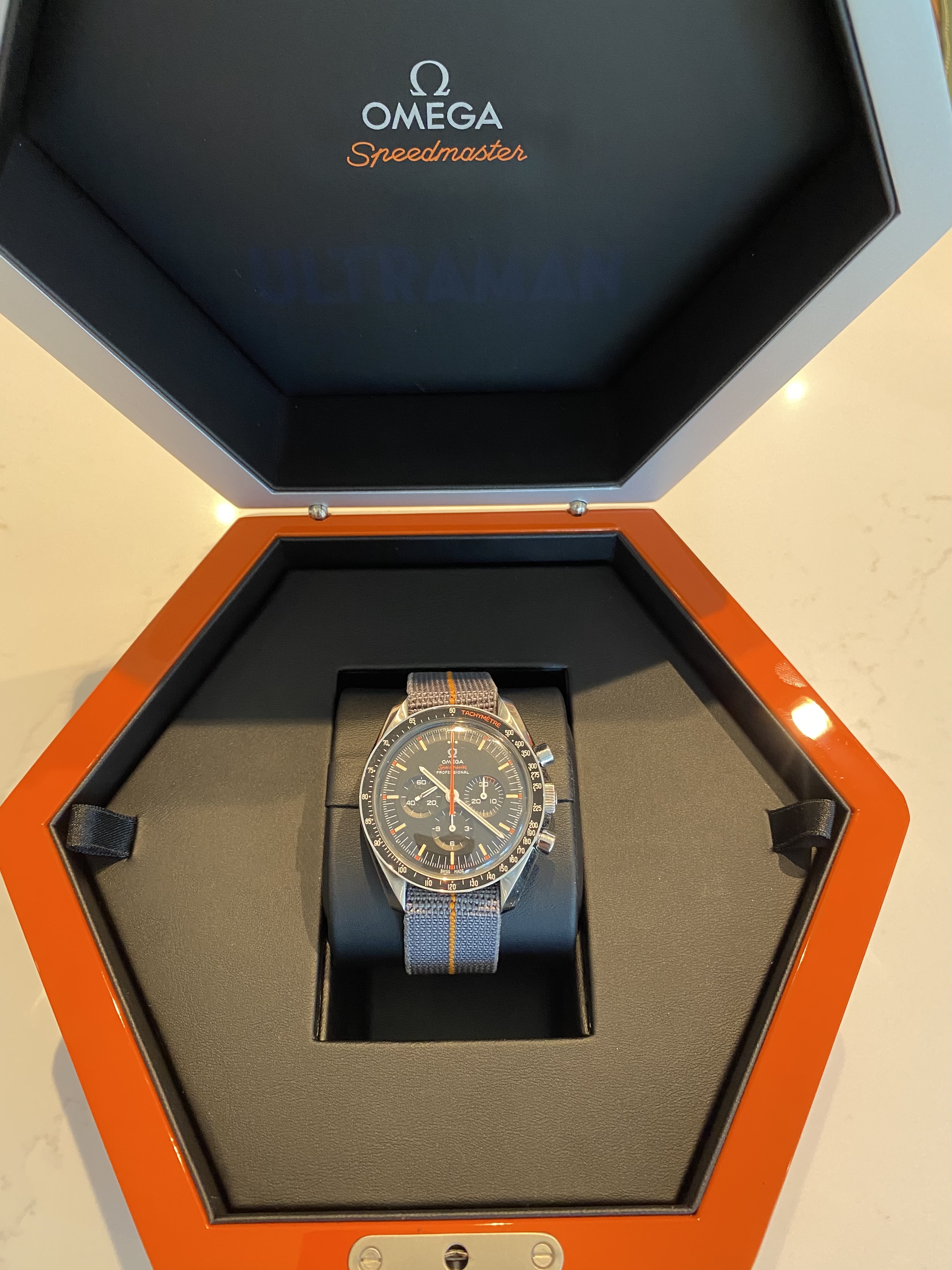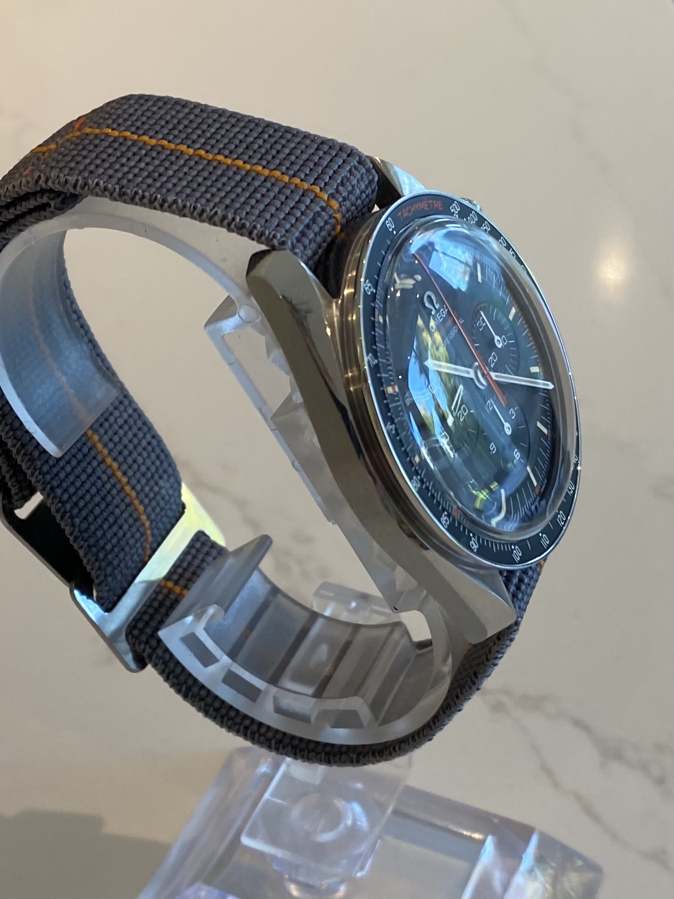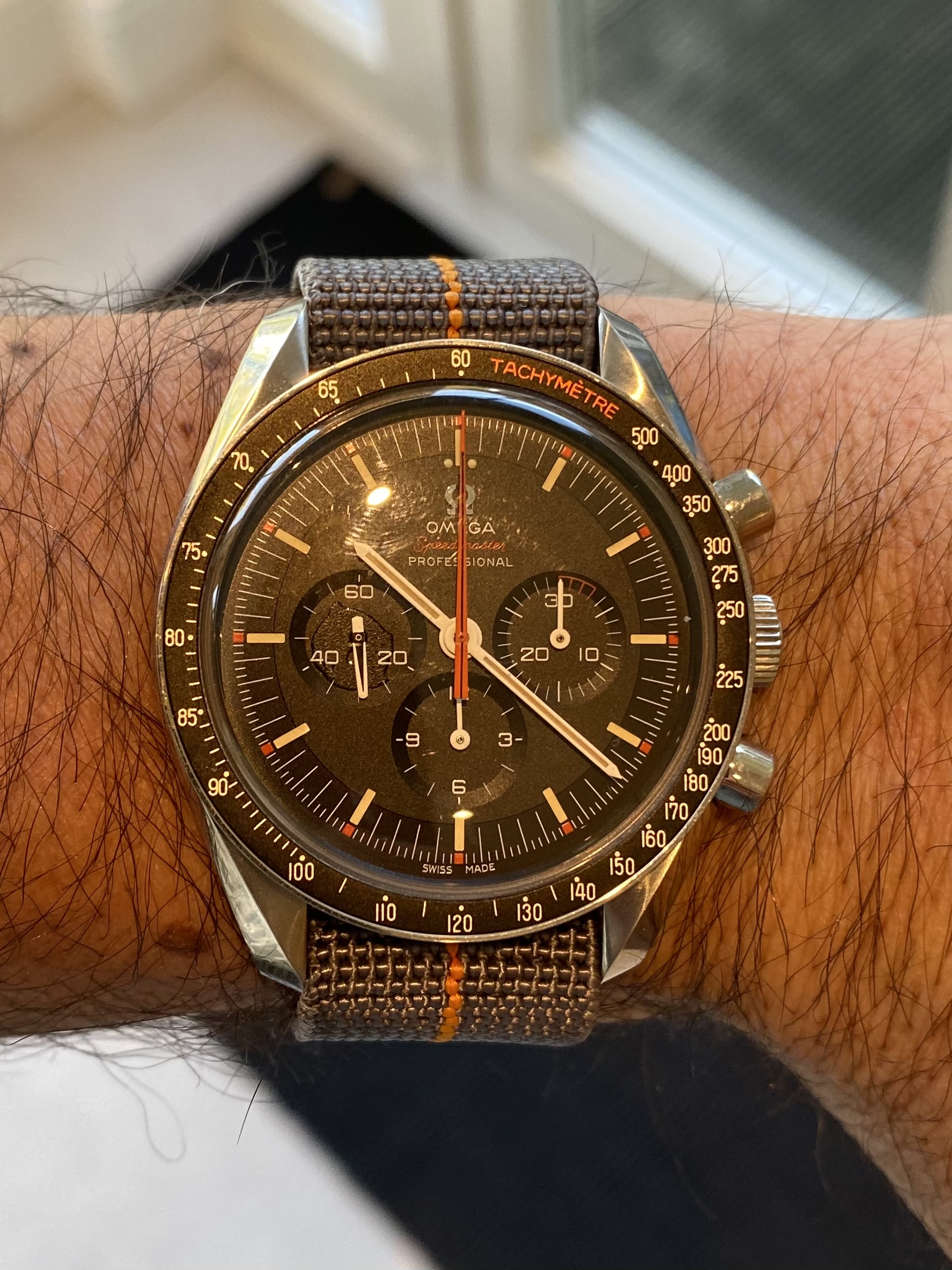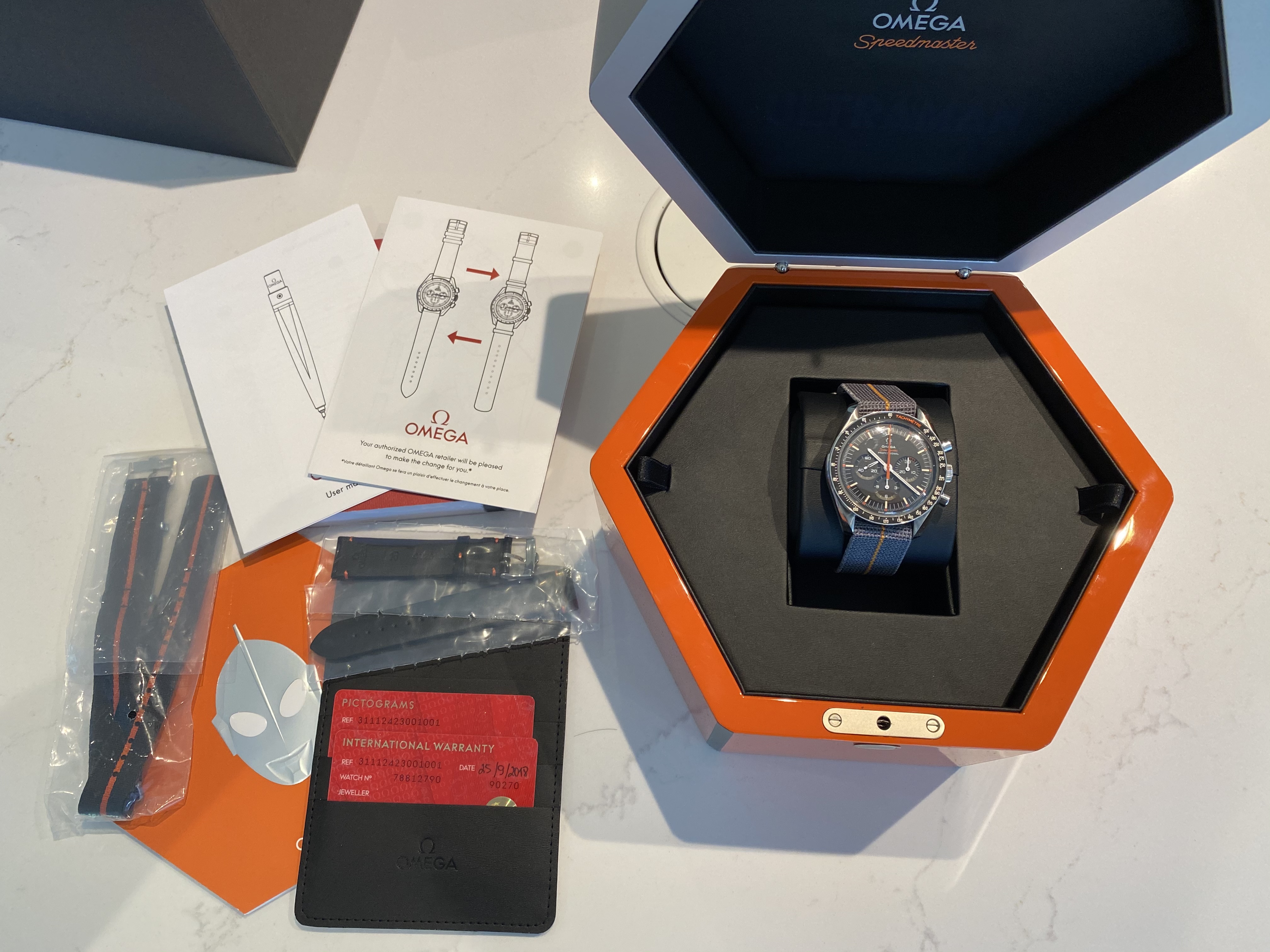 The watch has been worn perhaps a dozen times and only on a 3rd party Nato or the very attractive grey & orange Erika's Originals MN strap (pictured & included in the sale). The watch looks like new and I can't see any scratches or blemishes at all. The original Nato & black leather straps are untouched and remain in their protective packaging.