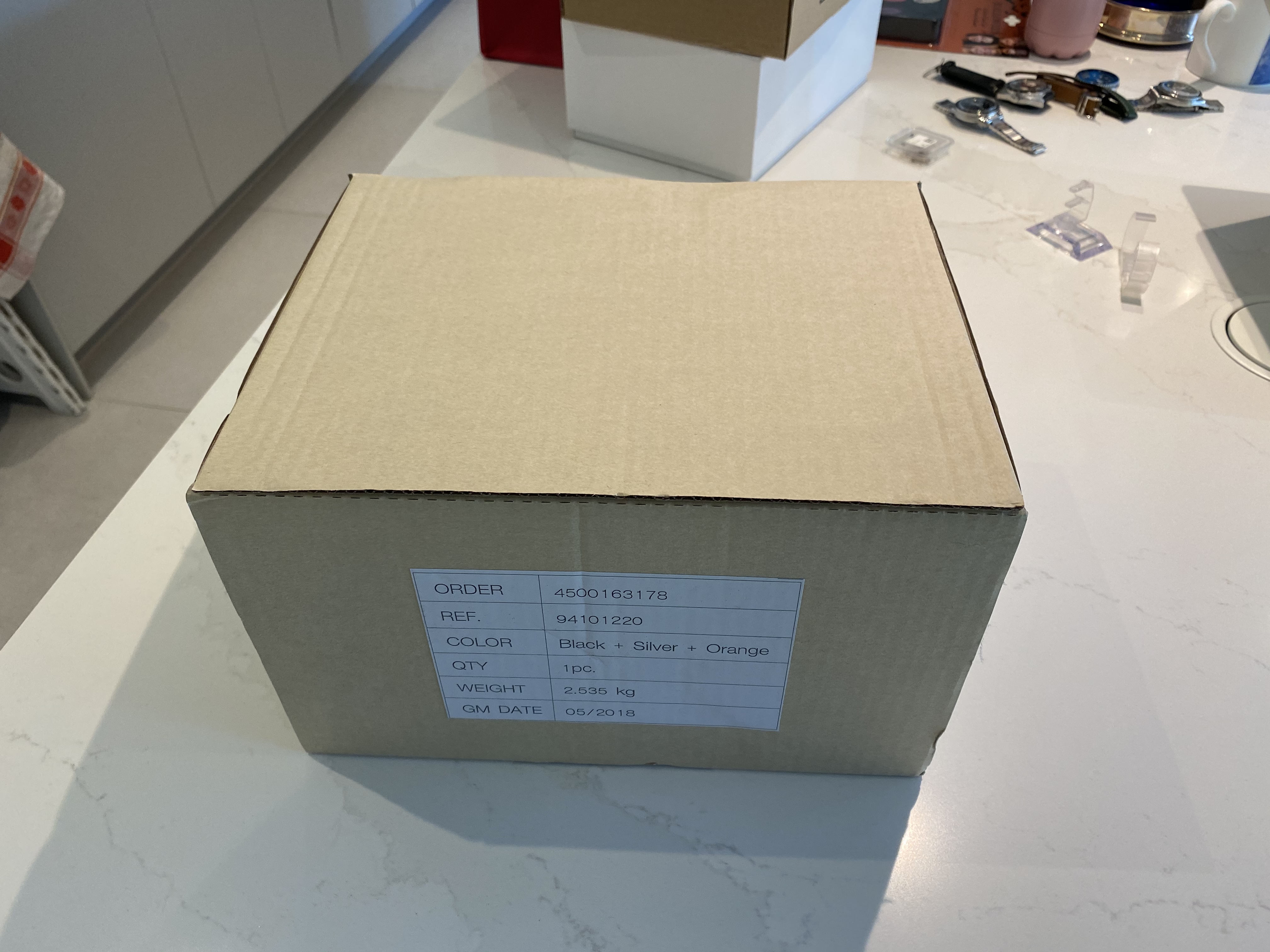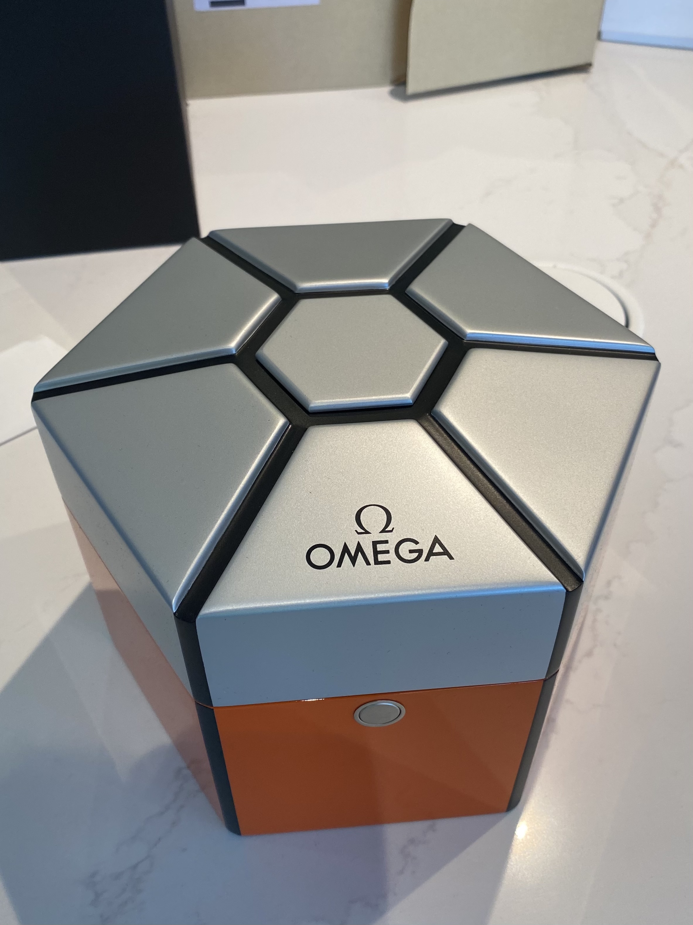 * Inner orange/grey box, outer black box & "outer outer" cardboard box