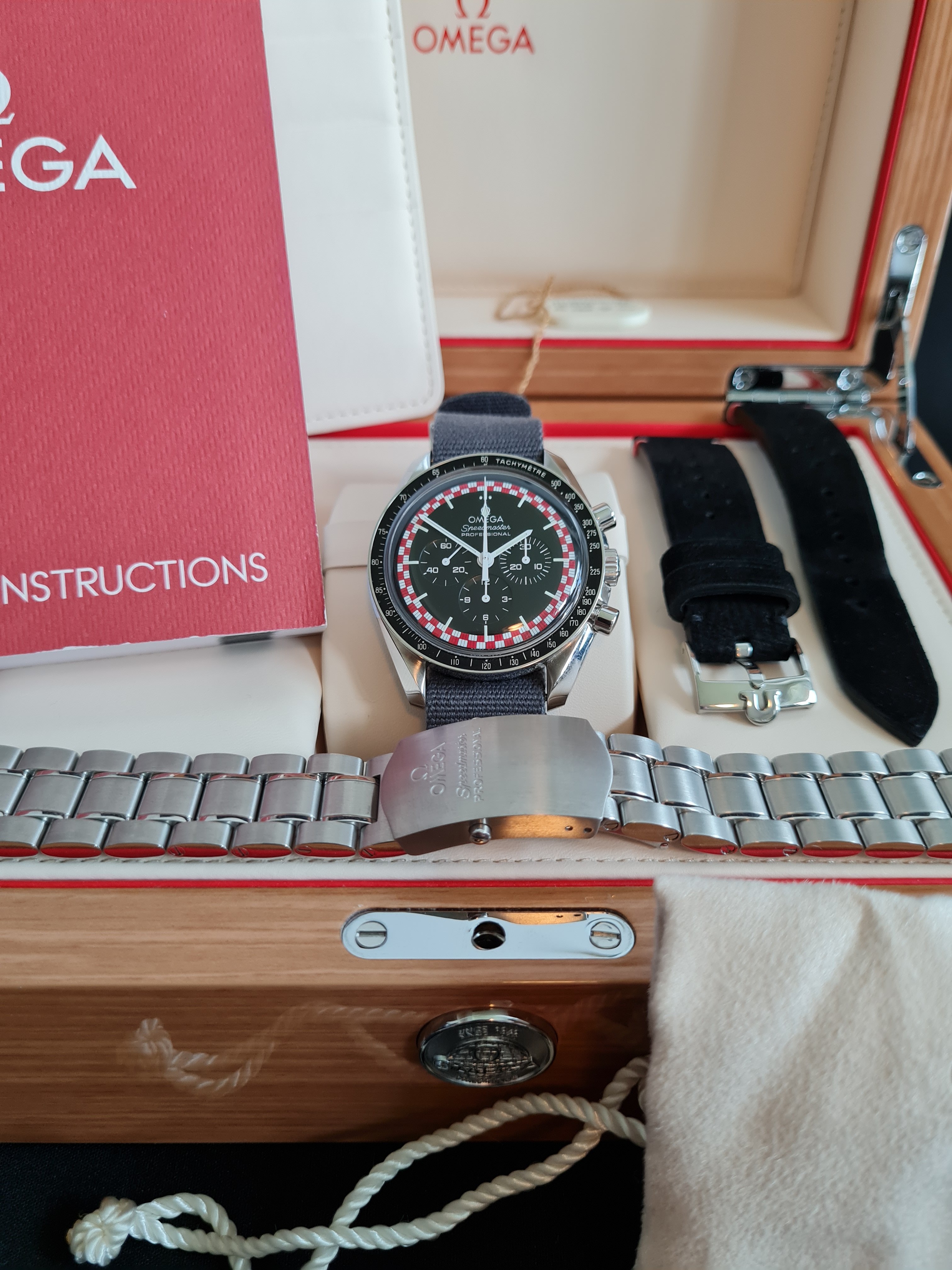 The full set on offer included: the watch, original steel bracelet, original Omega Nato strap, custom made black suede strap, original wooden Omega box, price hang tag, instructions, cards and a beige sachet. One remark - the card is unstamped and it was like that when I bought it, but everything os OK because I checked the serial in Omega Boutique and it is a genuine, original Tin Tin.