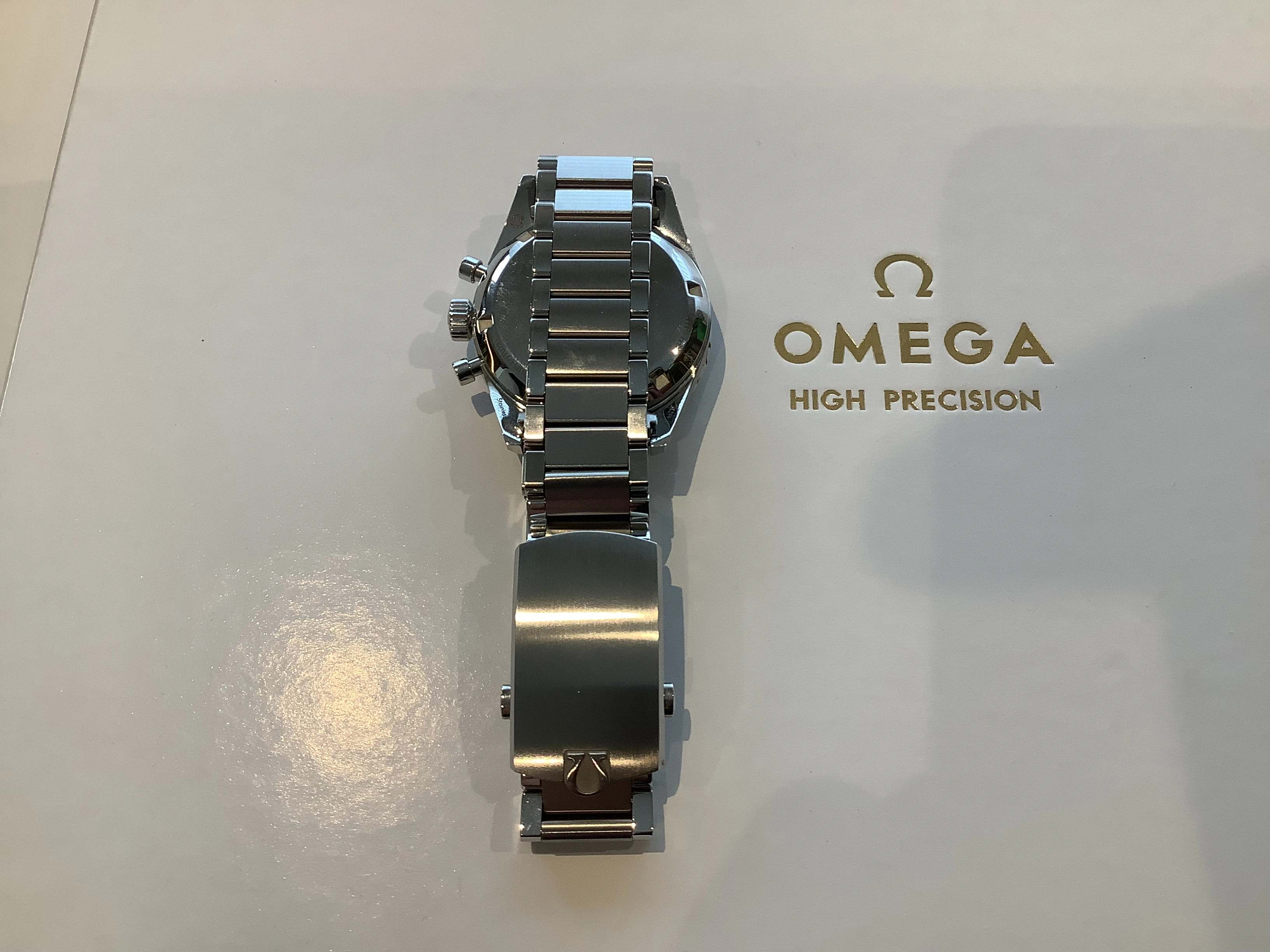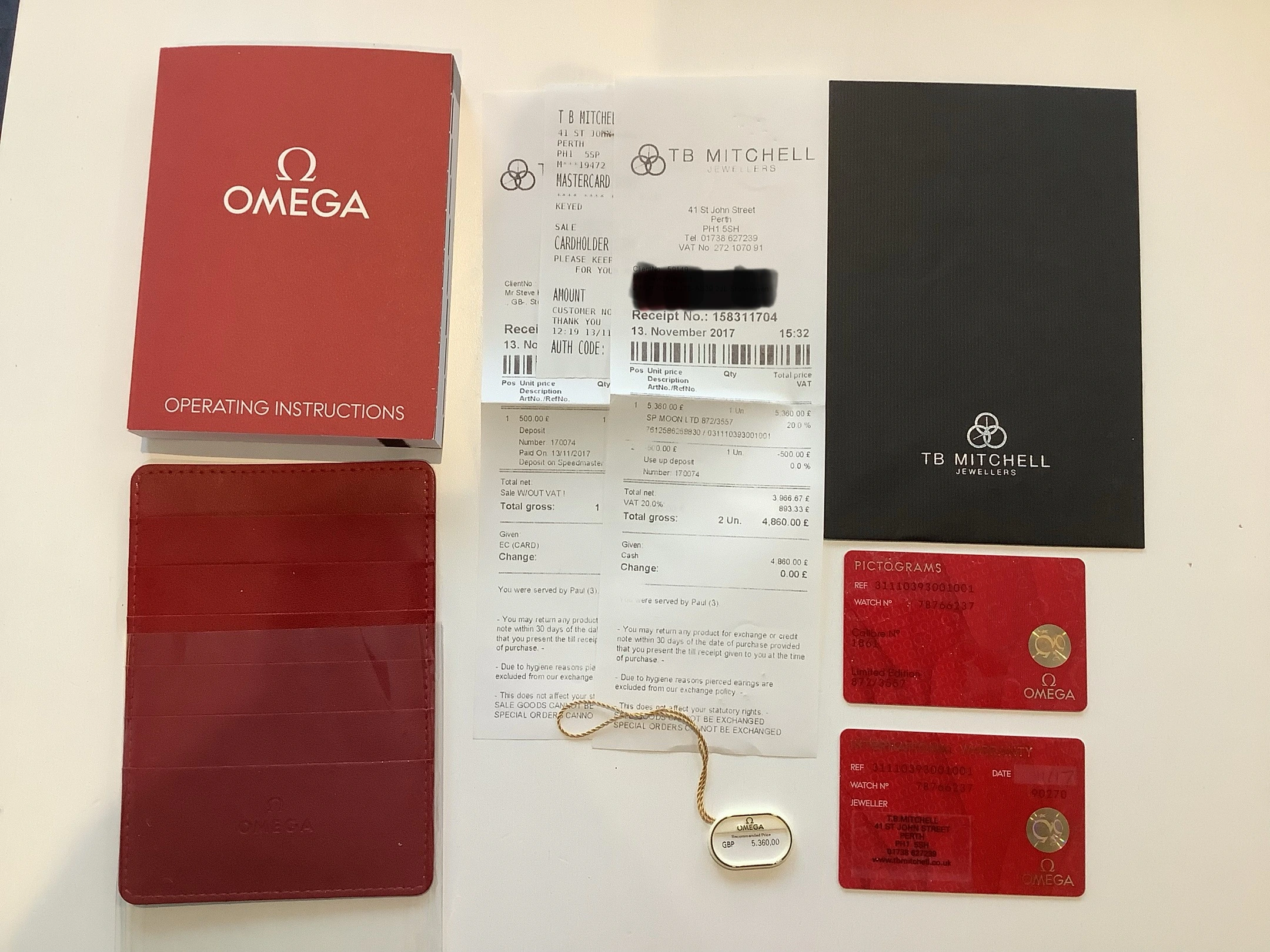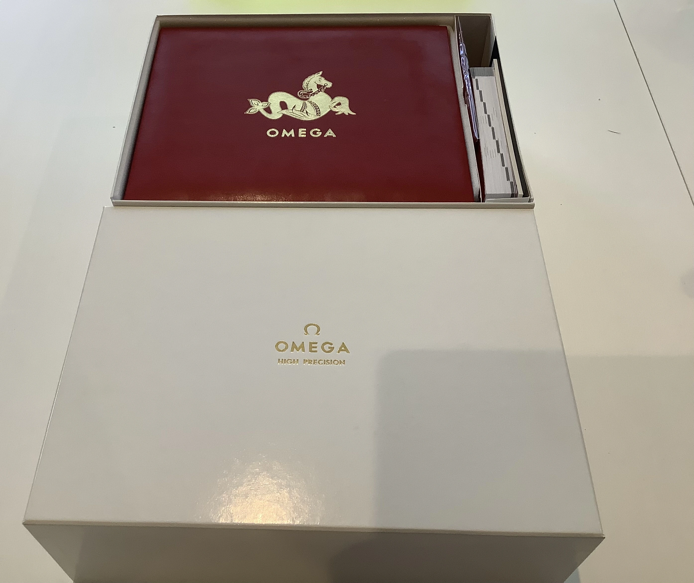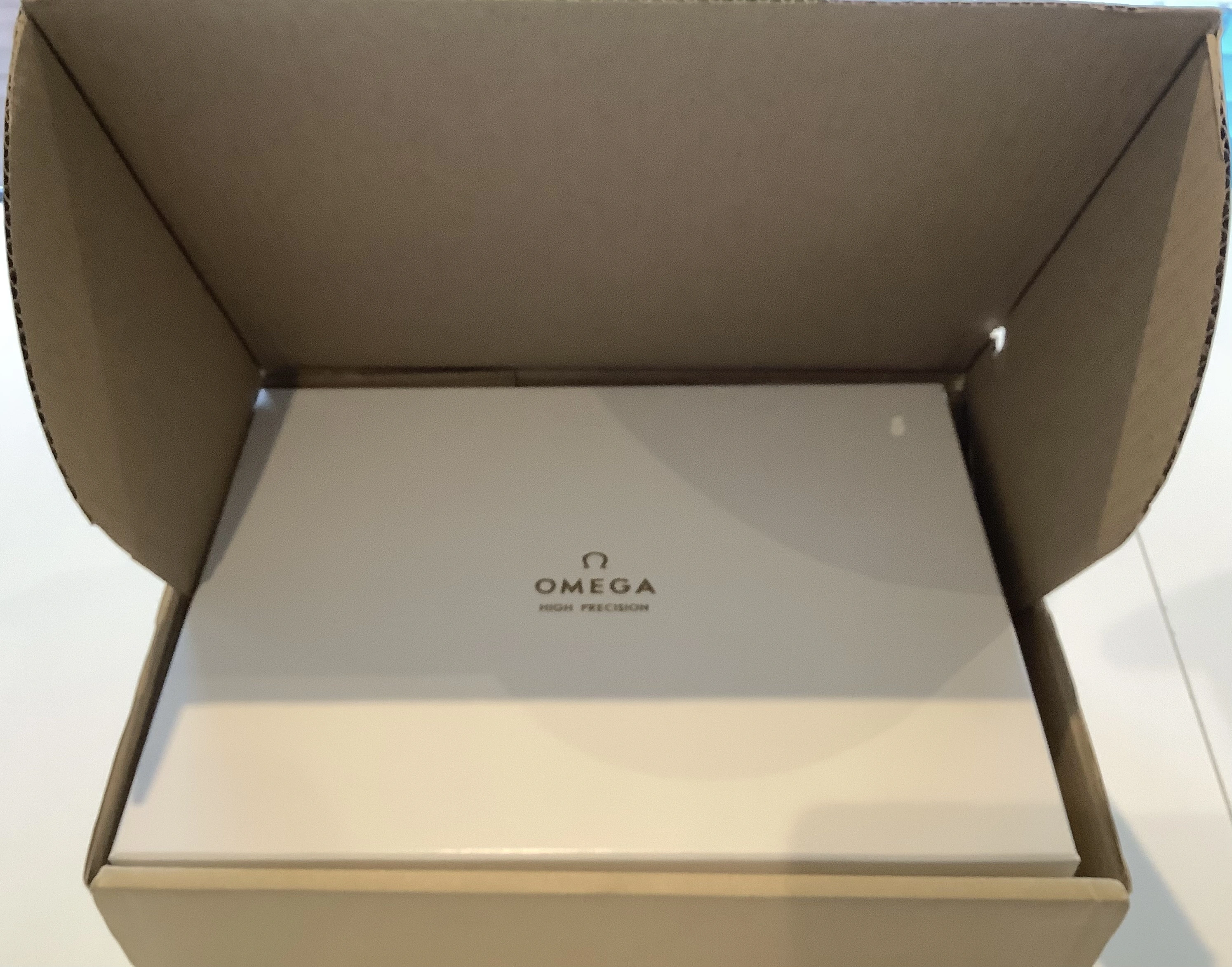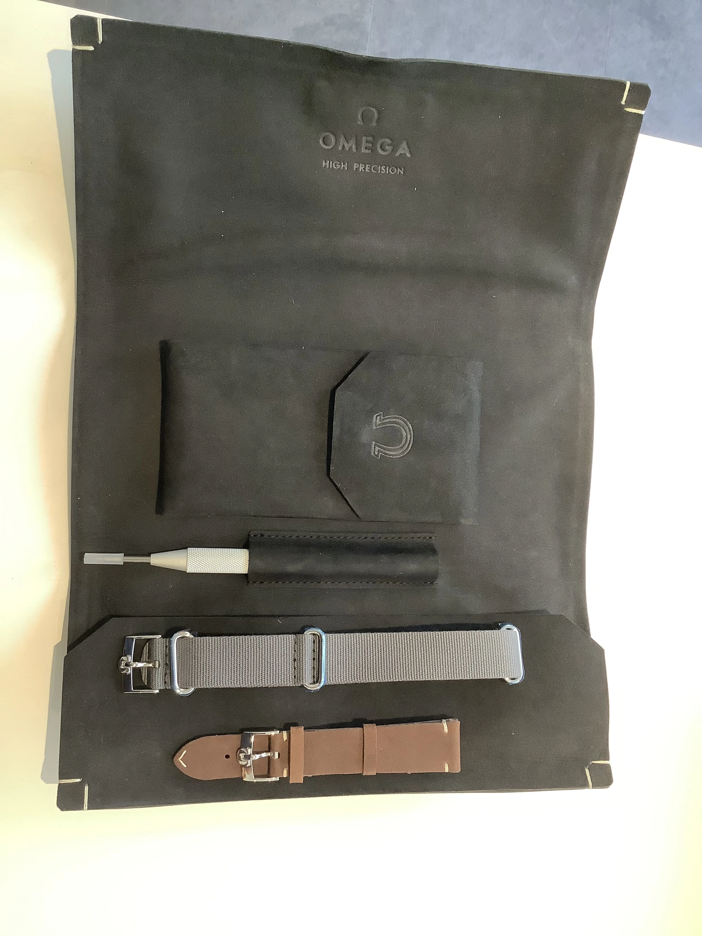 This watch is being sold with its original Omega special box, travel case, swing tag, swing bar removal tool and paperwork, along with all of its accompanying straps. The included 19mm Omega stainless steel flat link bracelet features polished outer links and brushed inner links, secured by screws and fitted with a push button-release folding clasp, with all links included. Additionally, two extra 19mm Omega straps are included in the box. This watch is sold as unworn and is a full set including the outer box.Asking price £5360