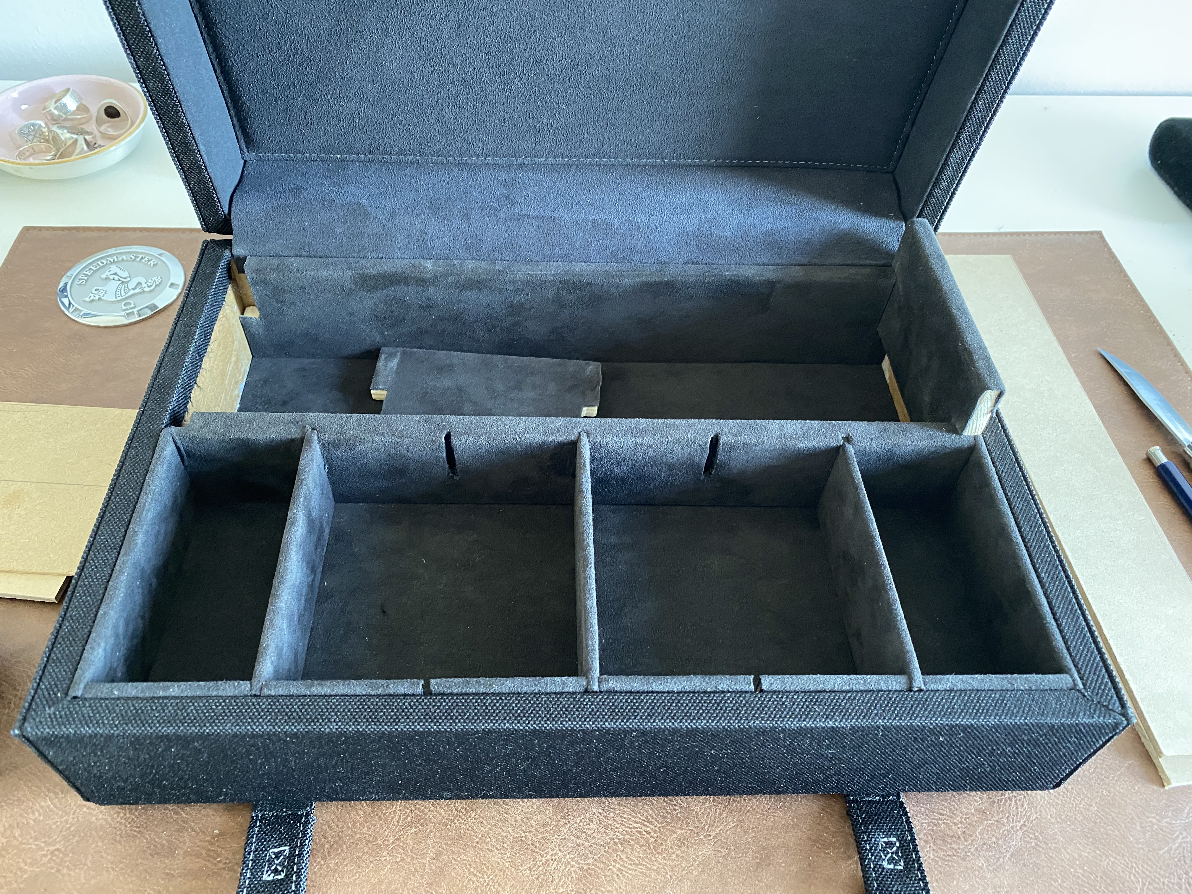 I used mdf wood panels which I cut up and then I wrapped in Charcoal Alcantara, which isn't an exact match with the grey omega previously used, but I think the colour works well. The box isn't perfect. This is the first time i've attempted anything like this, and there are flaws, but i'm pretty pleased with the overall result and thought I would post on here to get your guy's opinions.