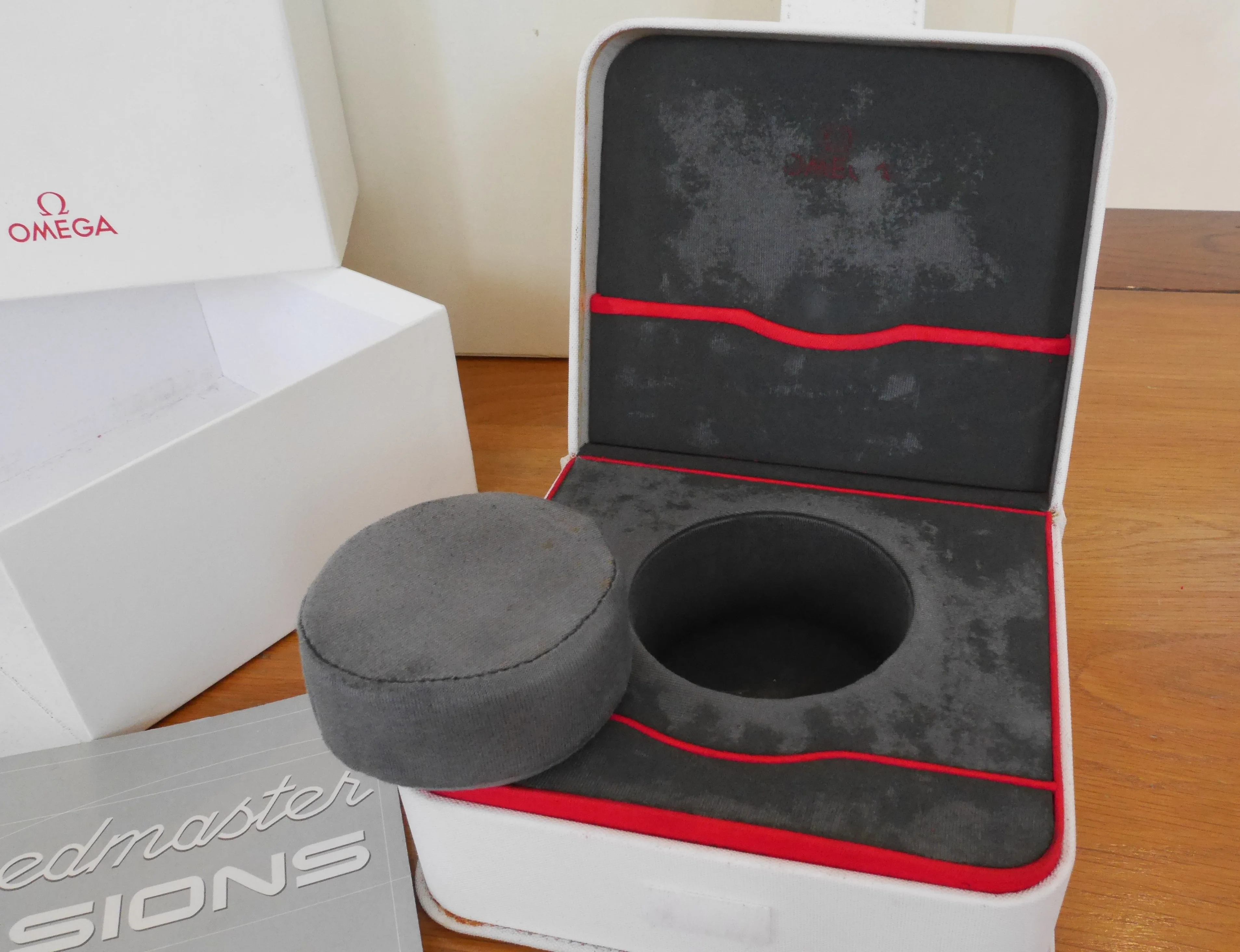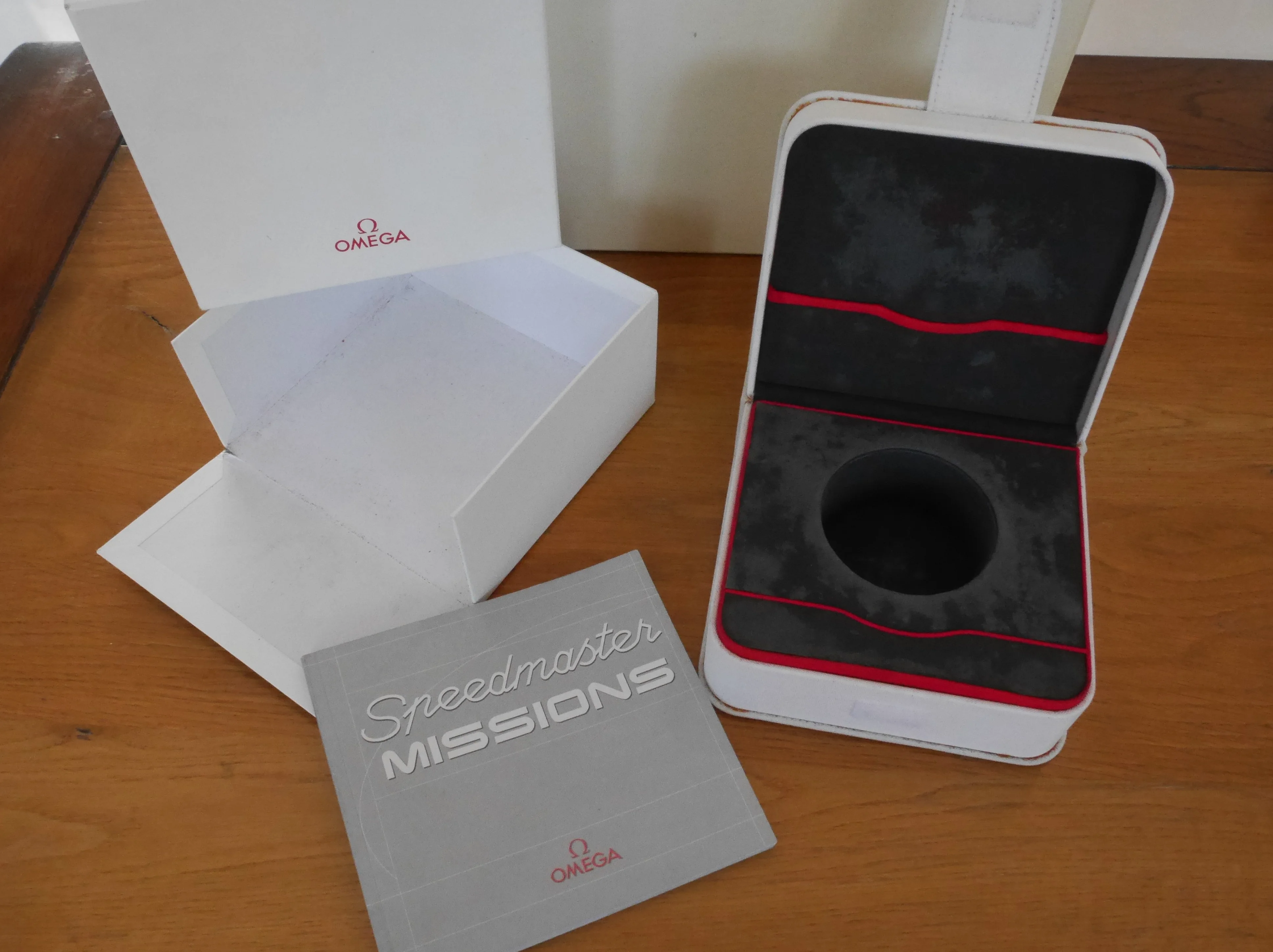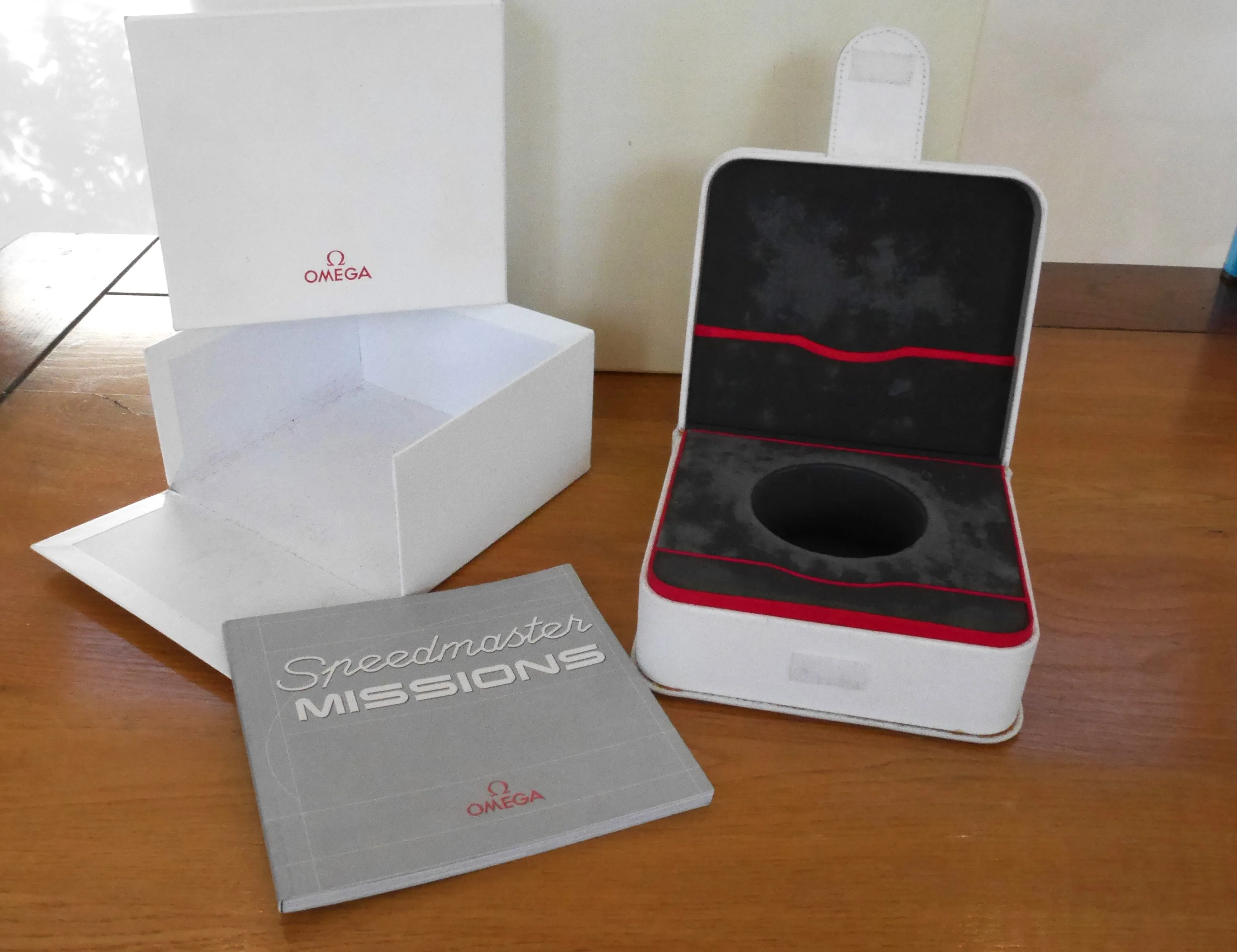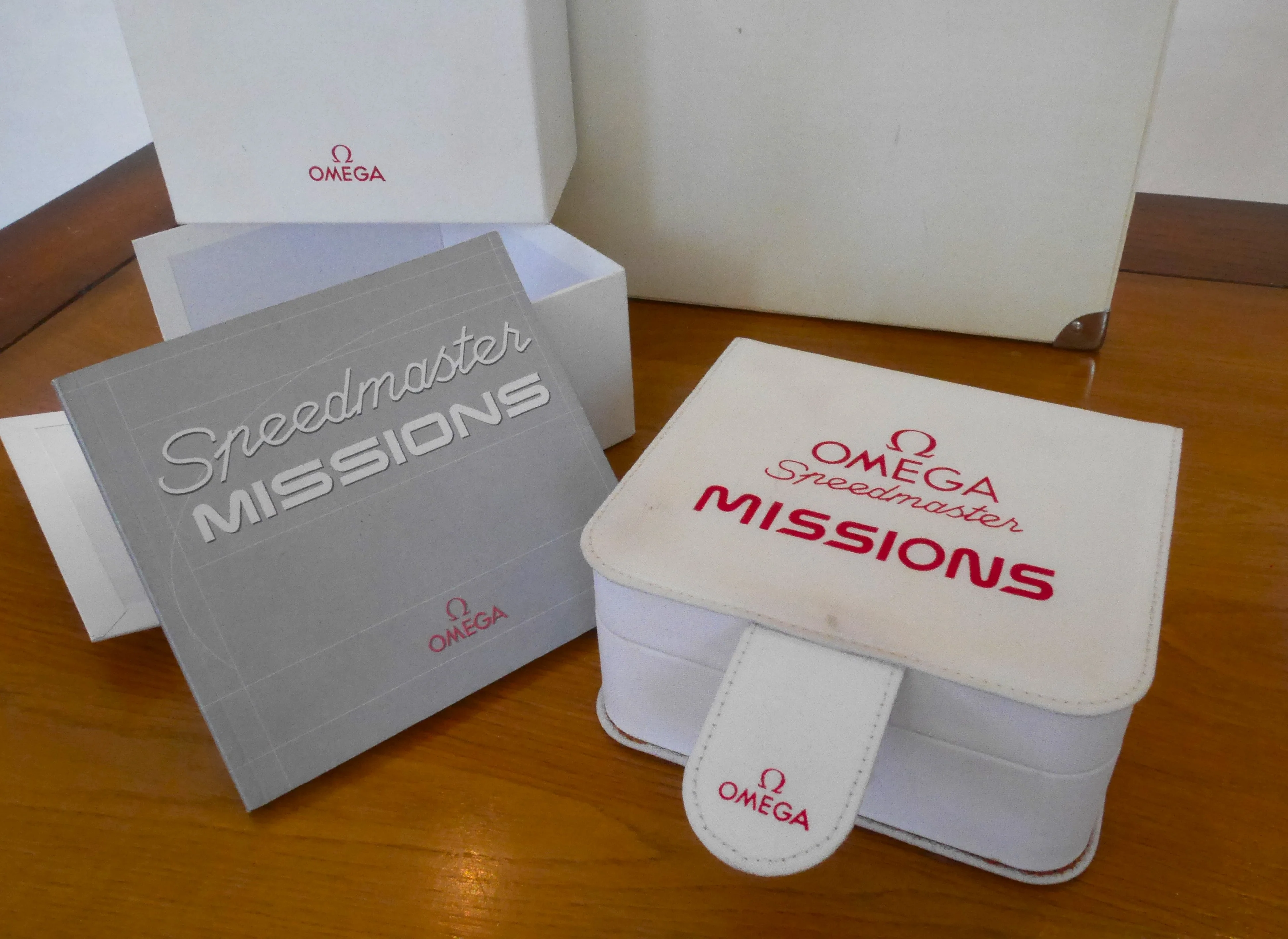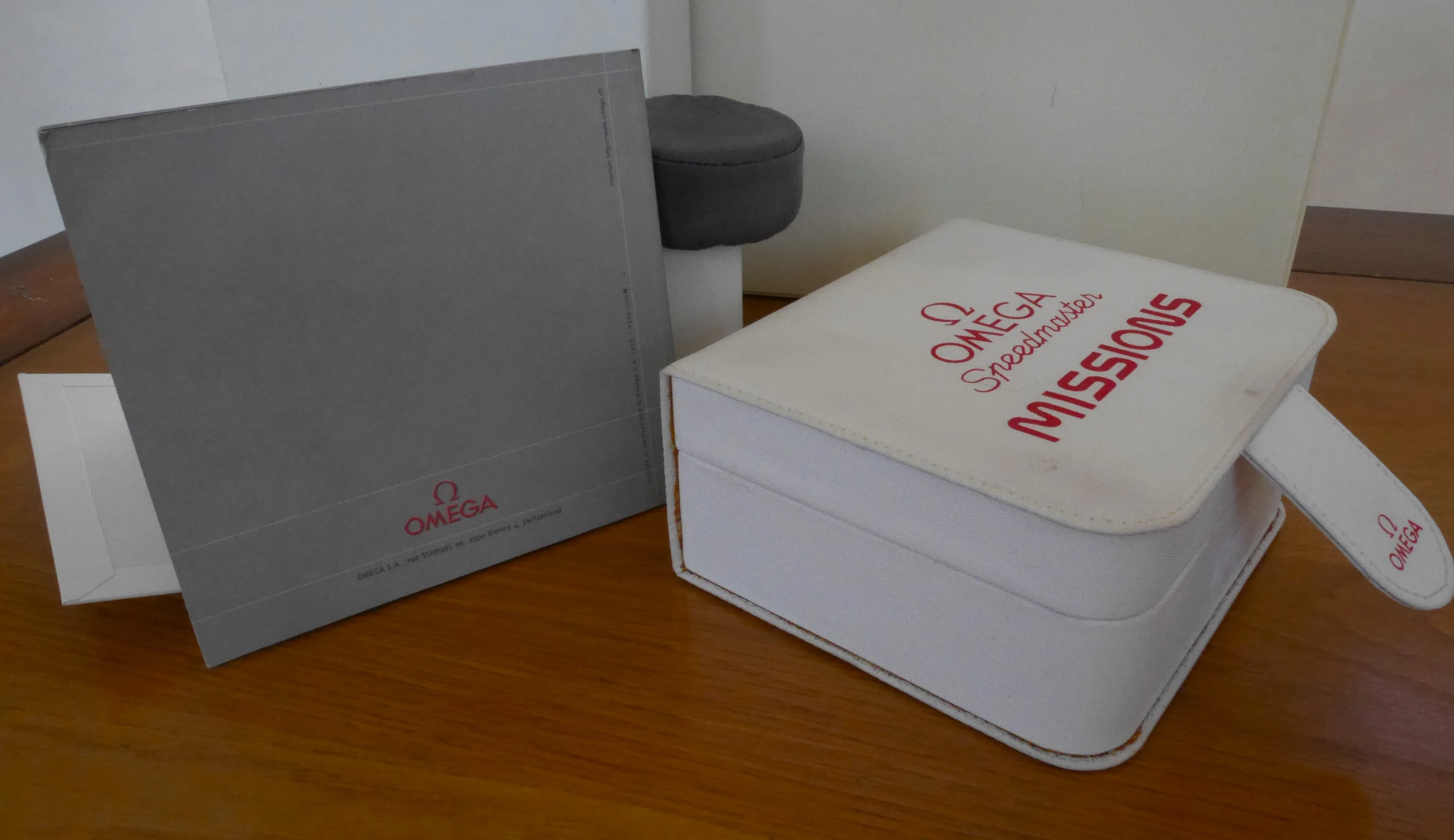 White fabric material box and outer box for a Speedmaster from the Missions patch series.