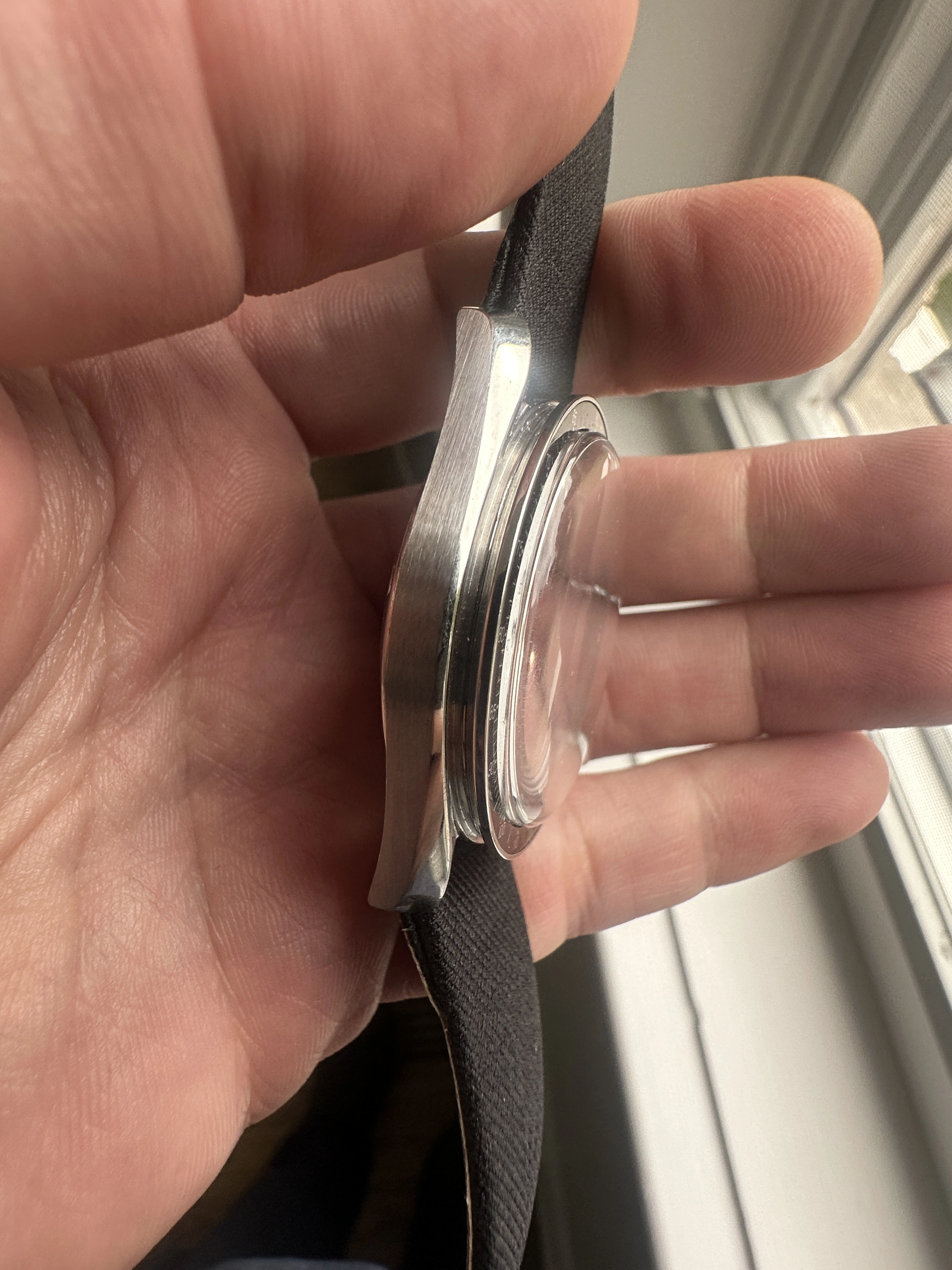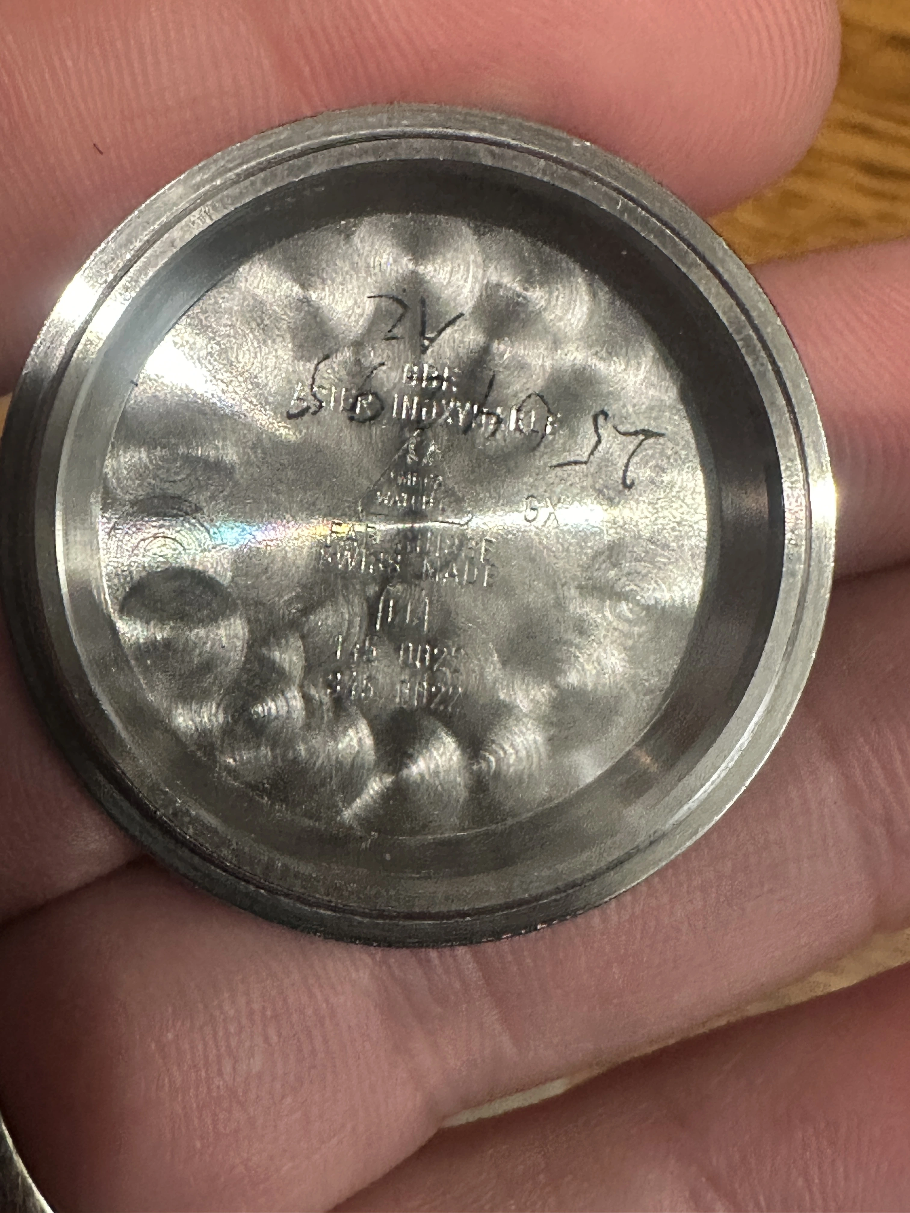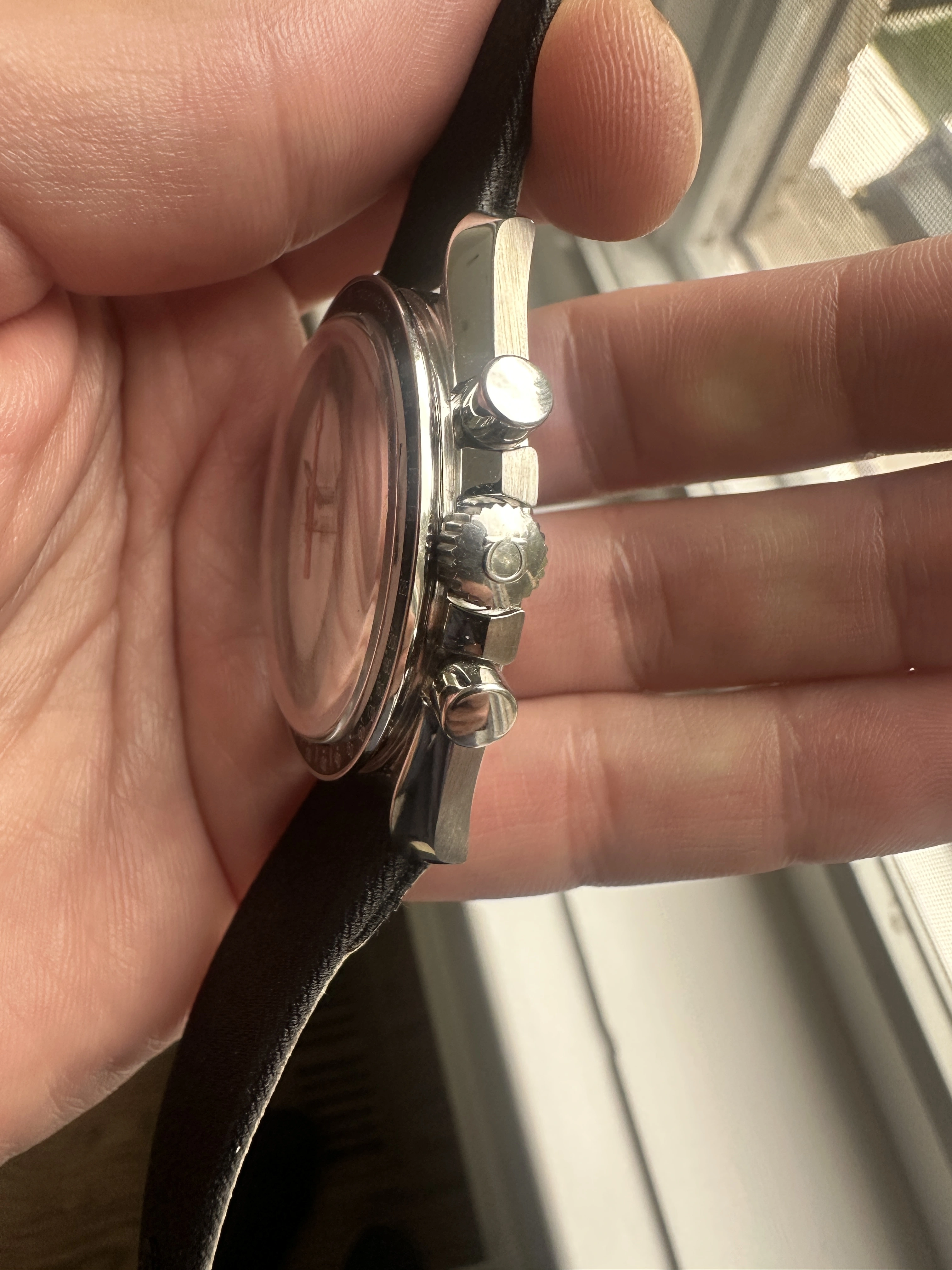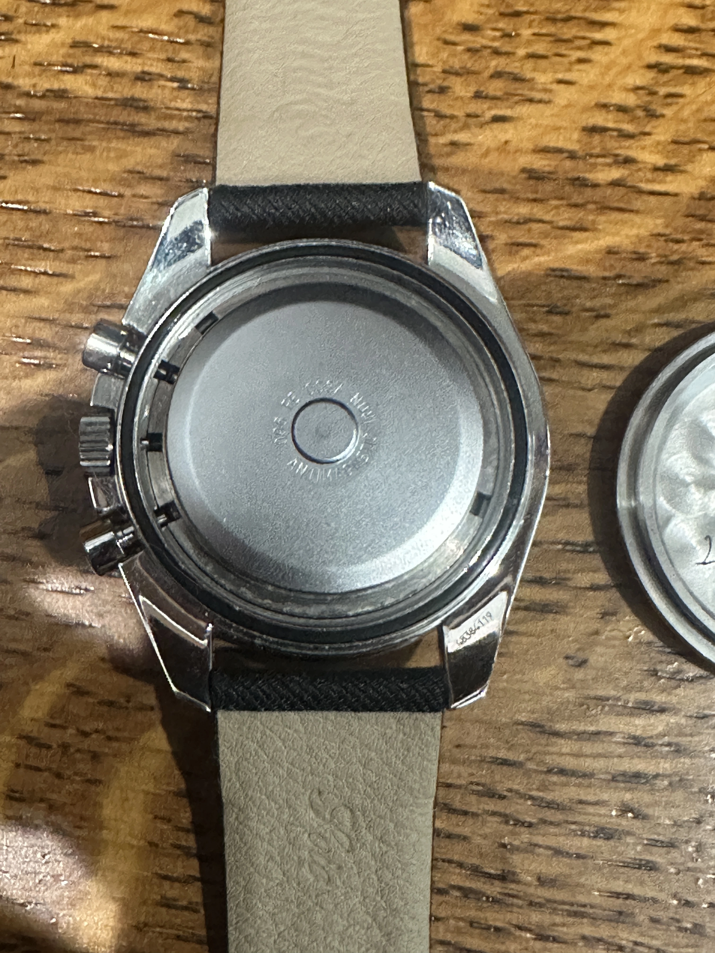 Case - Service case that has been worn, so it shows scratches and marks as pictured. The bezel is an Omega service part.