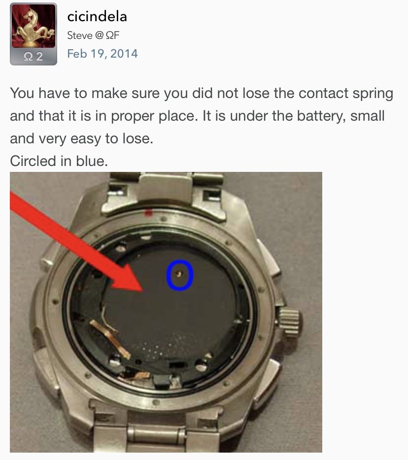 ·Hi, I left my Speedmaster X-33 (gen1) with my local watchmaker to replace the battery but he’s lost the contact spring that’s sits below the battery.