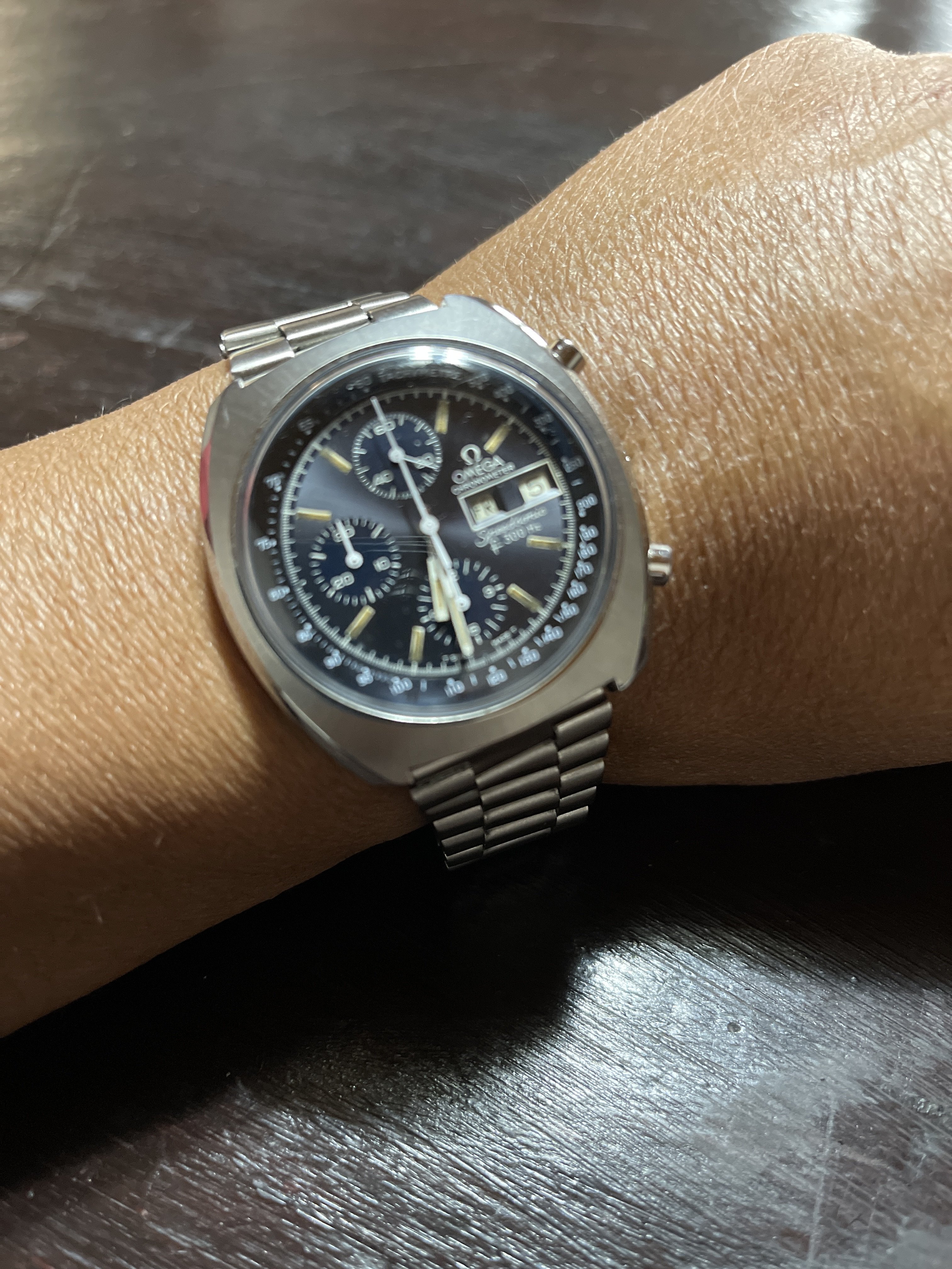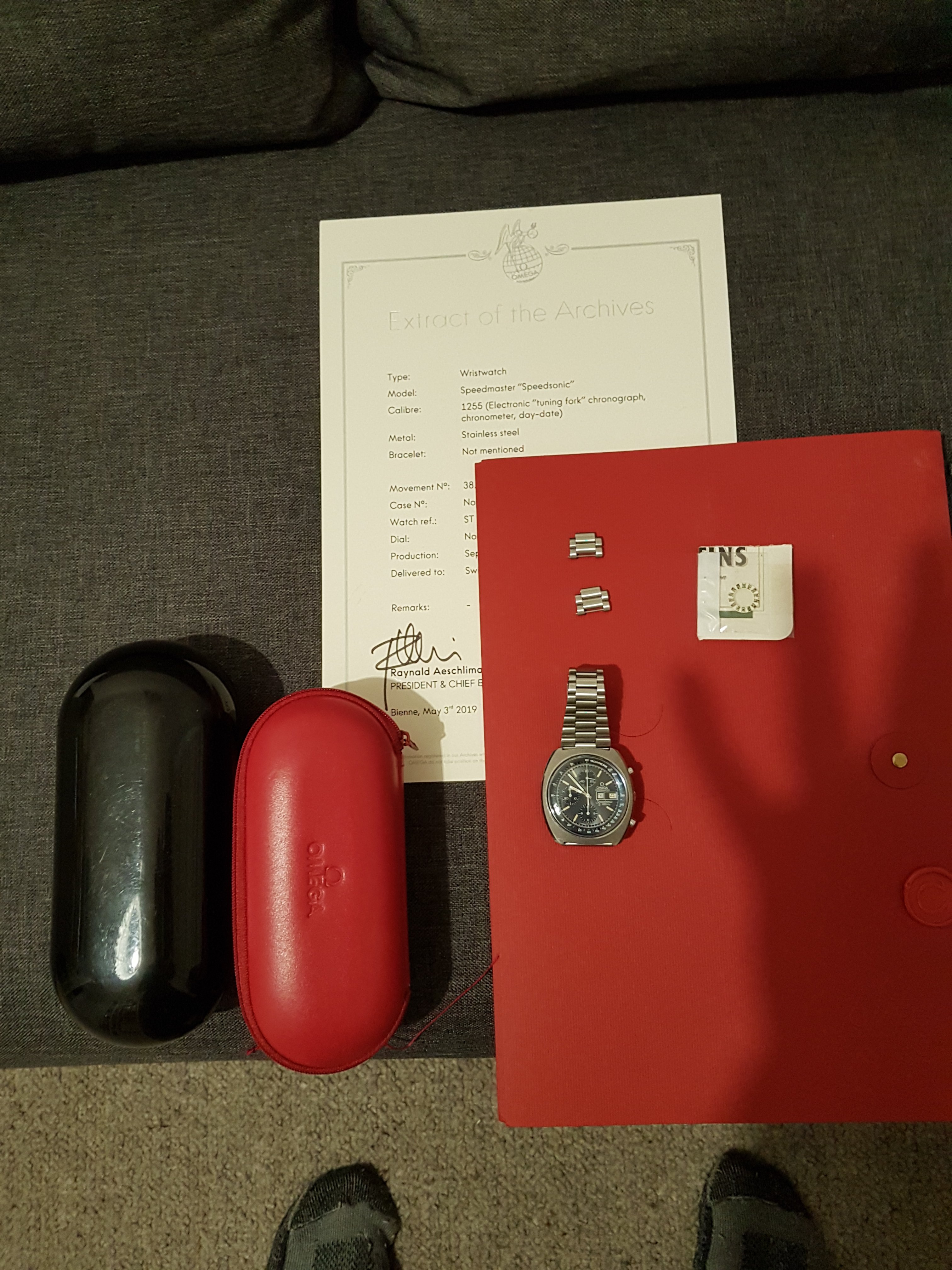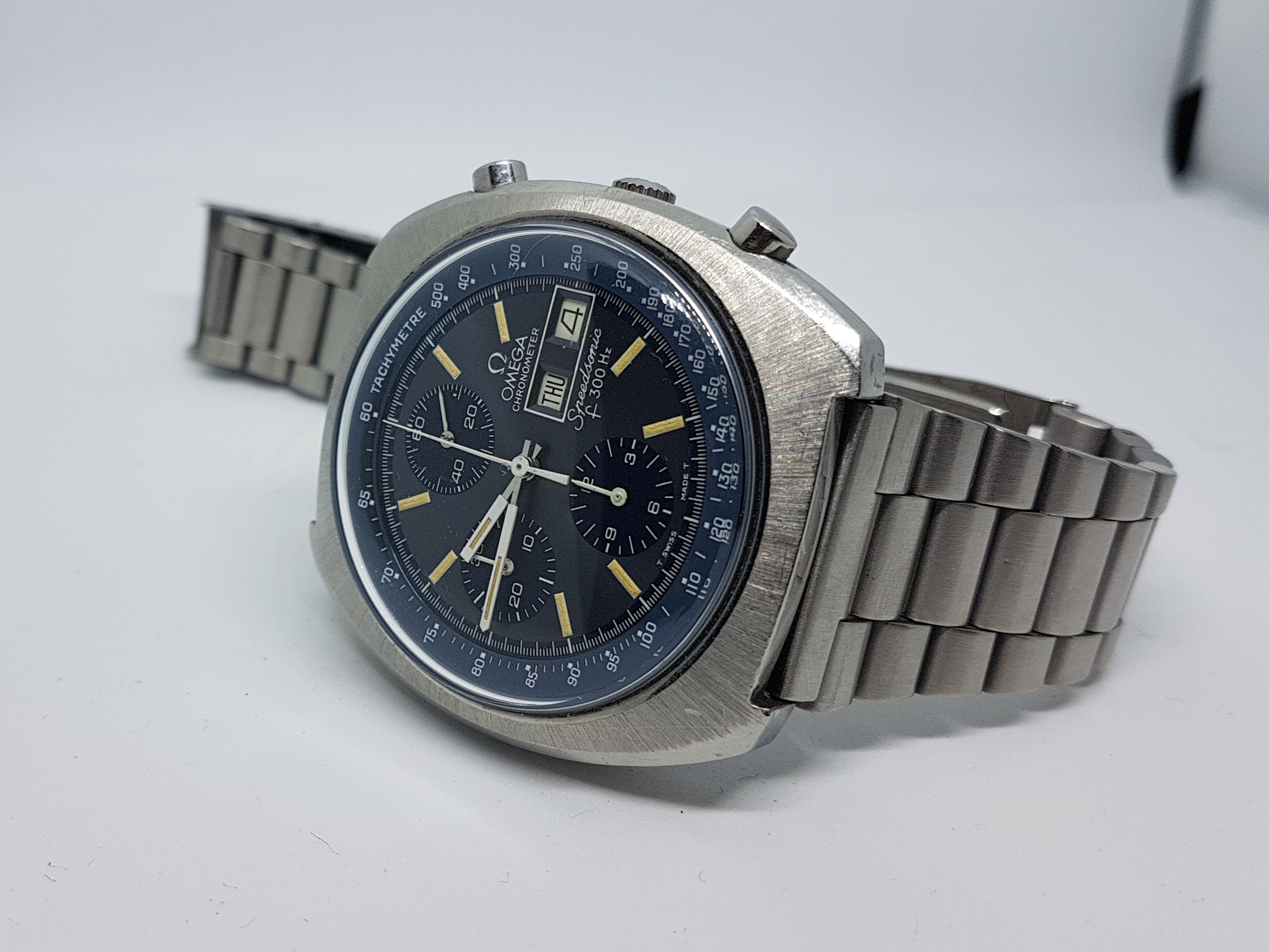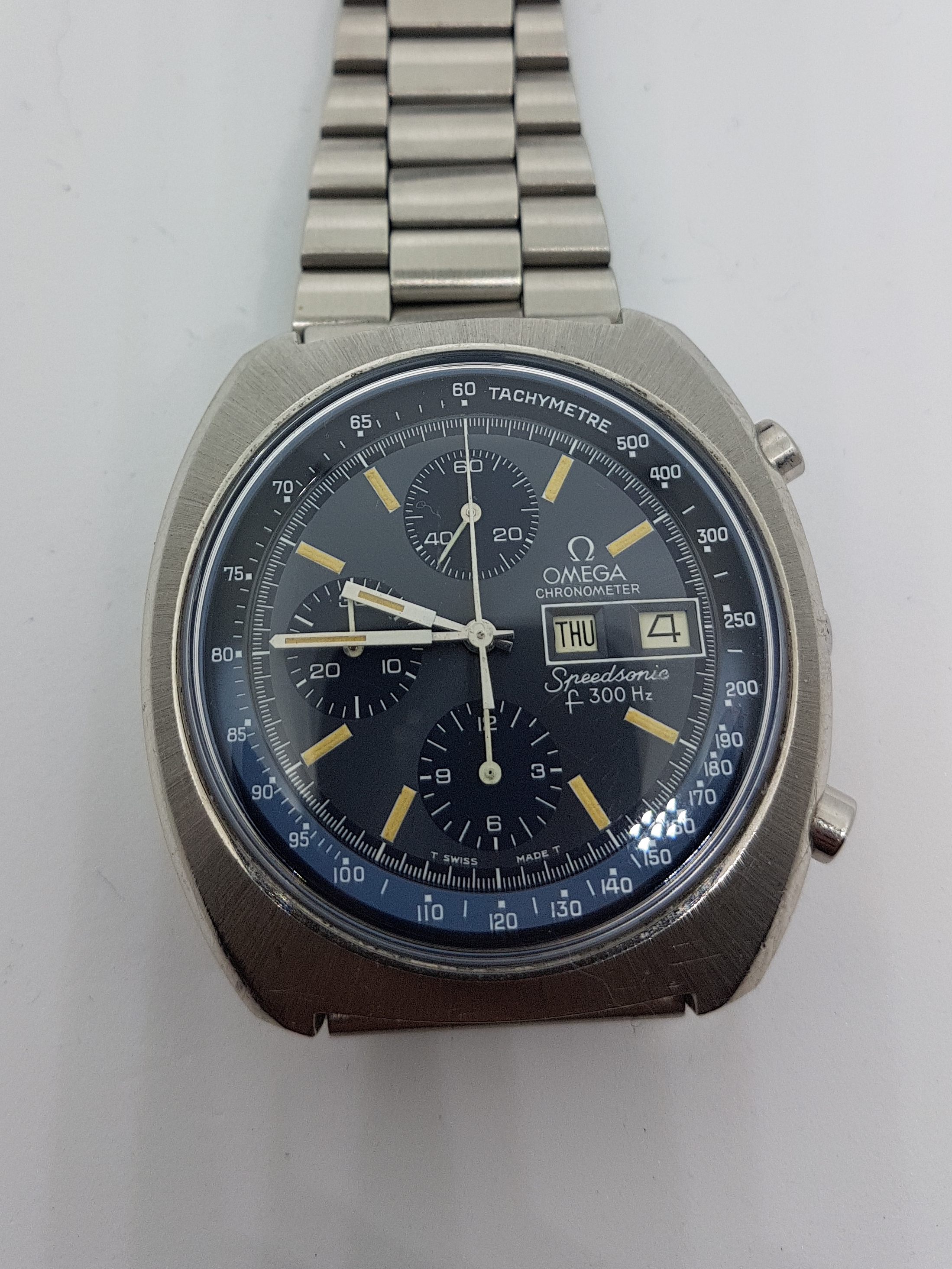 ·A reluctant sale because it took me a long time to find a good, unmolested example of this fabulous cushion shaped watch, this is the Omega Speedsonic chronograph complete with Omega archive extract to confirm authenticity.