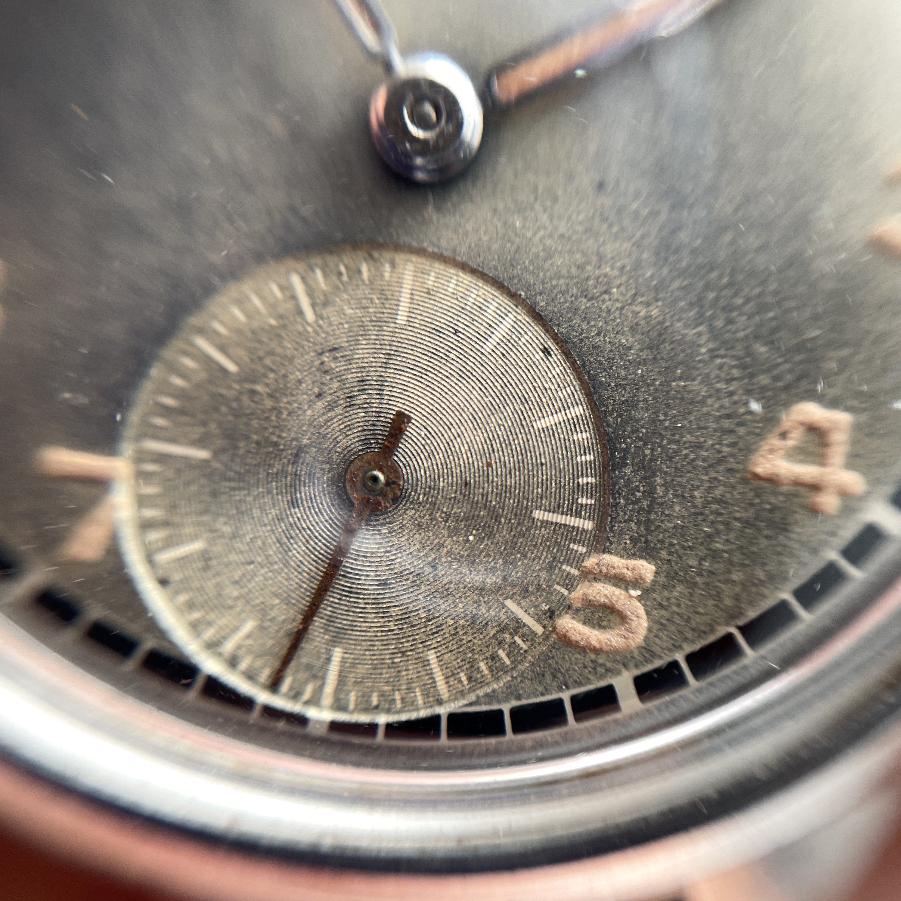 This has an uncommon grey dial with black contrasting railroad track with beautiful puffy aged lume.