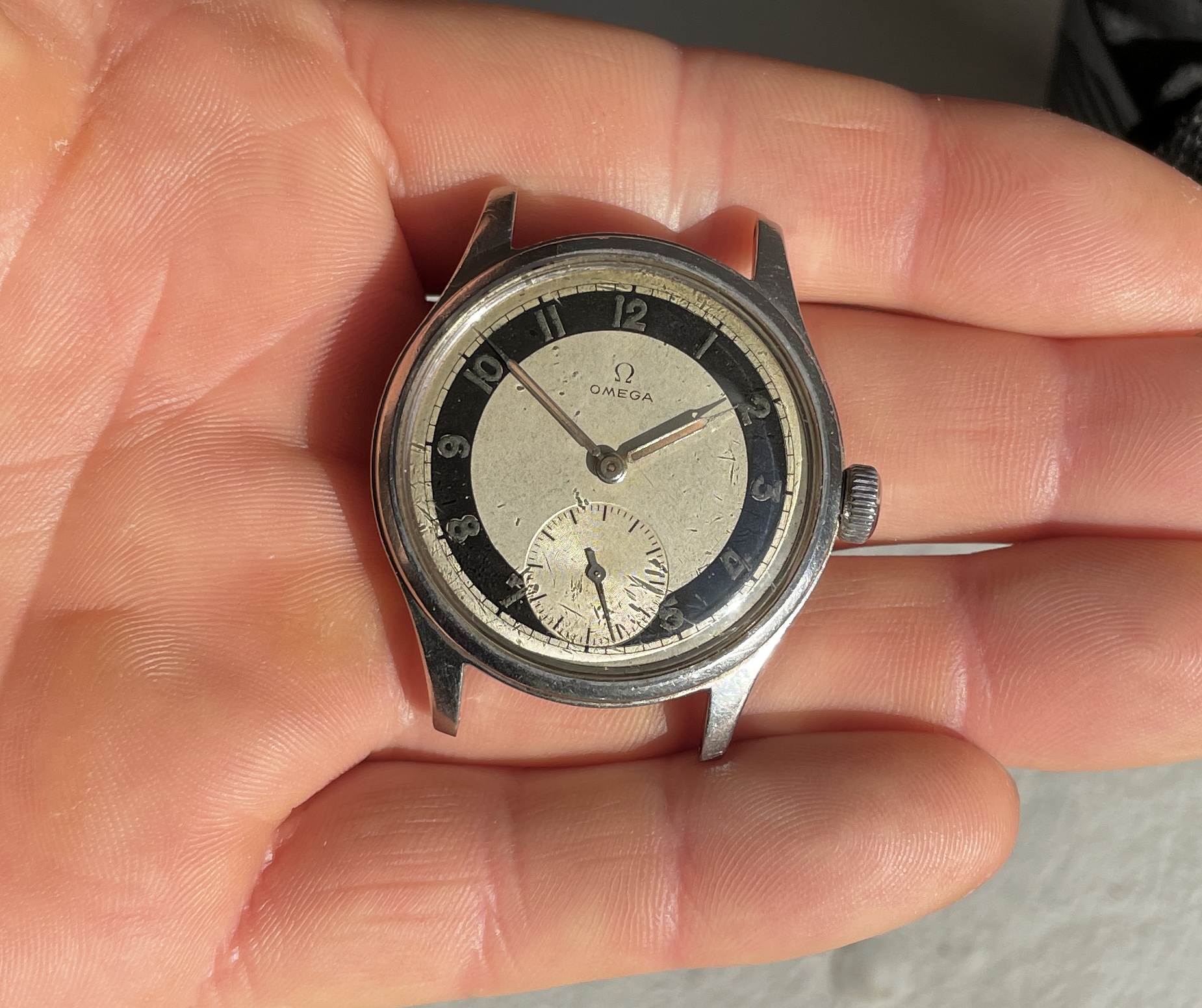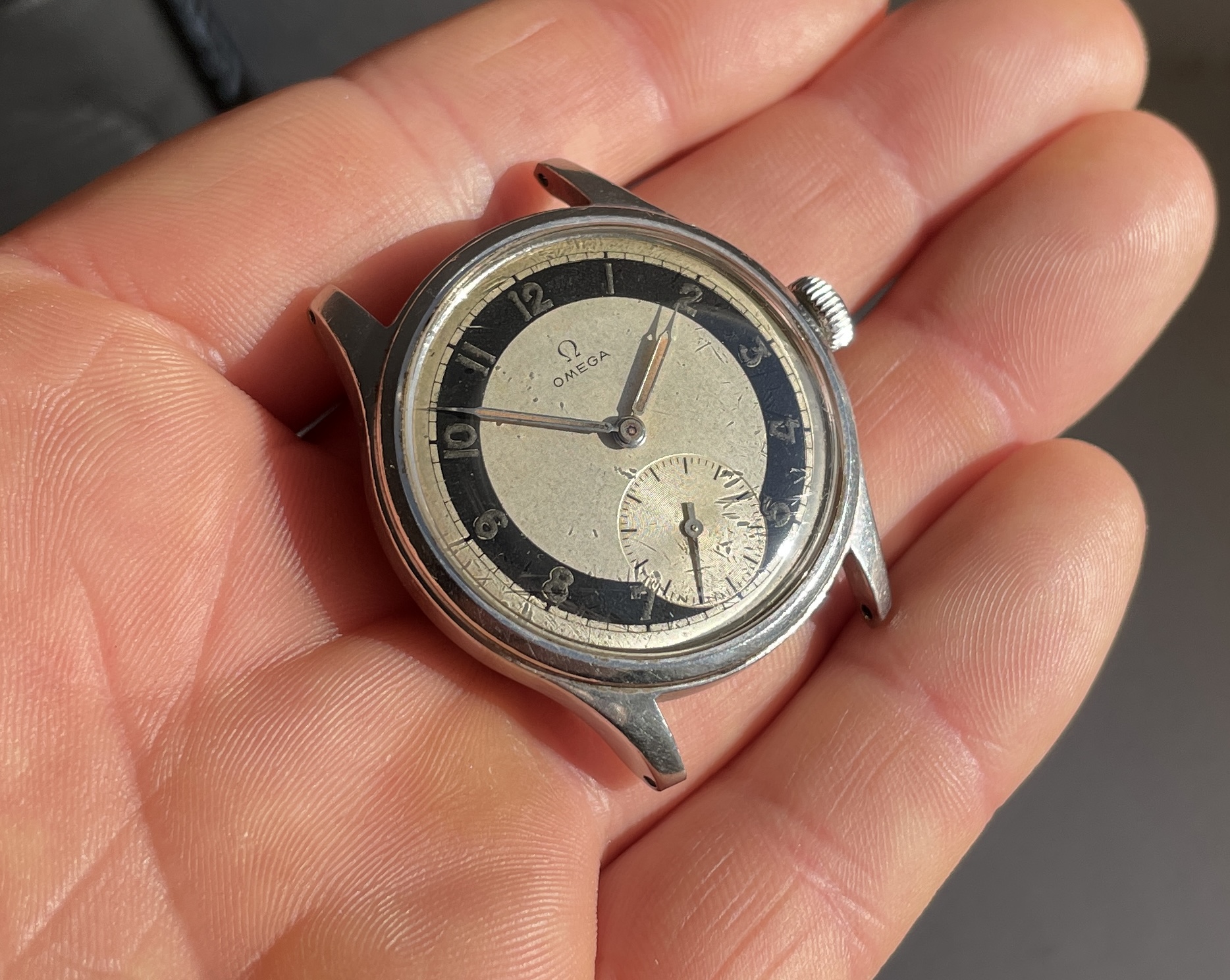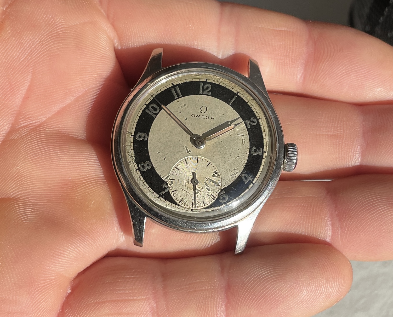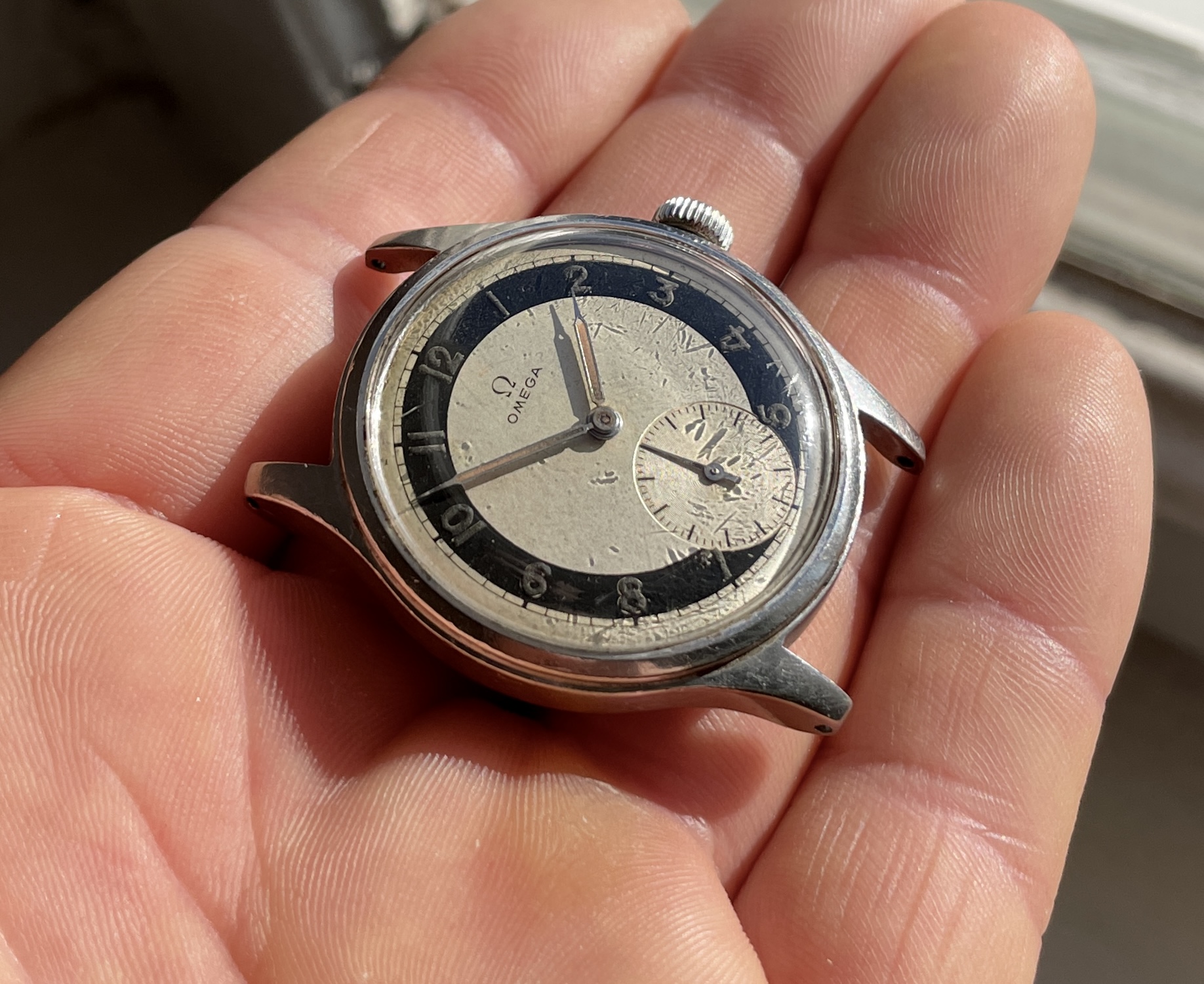 This has an quite uncommon white zone dial that is pretty well preserved and appealing but by know means perfect. There are some small darker spots evenly over the dial and the radium numerals have turned dark. These flaws almost disappear in sunlight and really making the dial pop.