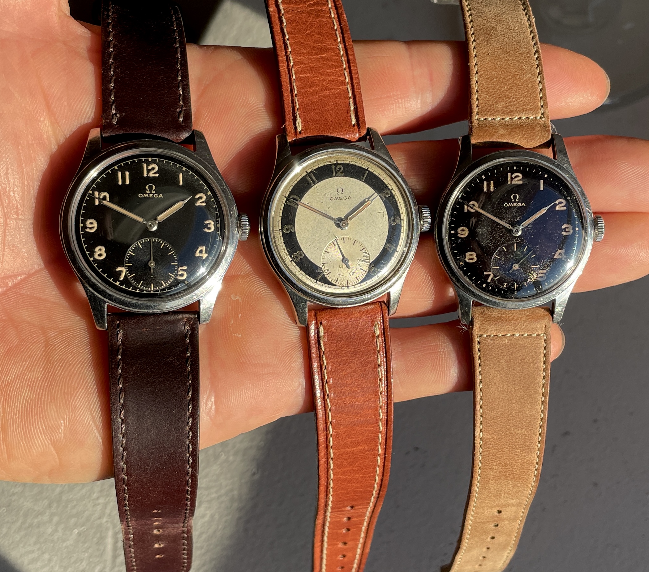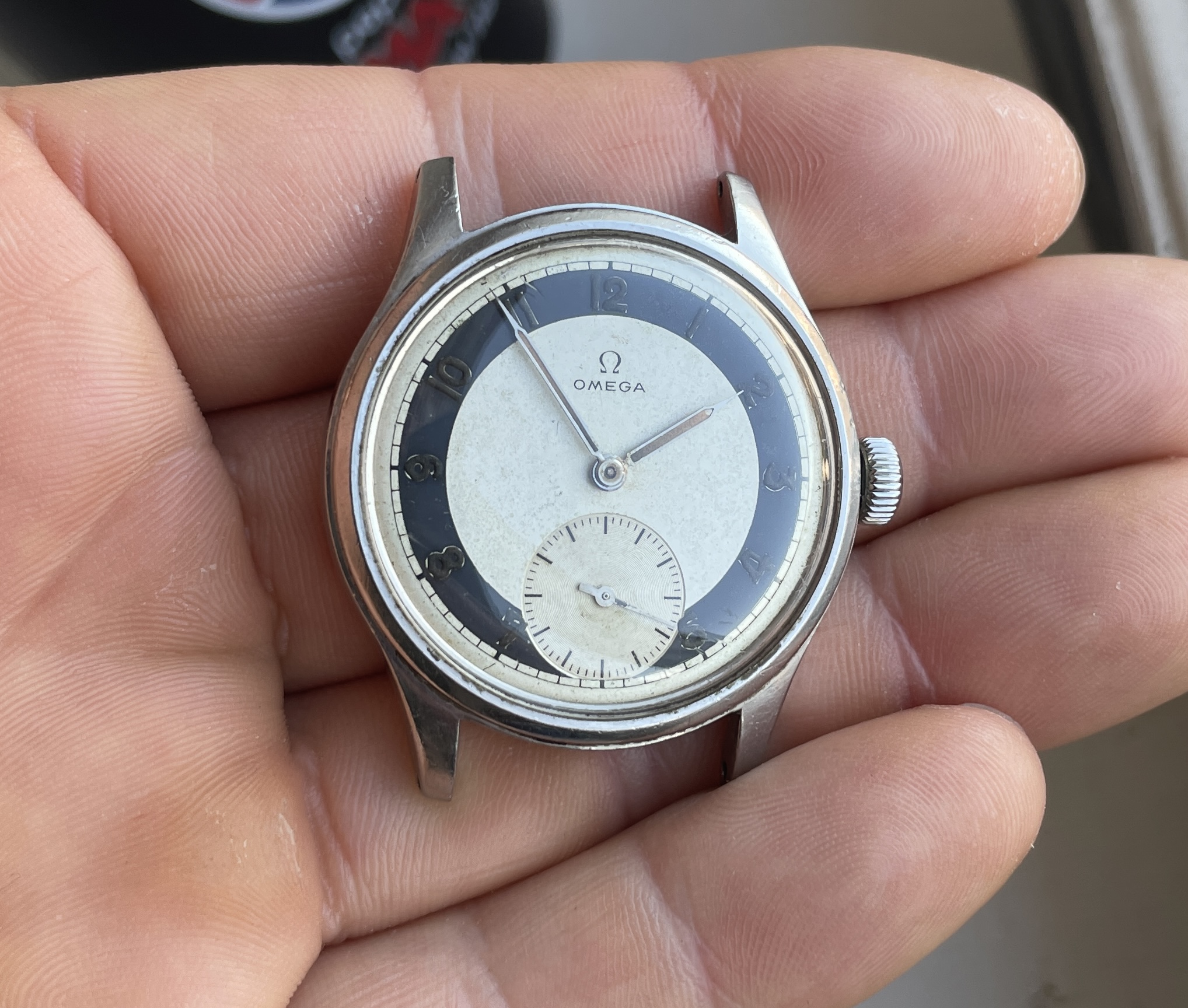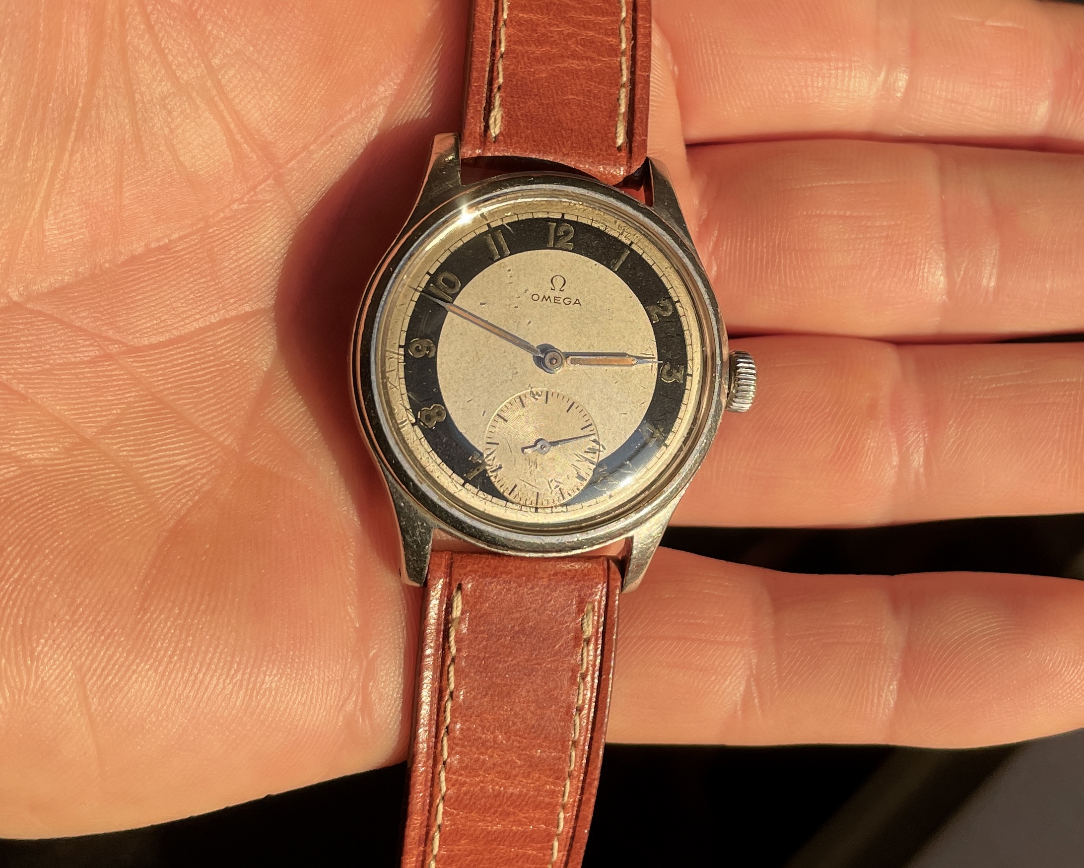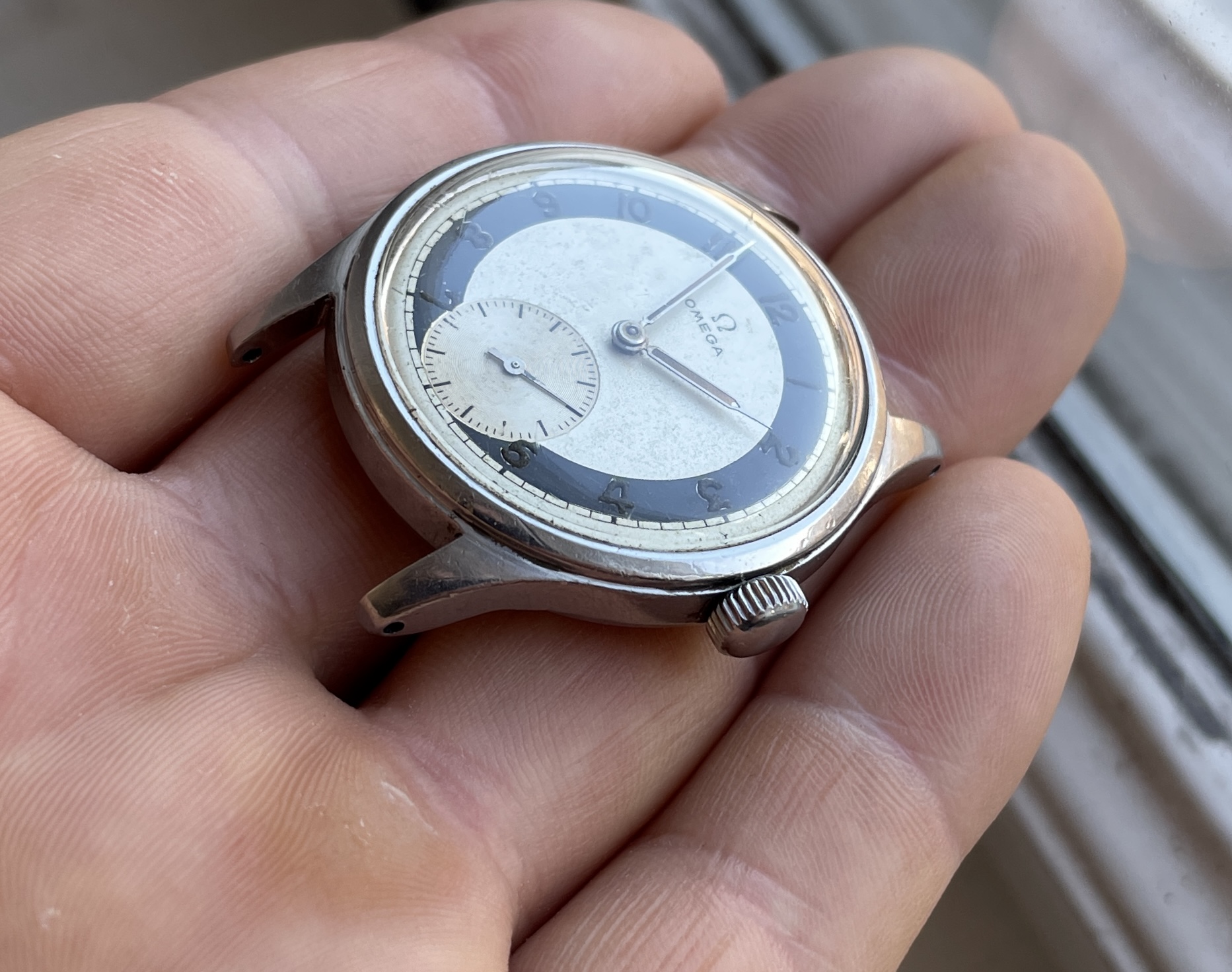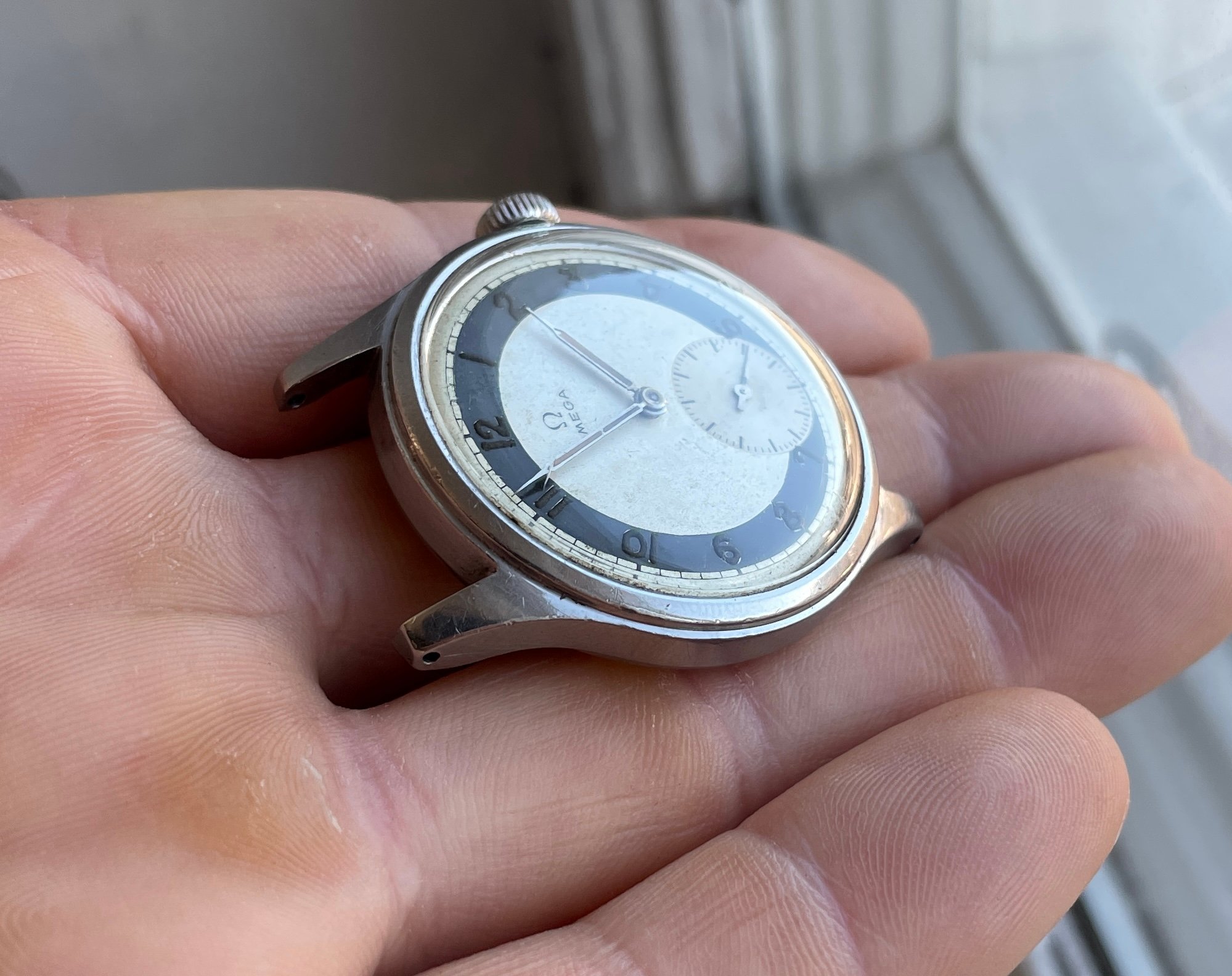 This has an quite uncommon white zone dial that is pretty well preserved and appealing but by know means perfect. There are some small darker spots evenly over the dial and the radium numerals have turned dark. These flaws almost disappear in sunlight and really making the dial pop.
