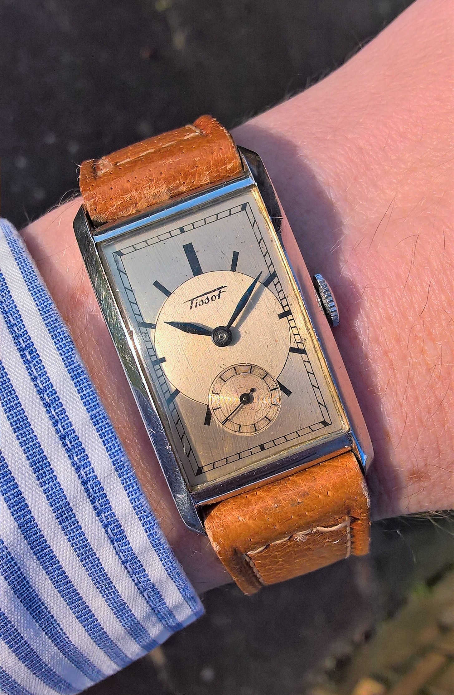 Have this Omega T17 that my grandfather left for me when he died, without any further info. I have been looking around the www but can't find any other T17 with this specifik dial. Anyone ever seen it before, or have any info on it? The hands have a dark blue hue to them that doesn't show in the pictures, and also the central circle and seconds frame is a slightly cream color comoared to the rest of the dial which is more of a warm silver.