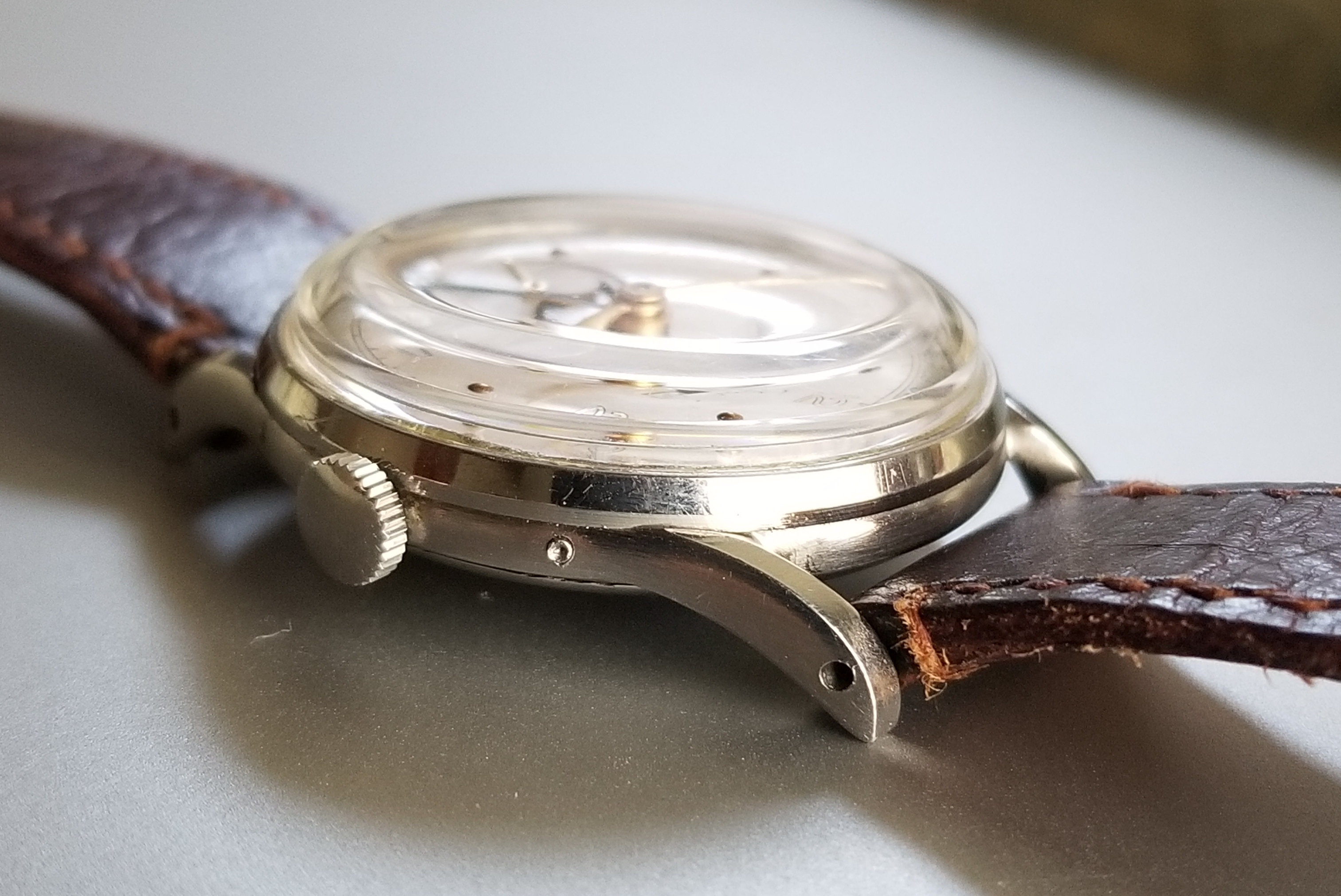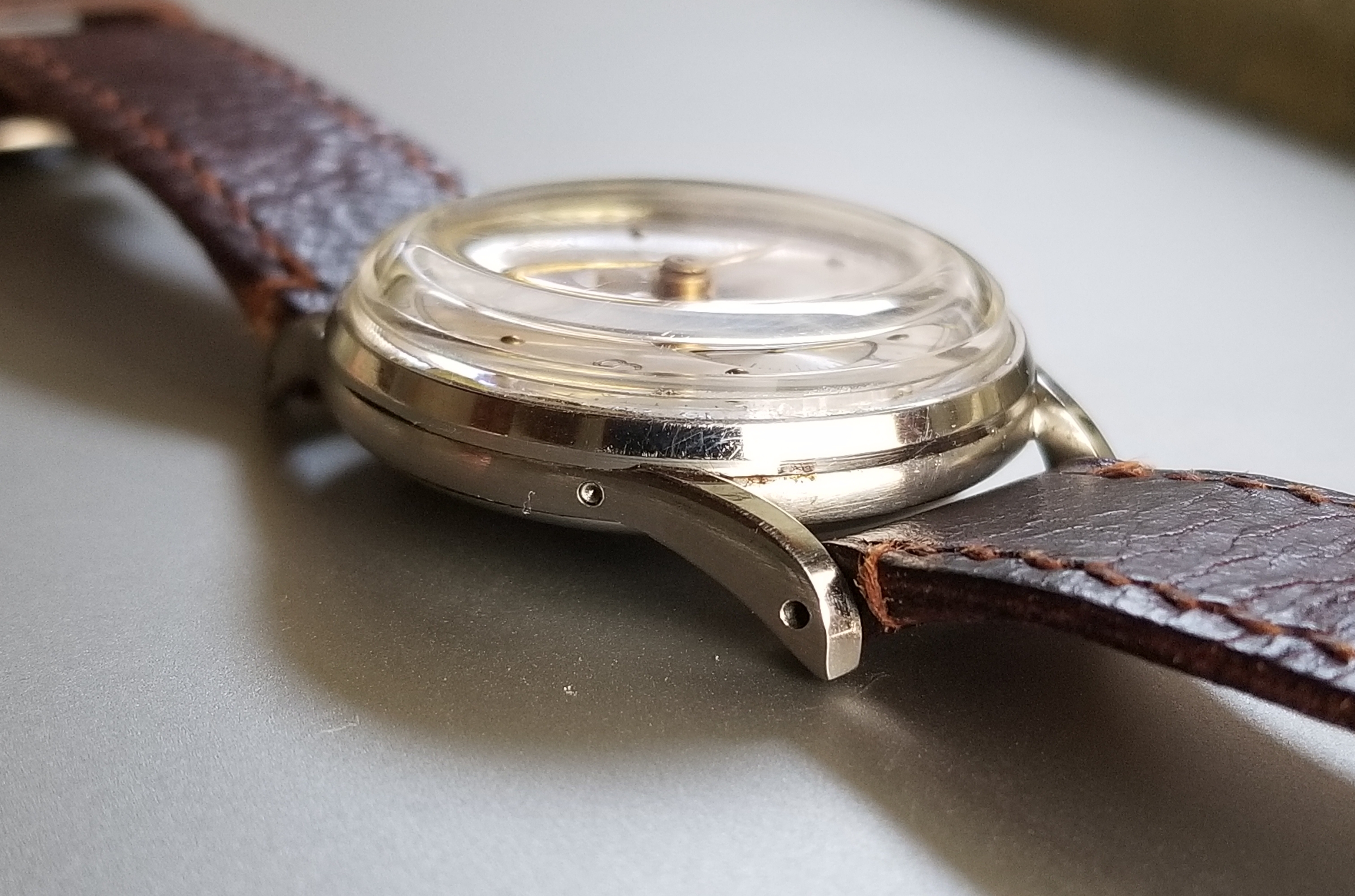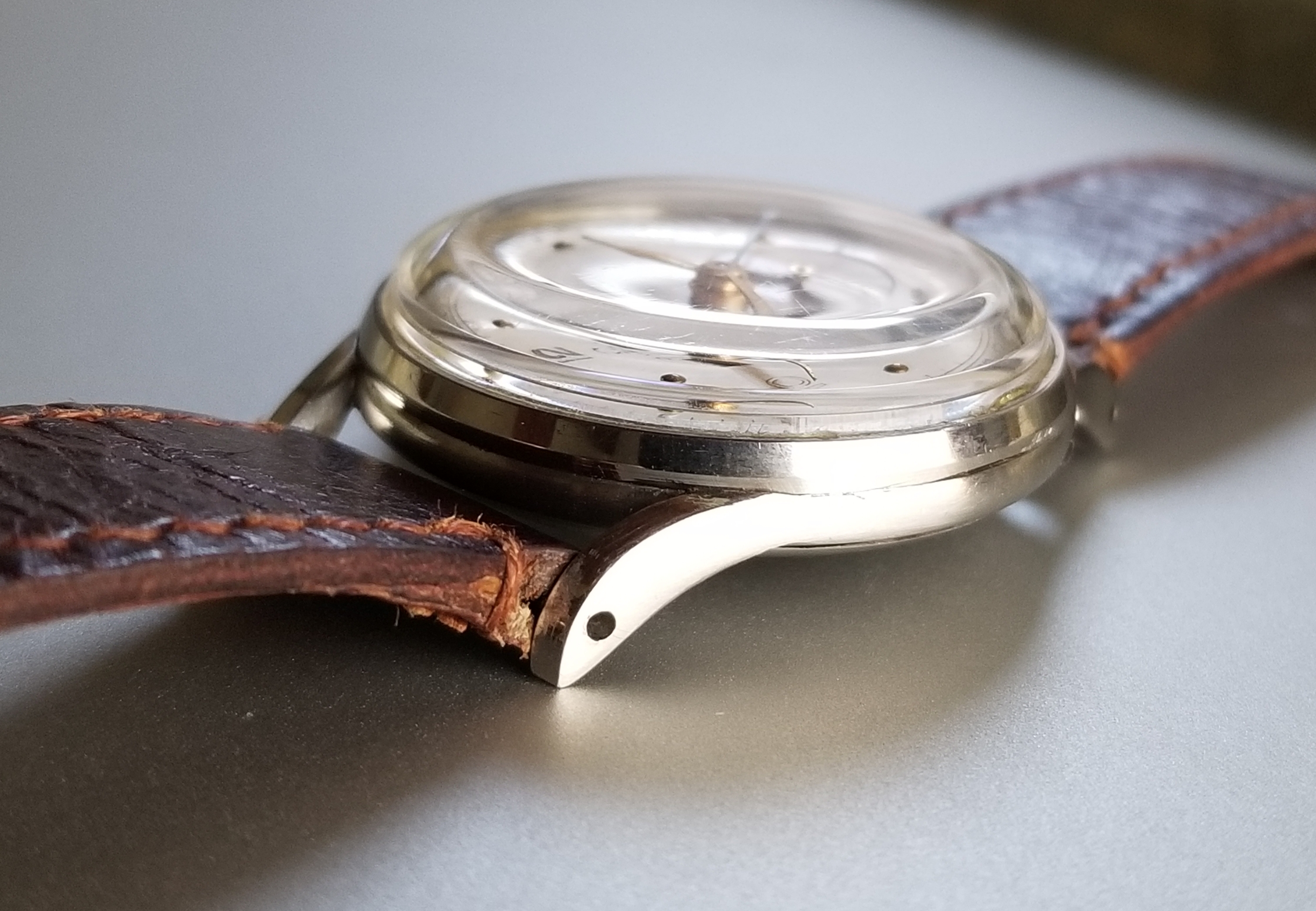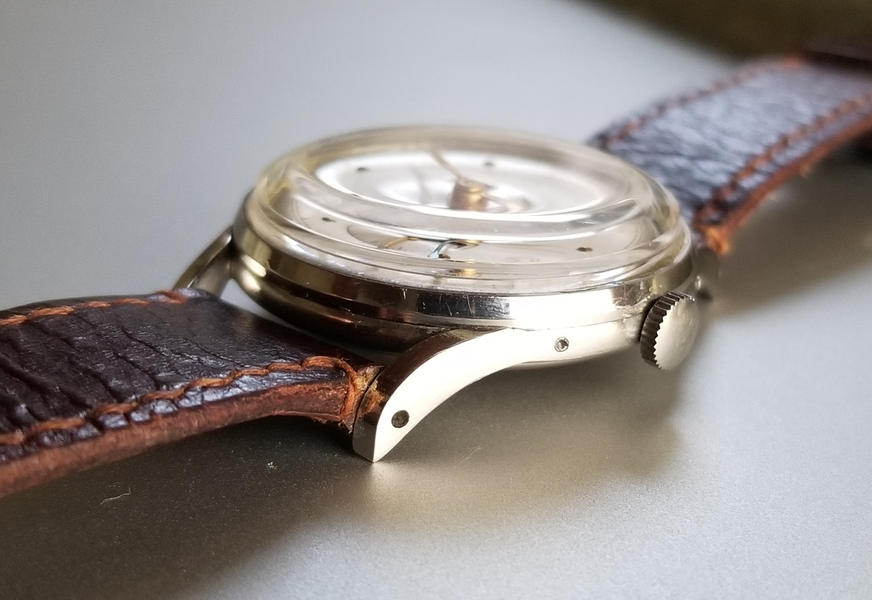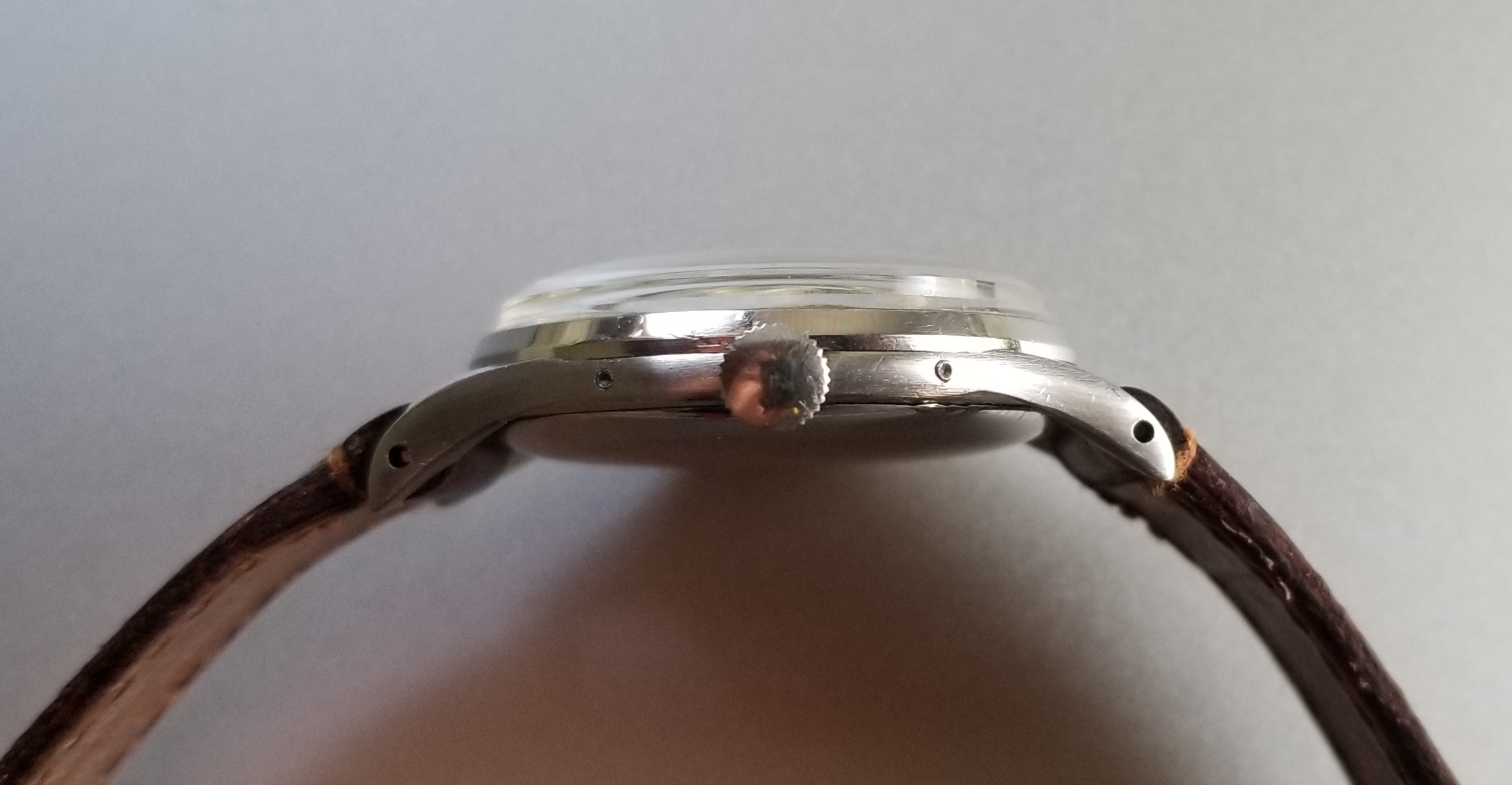 Most TDMPs I see offered for sale have poorly degraded or refinished dials. This dial is original and in very good condition, except for a small mark near the 6 o'clock under the subseconds dial. The gold foil numerals reflect light beautifully in direct sunlight.