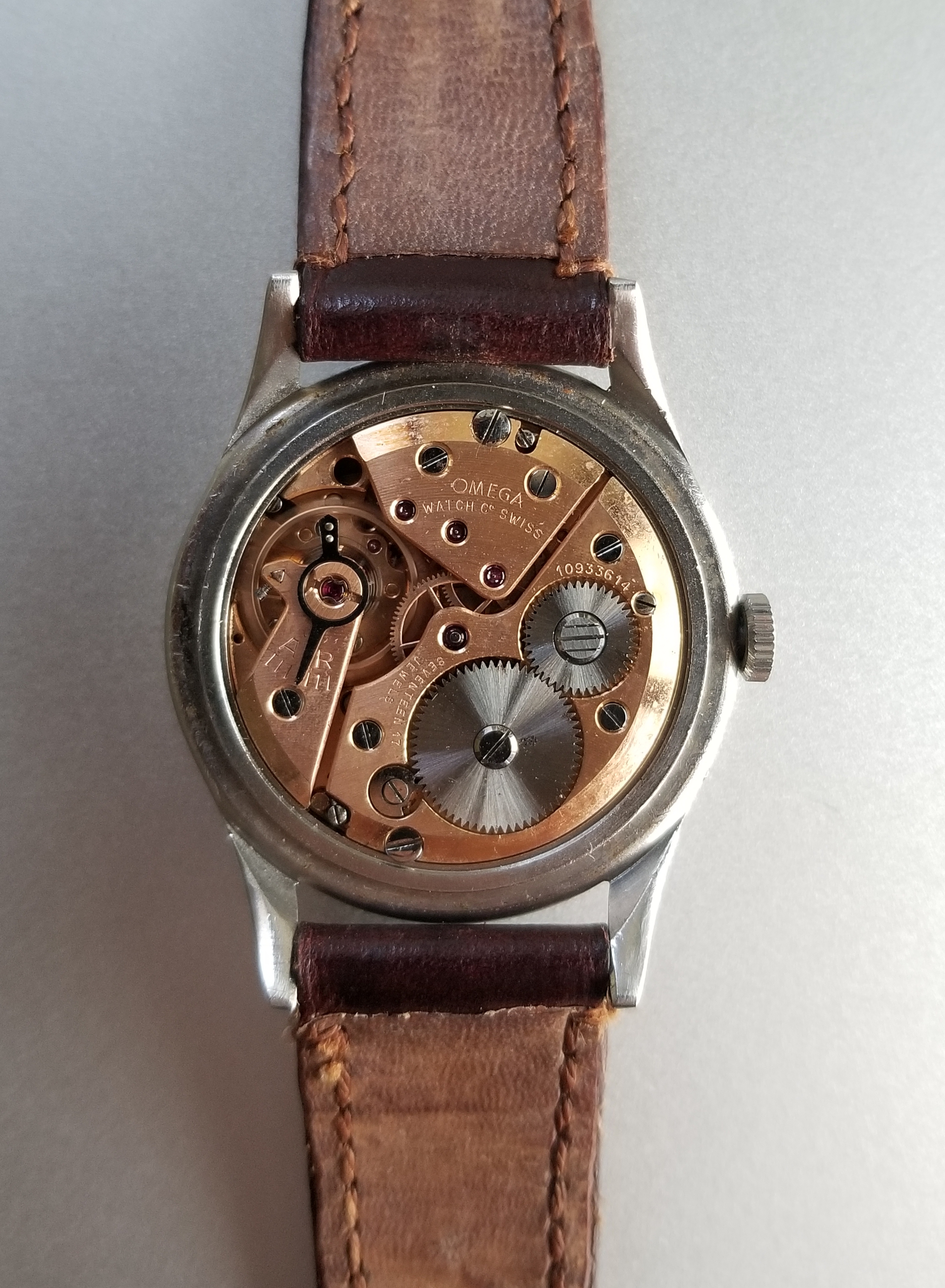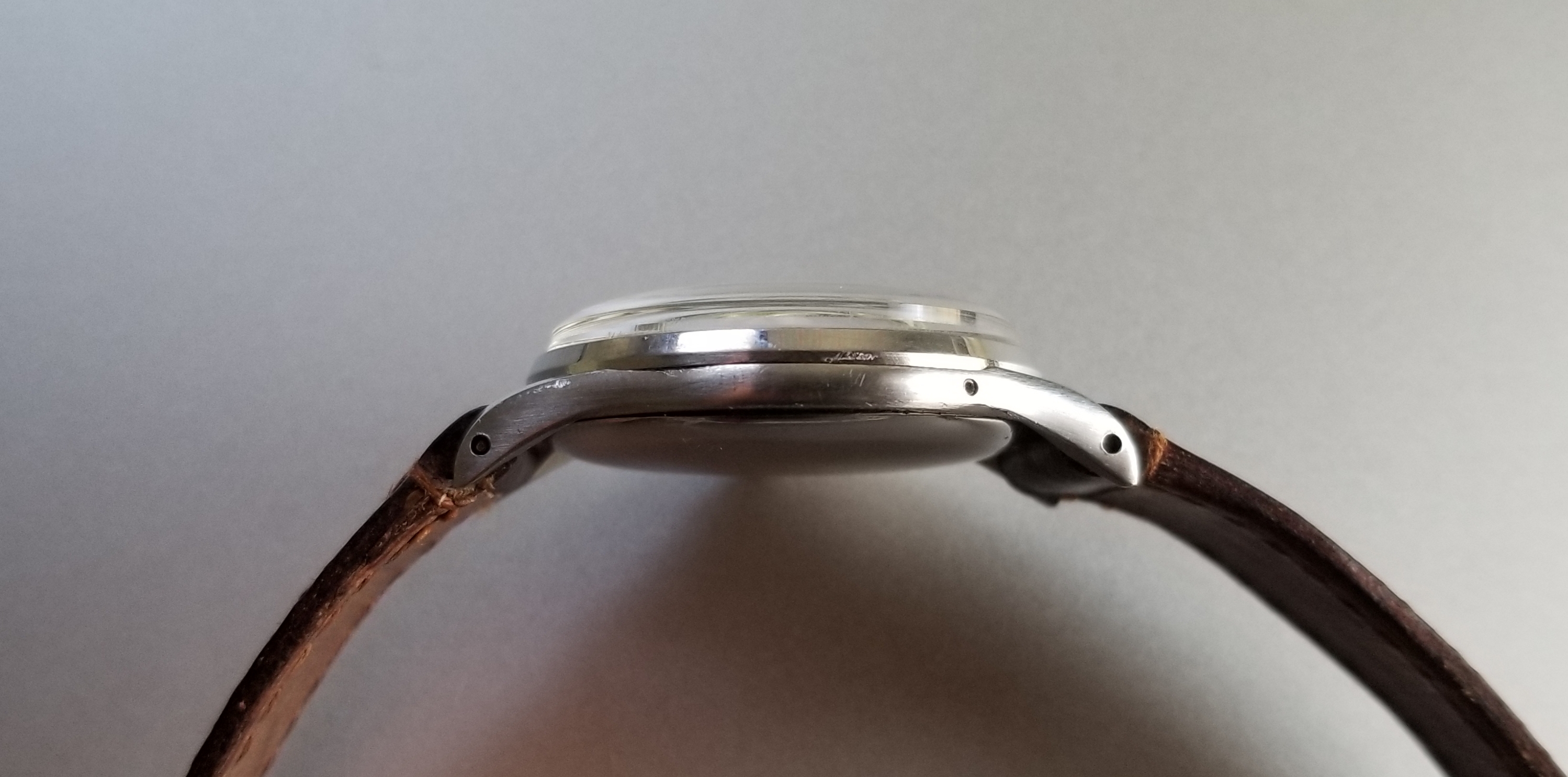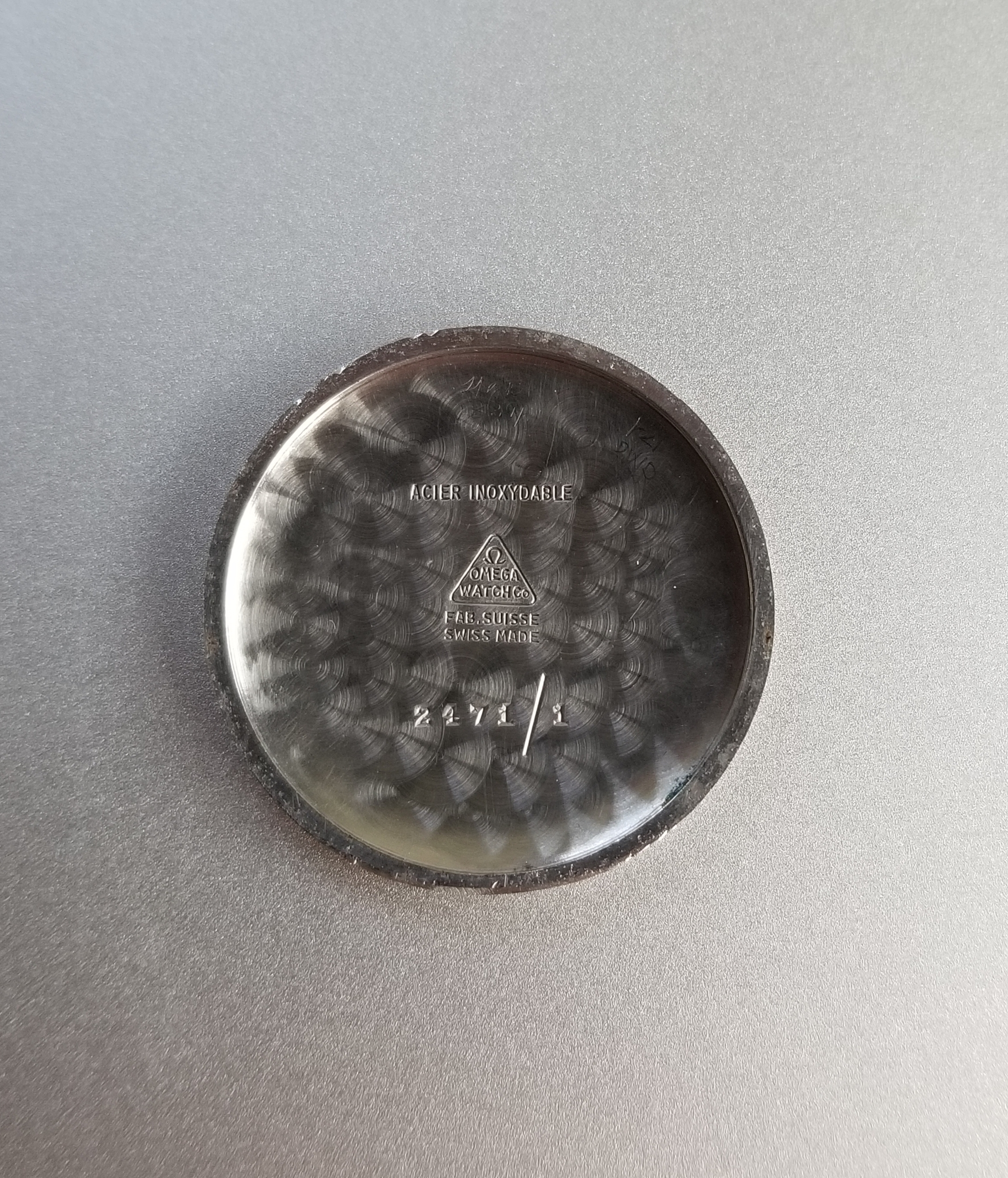 The case appears unpolished with sharp case lines. Original, correct unsigned crown (Omega logo came on the later iterations). The movement was fully serviced 1/27/2021 and comes with a transferable 1 year warranty. All functions work great, including the quickset pushers.