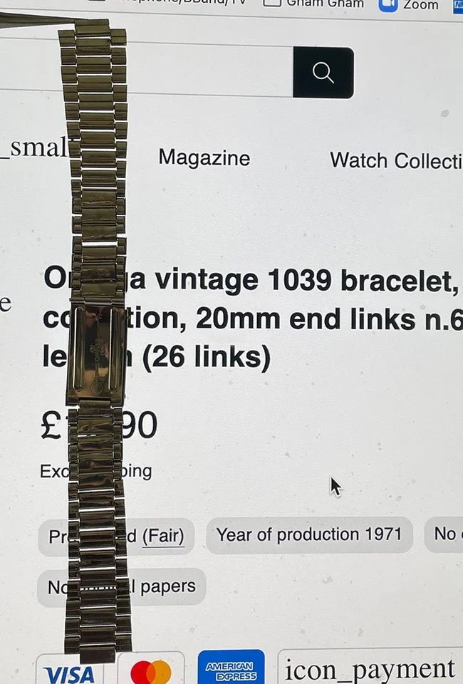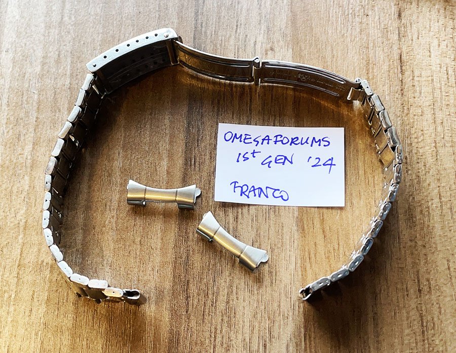 Price is GBP 1350 by bank wire. Comes with 20mm end links n.633, which are recent Omega furniture. The slot was 9.5 mm rather than 10mm, they have been filed by my watchmaker and now fit perfectly (see image).