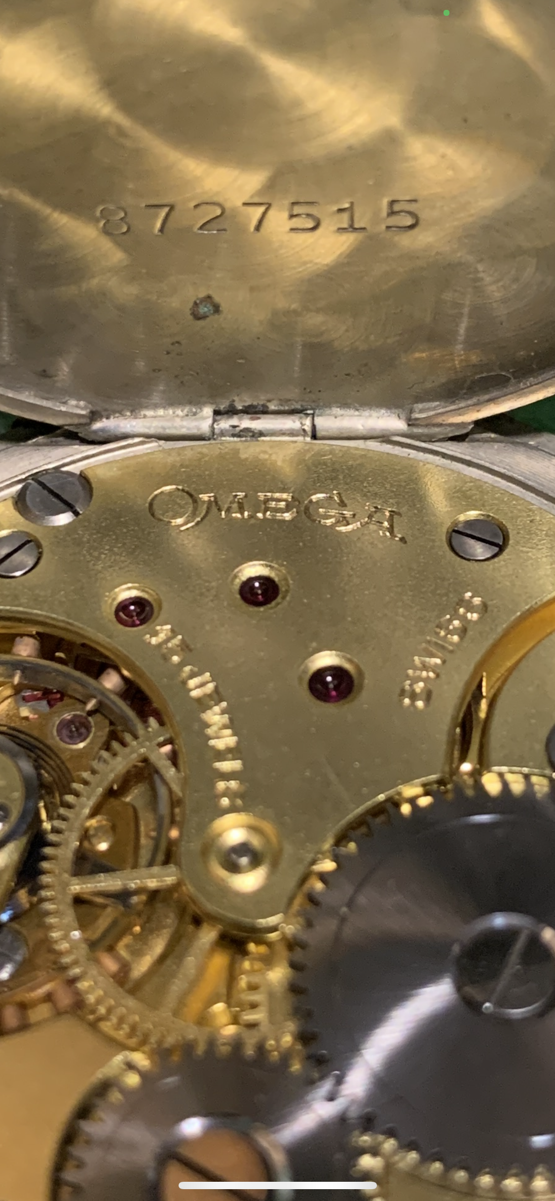 Posts 17,945 Likes 37,524 JimInOz ·Feb 18, 2022·Melbourne Australia Based on the serial numbers I would estimate it is from about 1933 to 1936. Caliber number is stamped under the balance wheel. You can search eBay and other auction sites for "1930 Omega Pocket Watch". Look in "Sold" listings, not what people are asking. The value will depend a lot on what country you are in. Edited: Feb 18, 2022