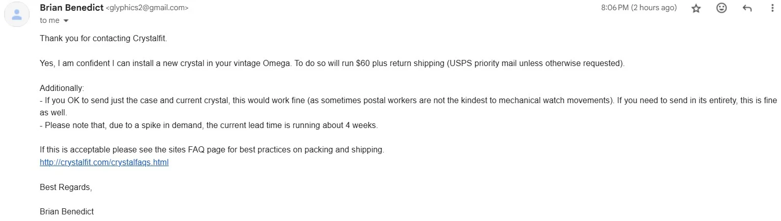 I still think that CrystalFit is likely your best alternative, especially if you can get a watchmaker to remove the crystal from the bezel and take precise measurements. At least you’ll only be gambling the relatively minimal cost of the crystal, plus postage and customs.