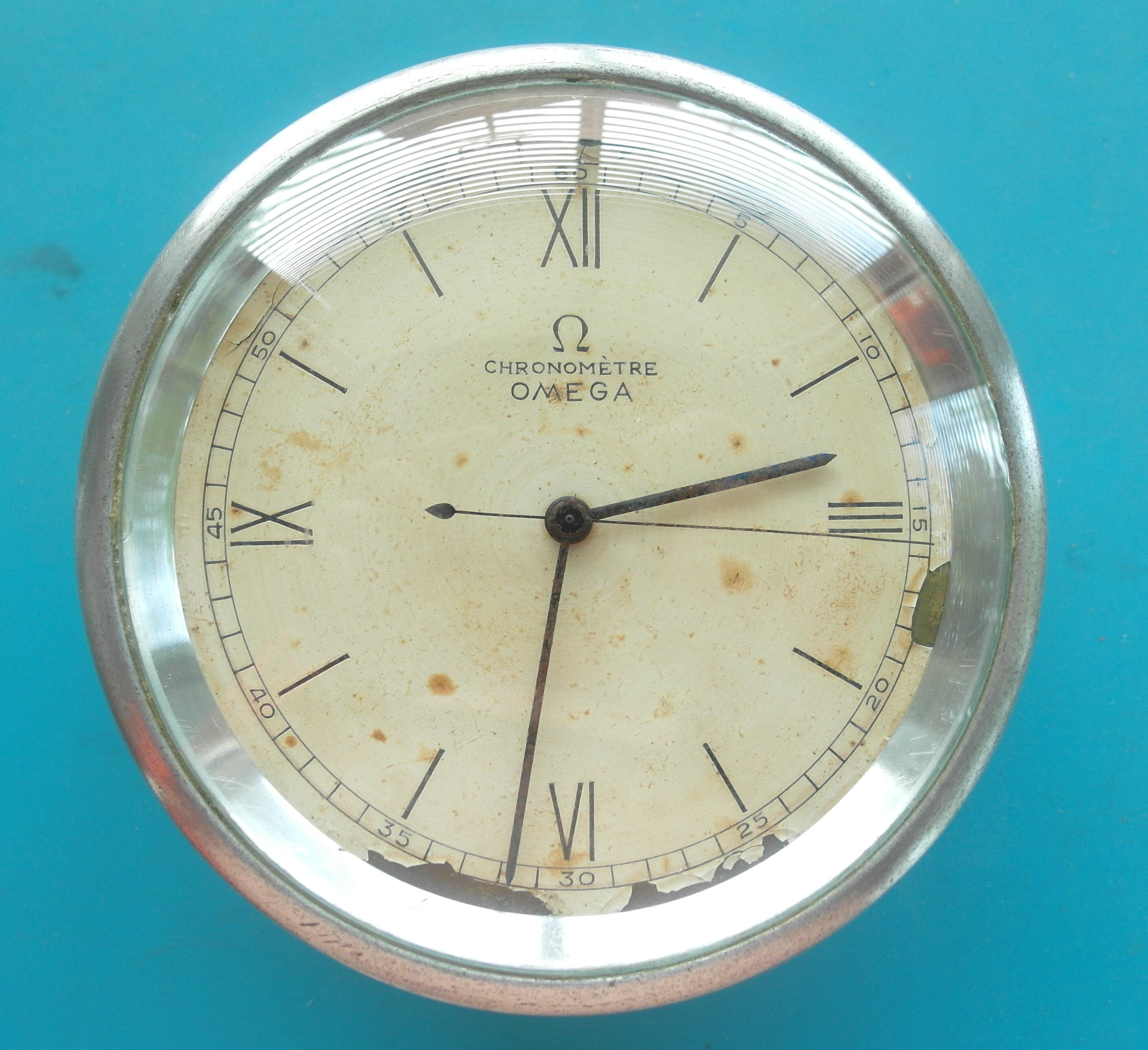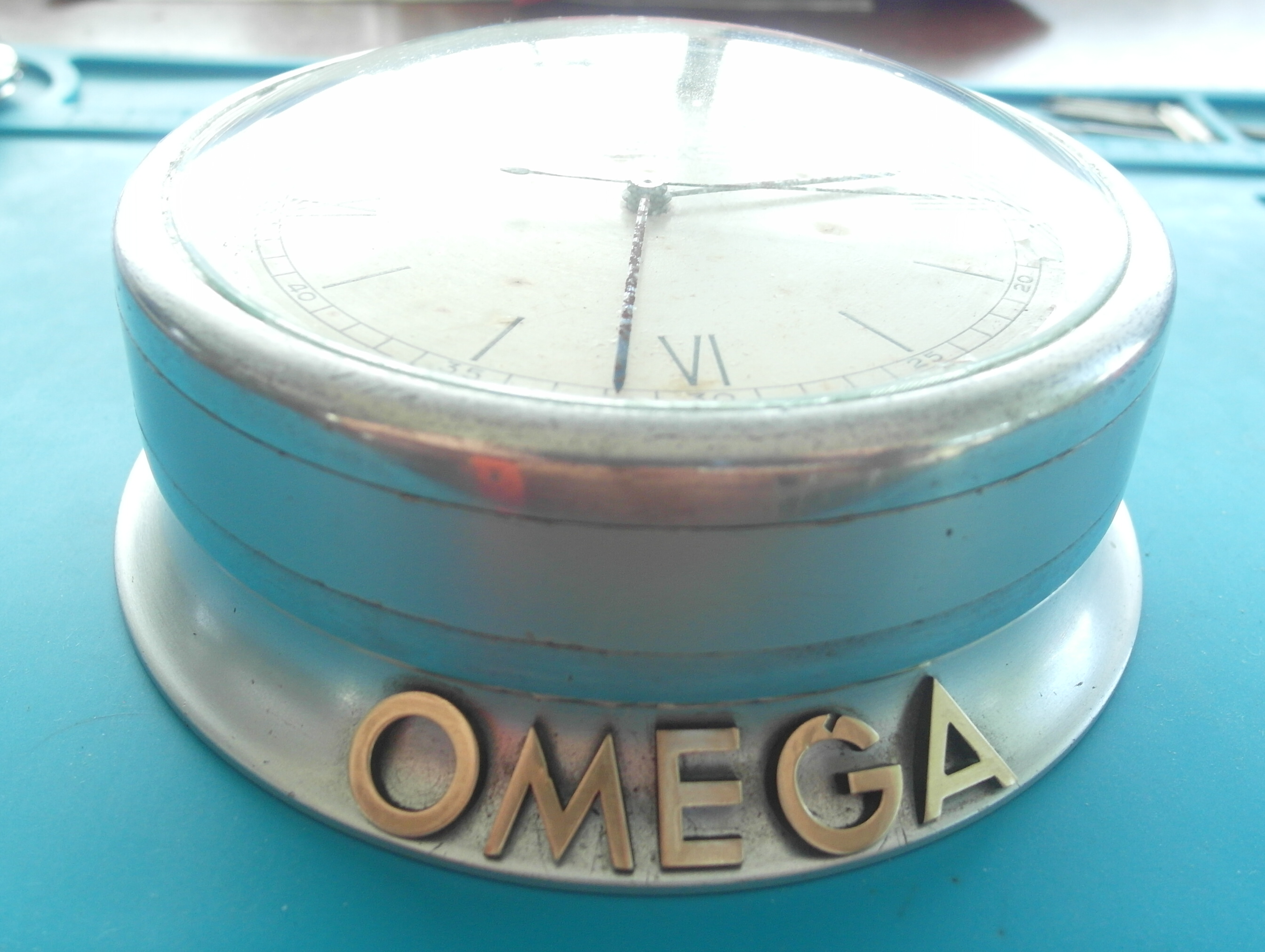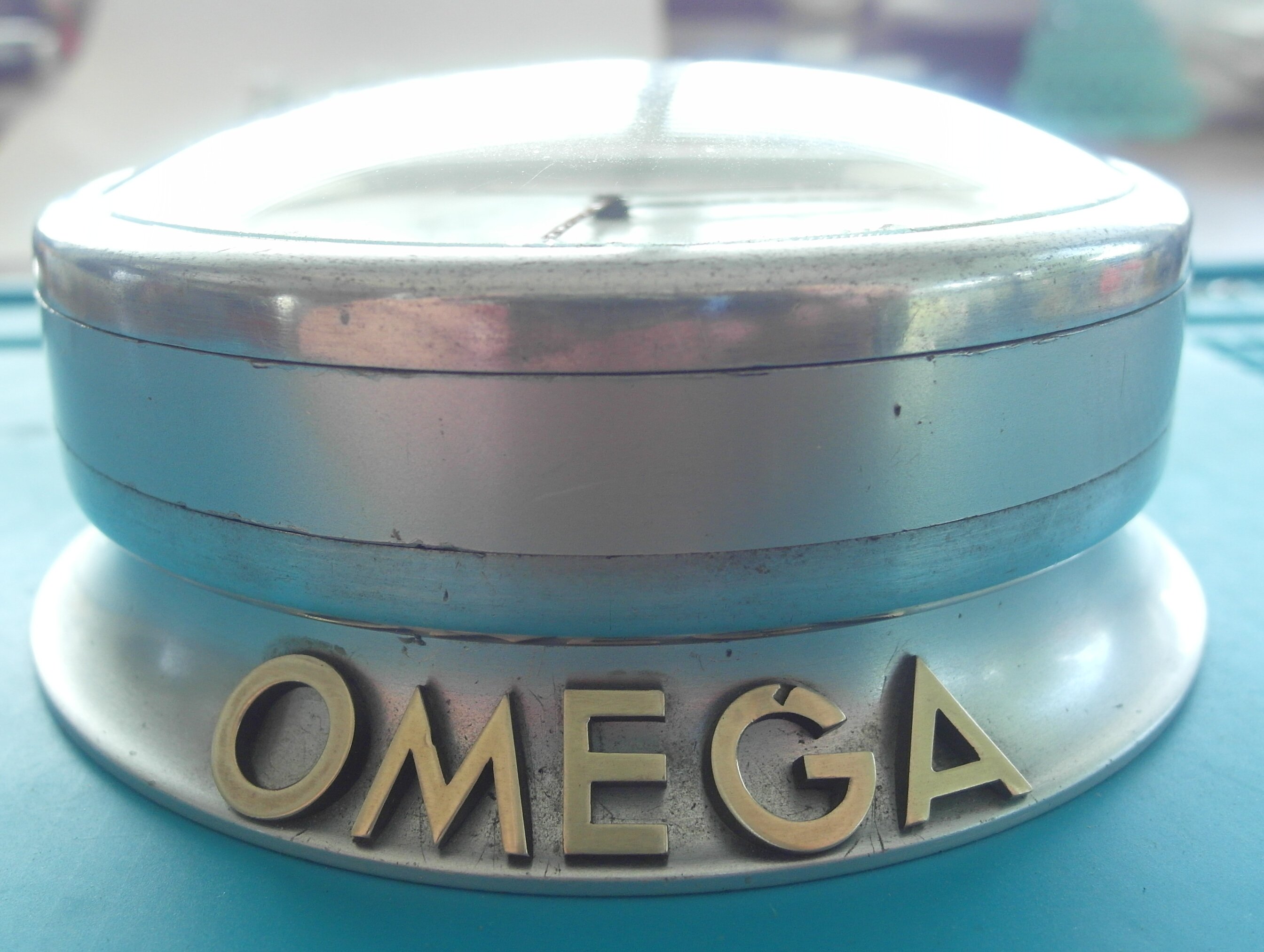 ·Something VERY RARE from my Collection:::::::: Omega Shopfront Chronometre` with 8 day movement and Dead Beat/Jumping Second in the rarest case. Most came in timber crafted cases. This here is an all original Round Alloy Case. Handmade by Omega and therefore stamped with the same case number at each section, to not mix things up at a service. Case number is 47. Reference number is 5003. this example here is unmolested. was in the shop front of an small Sydney Omega Repair shop in the City . For 50 Years. Showing Customers Chronometer time. After the shop closed down due to retirement, i was fortunate to buy that. Was serviced a few years ago by Sydney`s Omega Specialist Joe Santos : He still had parts for it ! The Australian Sun shows on the all Original Dial. The peeled sections have been stabilized and will not peel any further. The very delicate Steel blued hands have some surface rust, which will polish out easily. I did not want to alter anything, so we left it that way. We did not touch anything here. The only thing replaced, as far as i can see, is the curved Glass. Caliber 59.8 D SCS . the last picture shows the excerpt from the omega book from Mr. Kreutzer. The Omega Ad from the time. This Clock will only be shipped via courier with external full 3. party insurance. Carefully packed and secured. You become the custodian of a very important chapter of Swiss Watchmaking history here. Jumping second was an achievement in mechanical watches. Diameter base: 11 centimeters. Diameter top part: 9,5 cm. Height: 4 cm incl. the curved glass. The large metal / Brass Omega letters are screwed into the base. Gold / Brass colour.