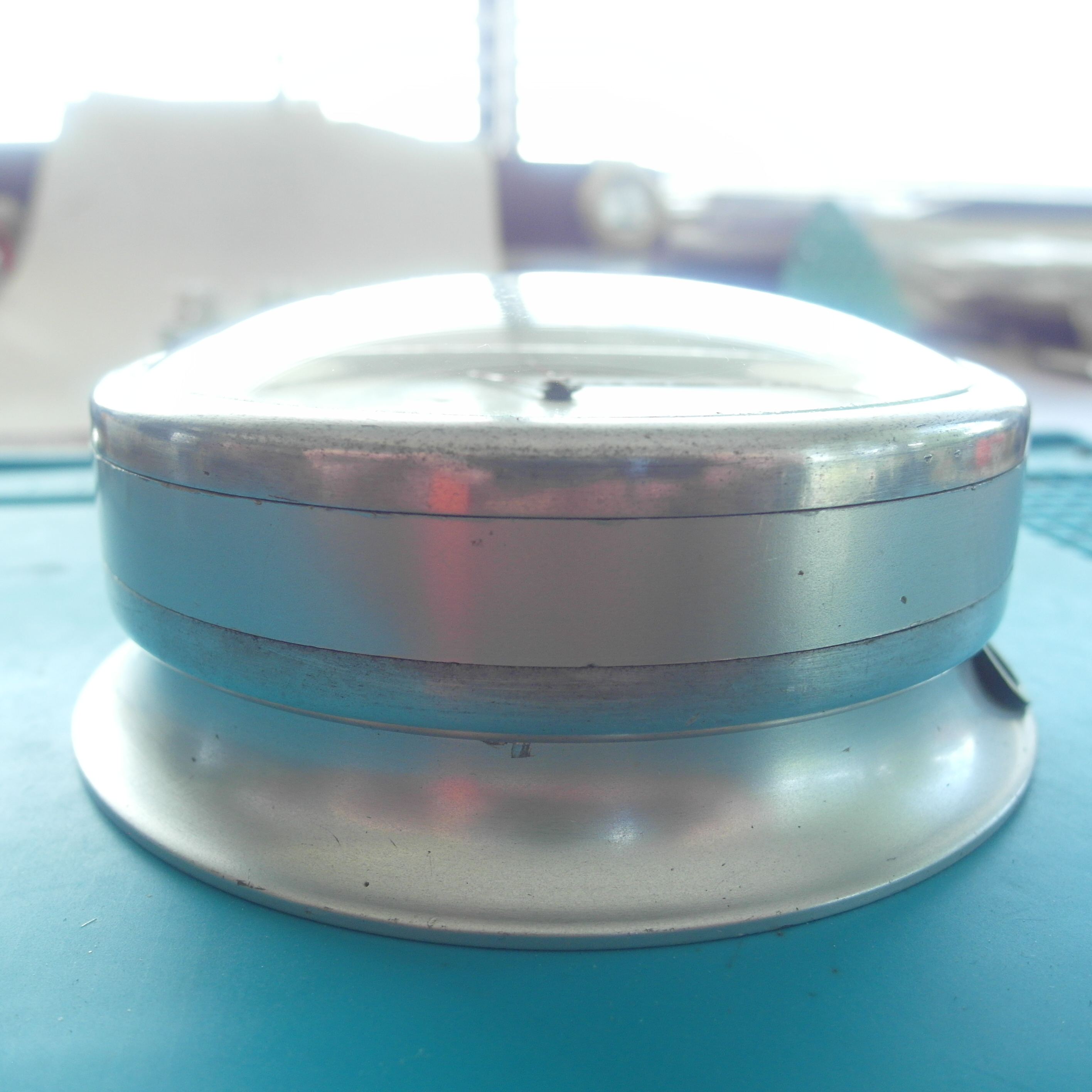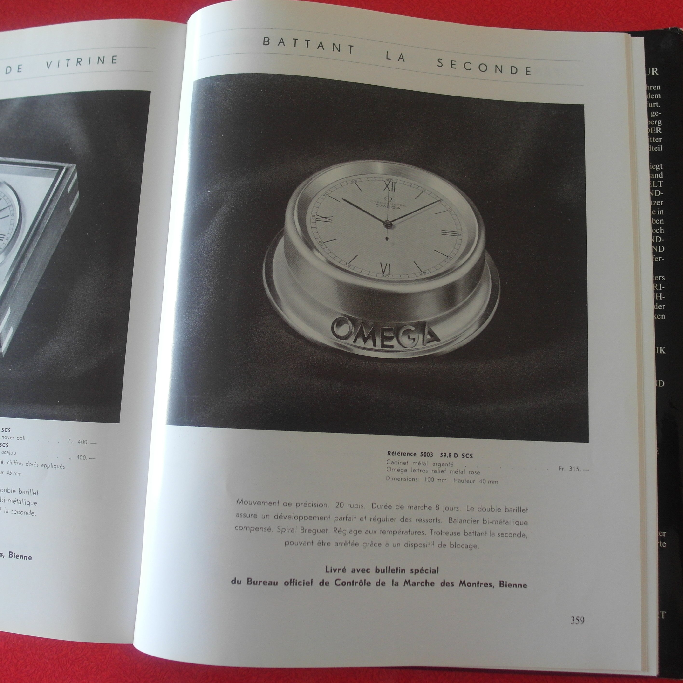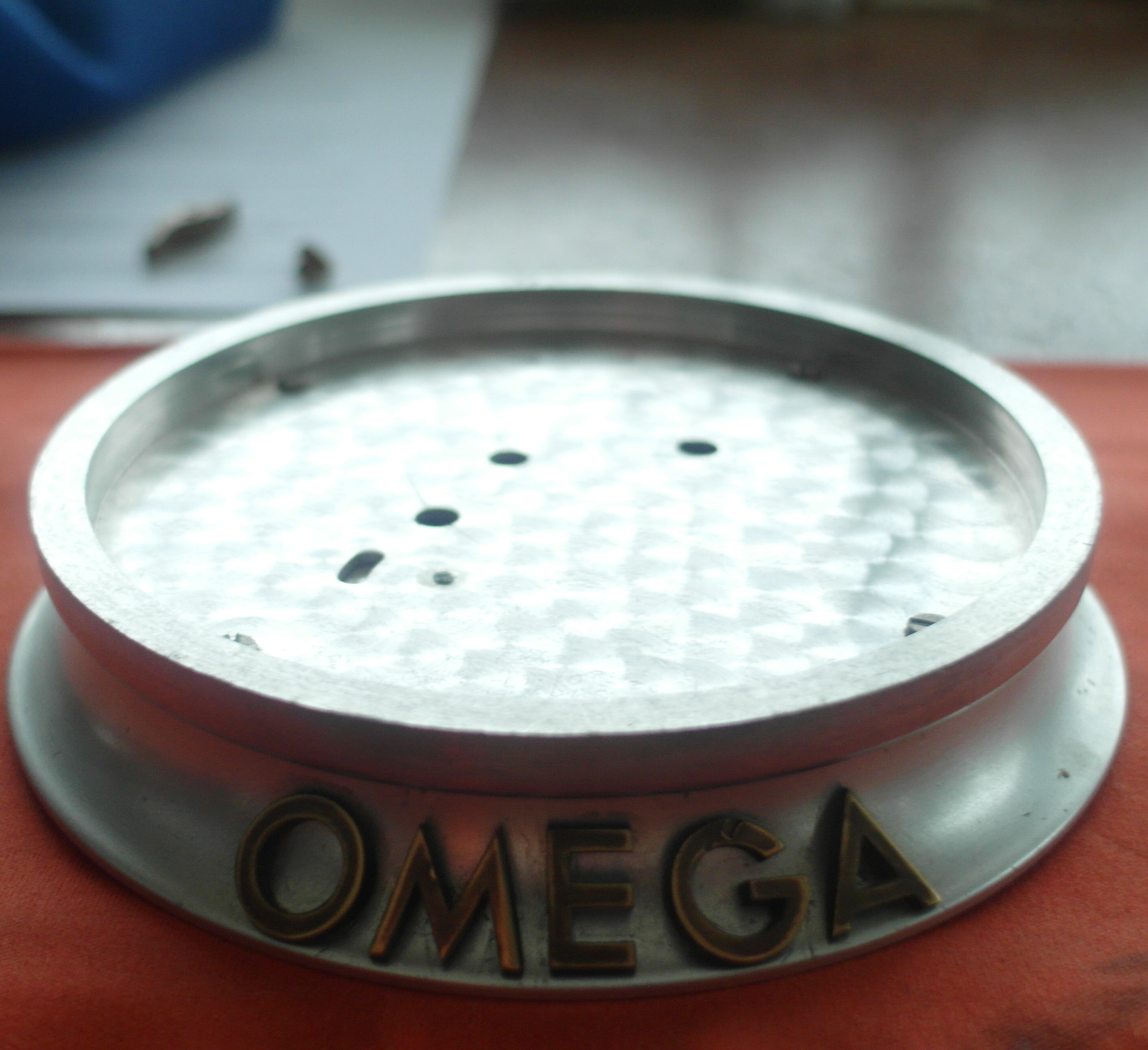 ·Something VERY RARE from my Collection:::::::: Omega Shopfront Chronometre` with 8 day movement and Dead Beat/Jumping Second in the rarest case. Most came in timber crafted cases. This here is an all original Round Alloy Case. Handmade by Omega and therefore stamped with the same case number at each section, to not mix things up at a service. Case number is 47. Reference number is 5003. this example here is unmolested. was in the shop front of an small Sydney Omega Repair shop in the City . For 50 Years. Showing Customers Chronometer time. After the shop closed down due to retirement, i was fortunate to buy that. Was serviced a few years ago by Sydney`s Omega Specialist Joe Santos : He still had parts for it ! The Australian Sun shows on the all Original Dial. The peeled sections have been stabilized and will not peel any further. The very delicate Steel blued hands have some surface rust, which will polish out easily. I did not want to alter anything, so we left it that way. We did not touch anything here. The only thing replaced, as far as i can see, is the curved Glass. Caliber 59.8 D SCS . the last picture shows the excerpt from the omega book from Mr. Kreutzer. The Omega Ad from the time. This Clock will only be shipped via courier with external full 3. party insurance. Carefully packed and secured. You become the custodian of a very important chapter of Swiss Watchmaking history here. Jumping second was an achievement in mechanical watches. Diameter base: 11 centimeters. Diameter top part: 9,5 cm. Height: 4 cm incl. the curved glass. The large metal / Brass Omega letters are screwed into the base. Gold / Brass colour.
