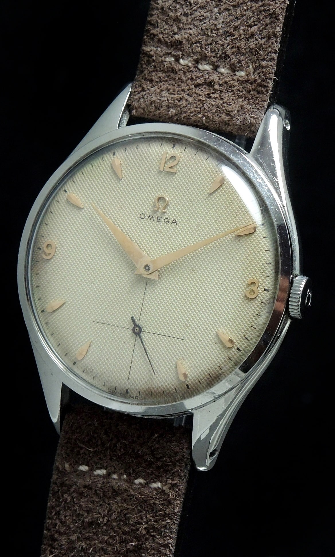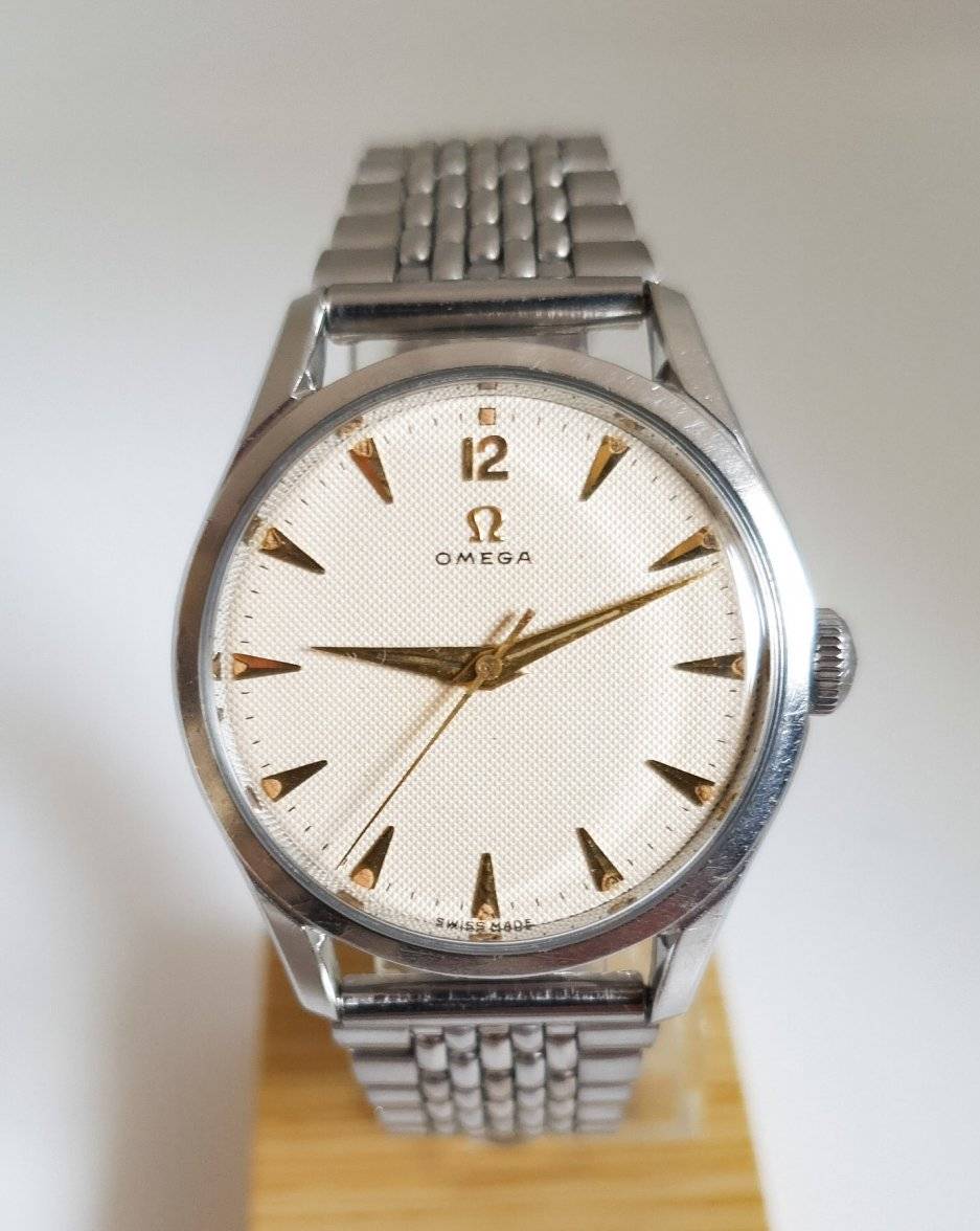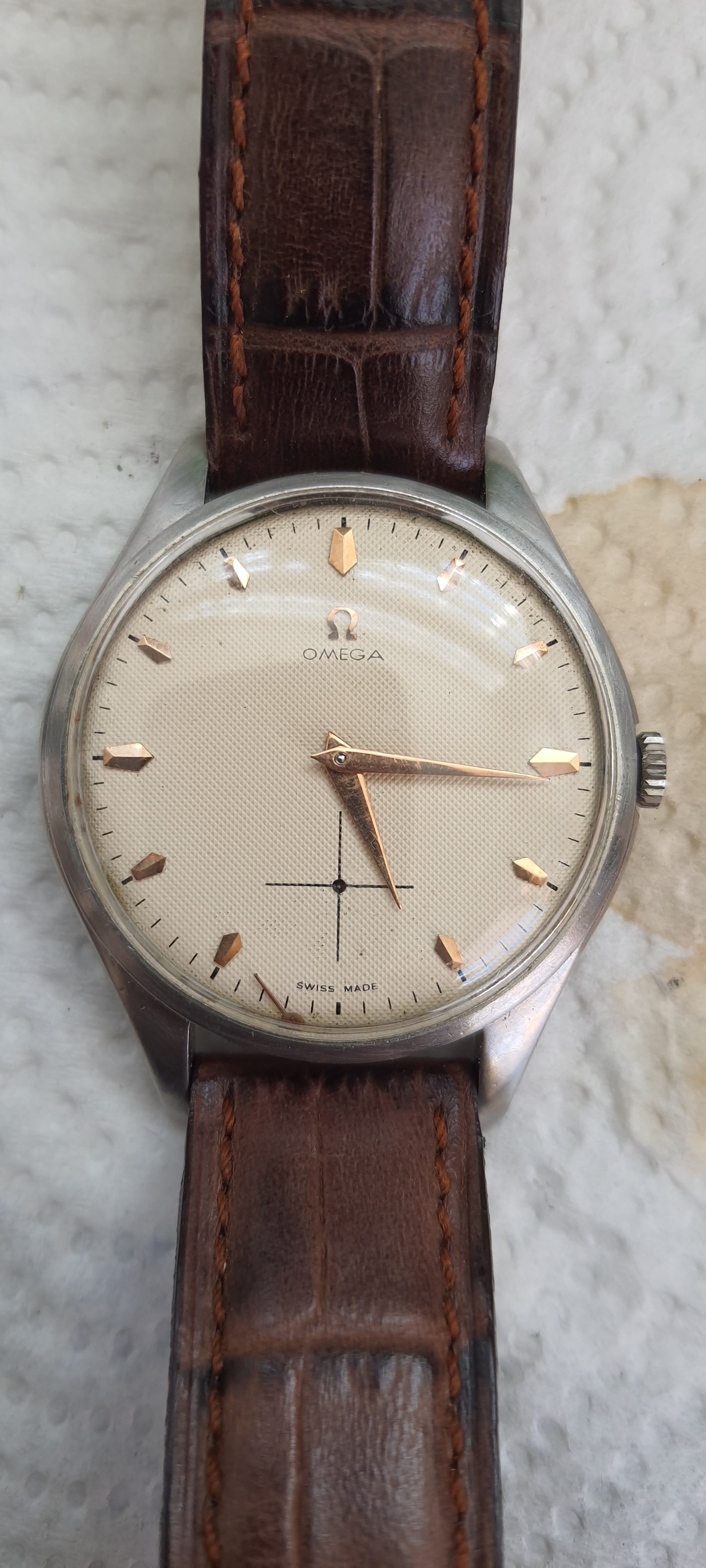 Dos relojes Omega con esferas renovadas, probablemente de la década de 1940. Las manecillas no parecen correctas para ninguno de estos relojes.
