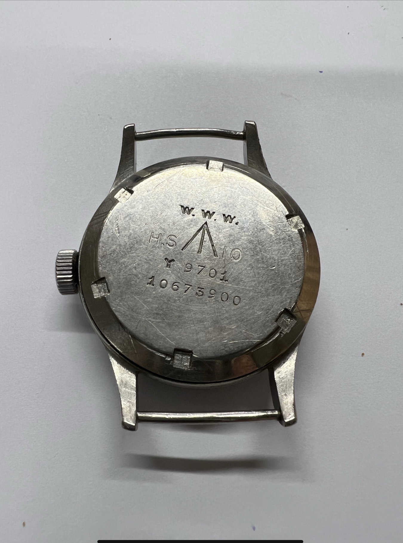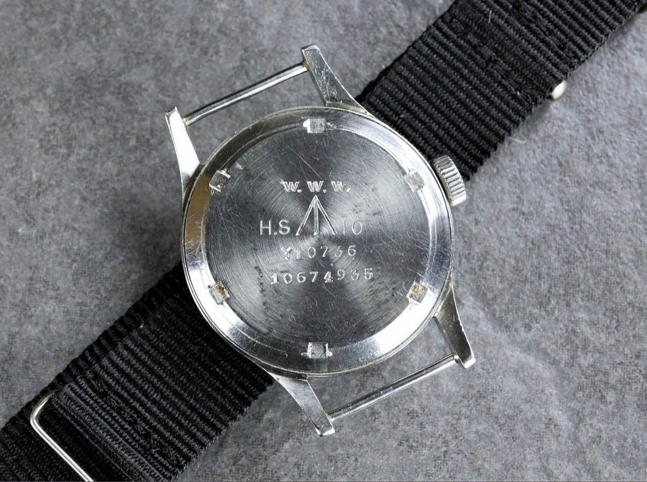 The information for these is relatively scarce but they were apparently used by the Royal Navy and their diver supervisors. They are the same watch as the WWW Dirty Dozen but most seem to have M.O.D dial variant ( some keep their original WWW dial) and the case backs are inscribed with the Royal Navy designation H.S. 10. H.S. Being short for Hydrographic Standard.