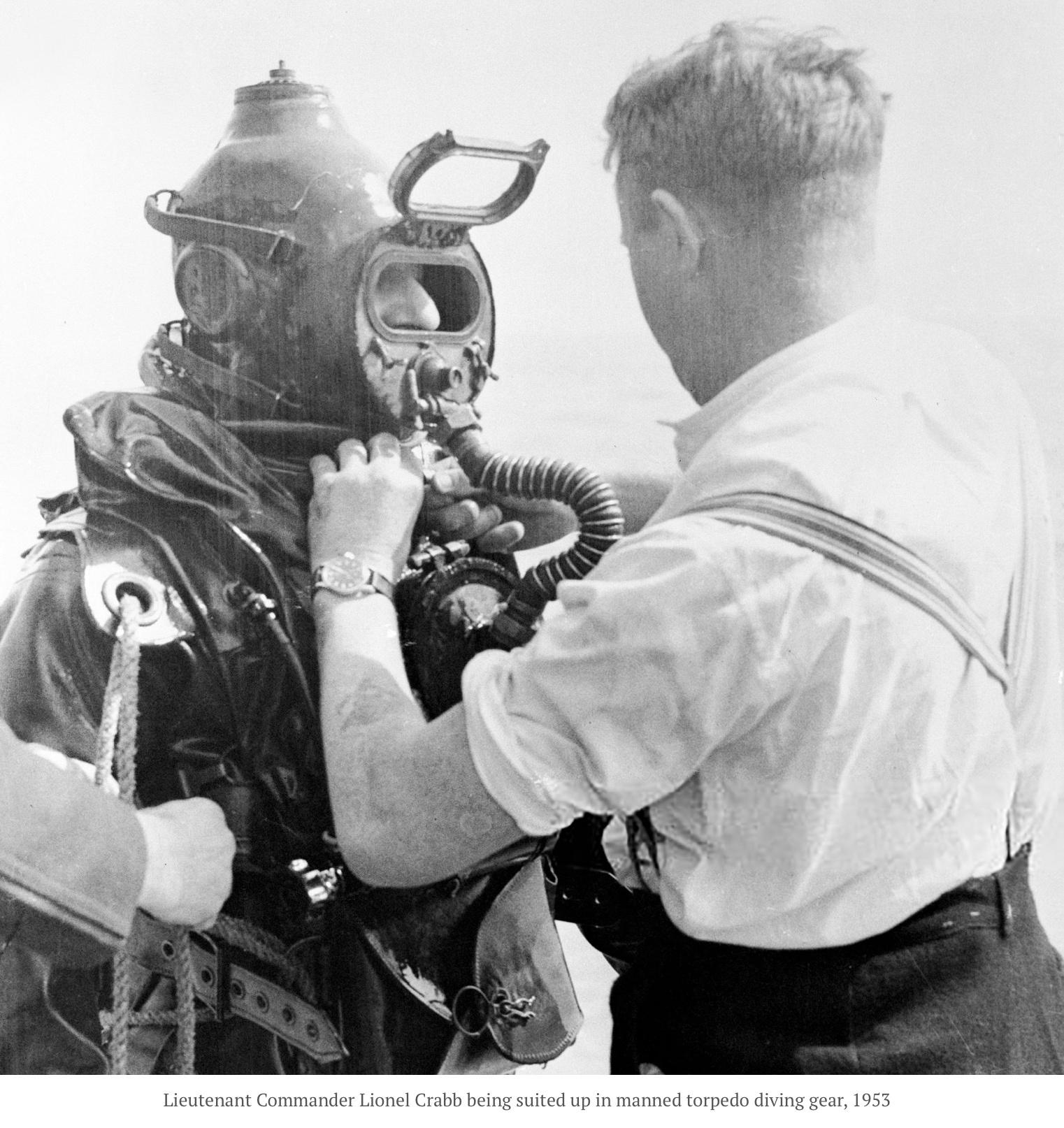 An apparent photo of a diver supervisor (supervising diver Buster Crabb) in action with what could be the HS10 Omega on his wrist: