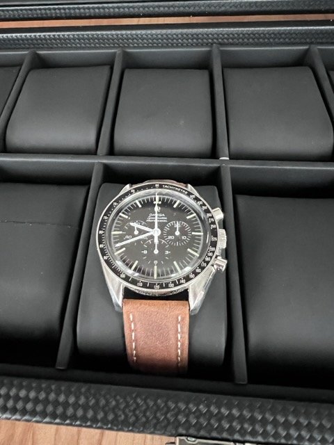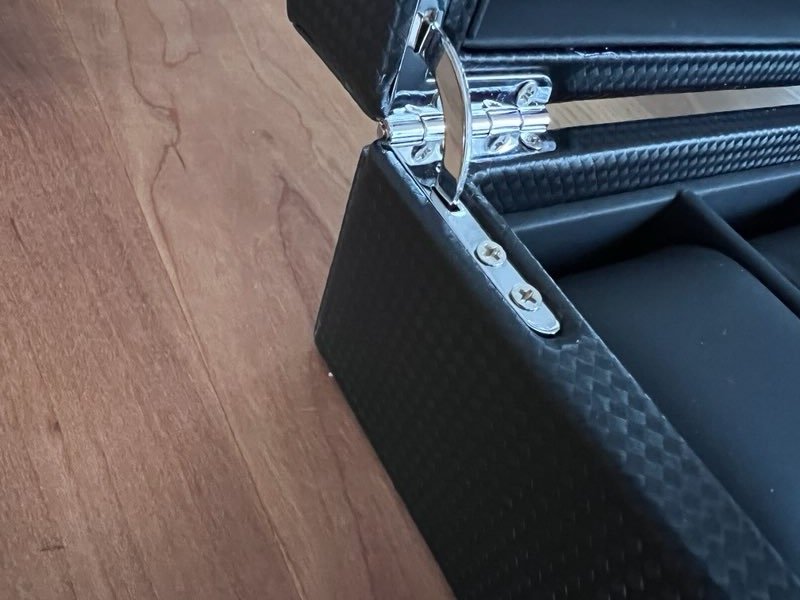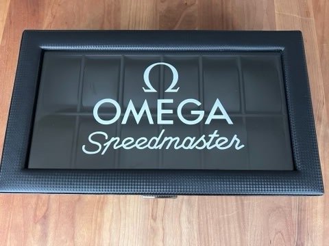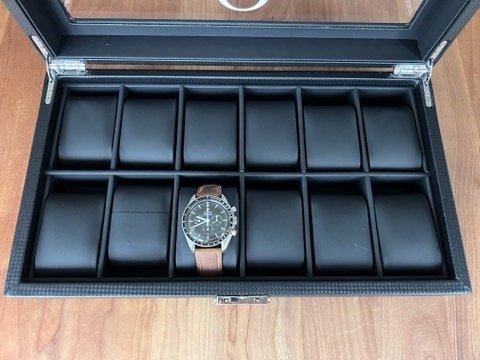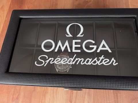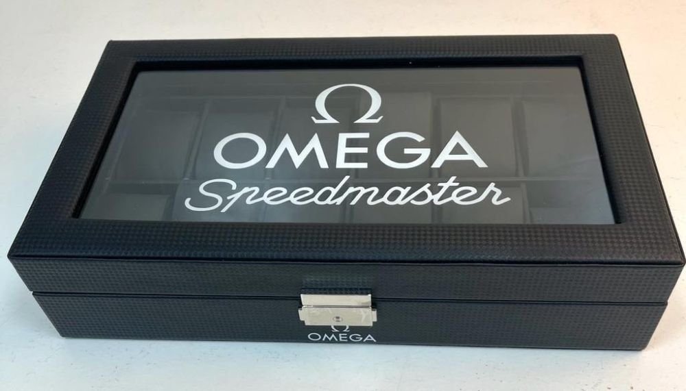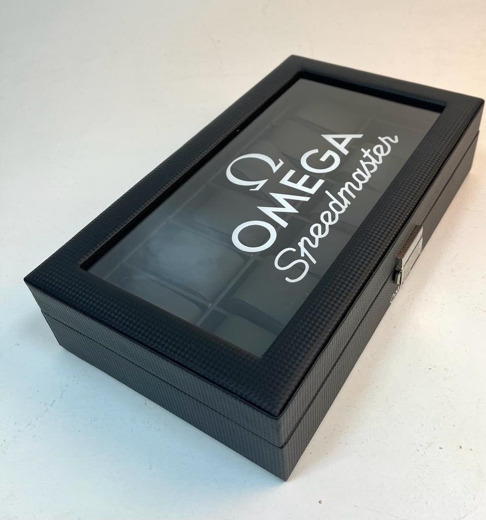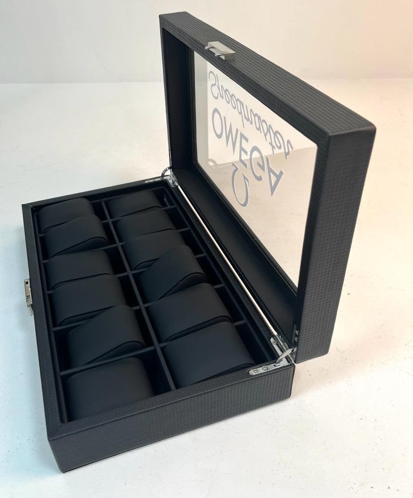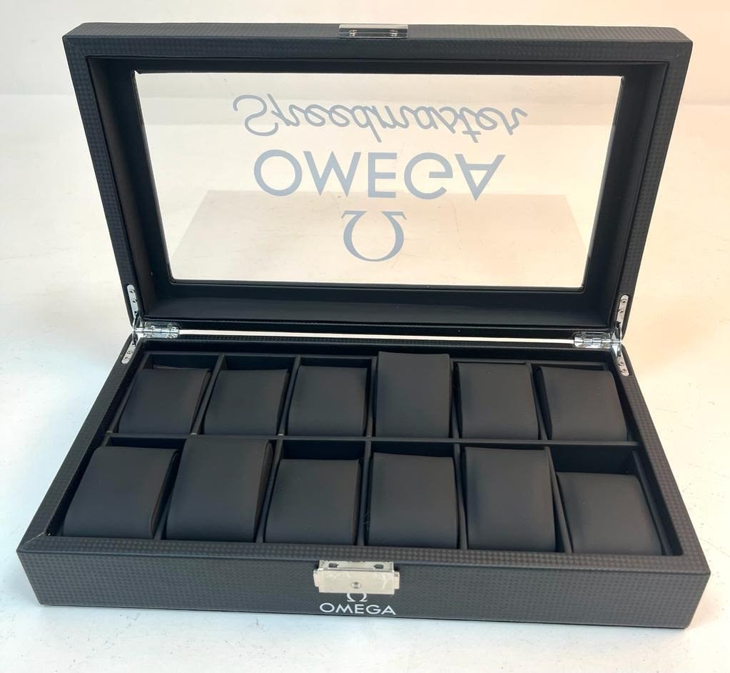 A Twelve Watch Omega Display Case. Carbon fibre effect finish. Black felt on base. 52mm spaces. Plush black cushions. Lock with key. Perfect for high-end watch storage. In excellent condition (as new) - 35cm x 20cm.
