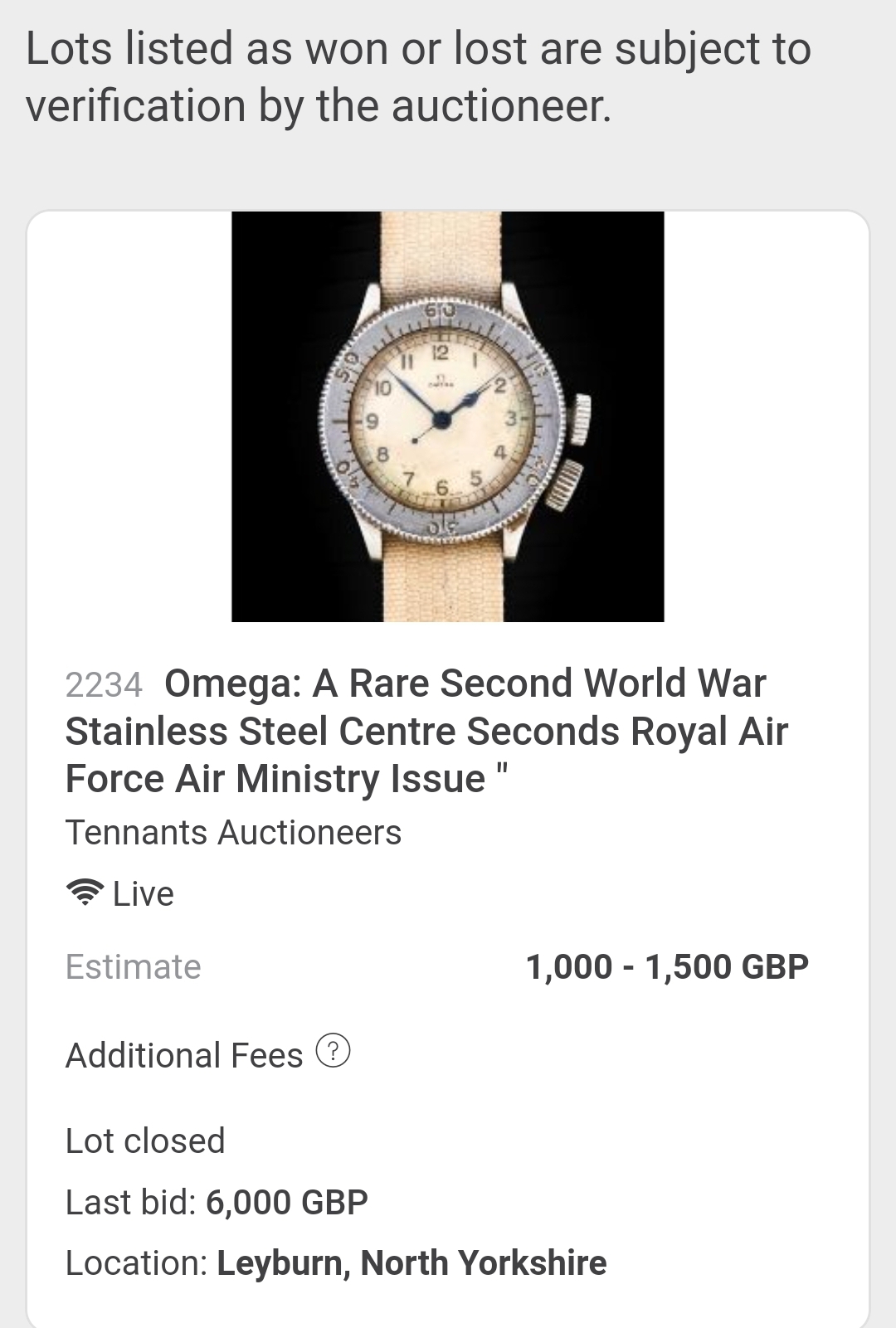The one your refer to sold for approx £7800 inc commission premium. What was surprising about this auction was that the watch did not work and had no movement photos if I recall. That said it had the bones to be a great example once serviced and brought back to life.