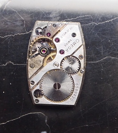 ·Found this in my stash while looking for something else. There is no case, and the dial is poor. But the bi-metallic temperature compensating balance wheel is good, as is the blued steel, Breguet hairspring. Shown without the stem as the movement comes with its dust cover, and the stem had to come out. 15 Jewels, a 5 million serial number, Omega caliber 17 L. This movement has appeared here as a T17, but my Bestfit book calls it a 17L. If you have a case, with a basket case movement, this might be for you. Unfortunately, I will not part it out. I have never offered anything for sale before, but I have references. Asking $500.00.
