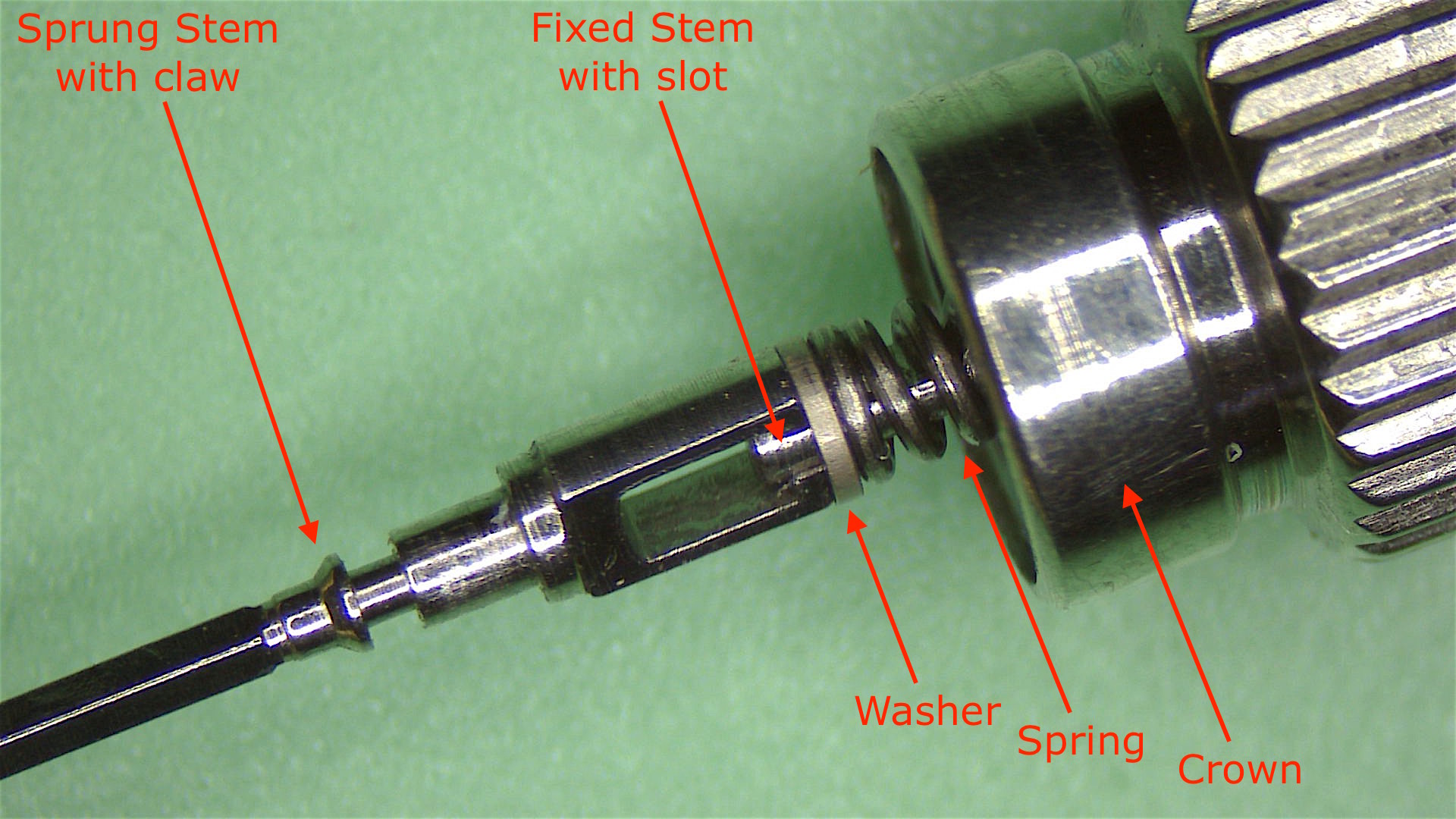 You need one hand to hold the crown (or a stable soft jaw vice), One hand to use strong tweezers to push the spring washer and spring down, and another hand to remove the sprung stem.