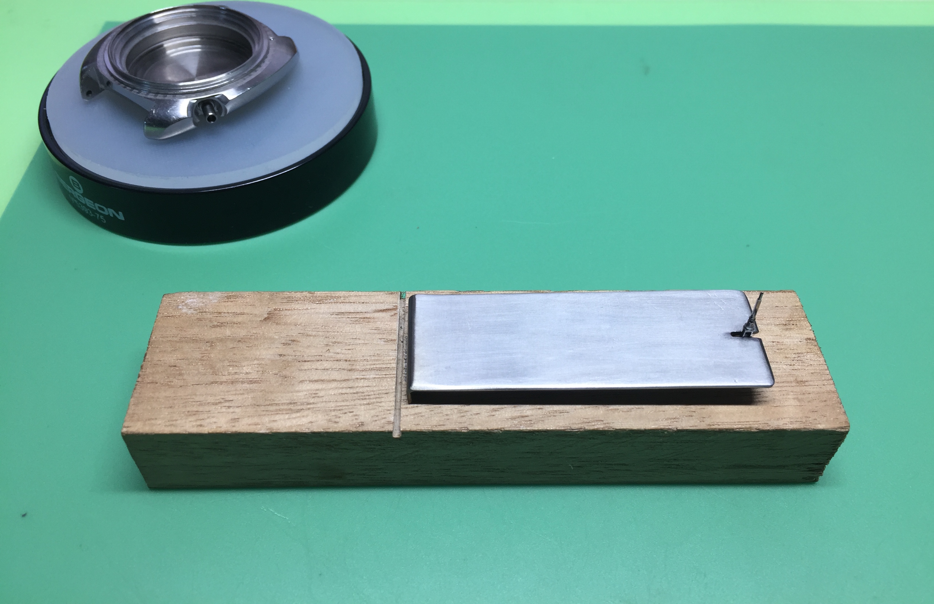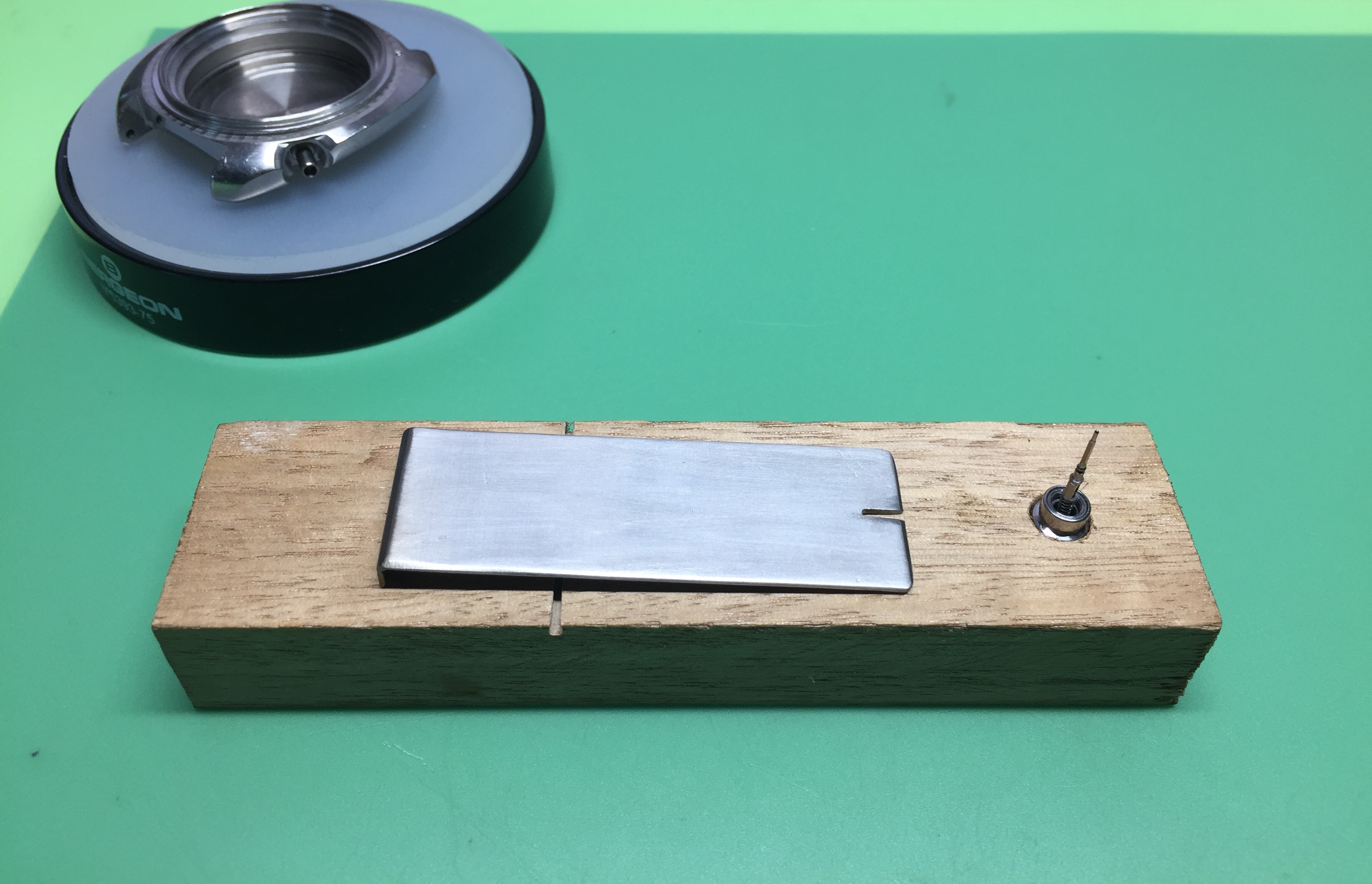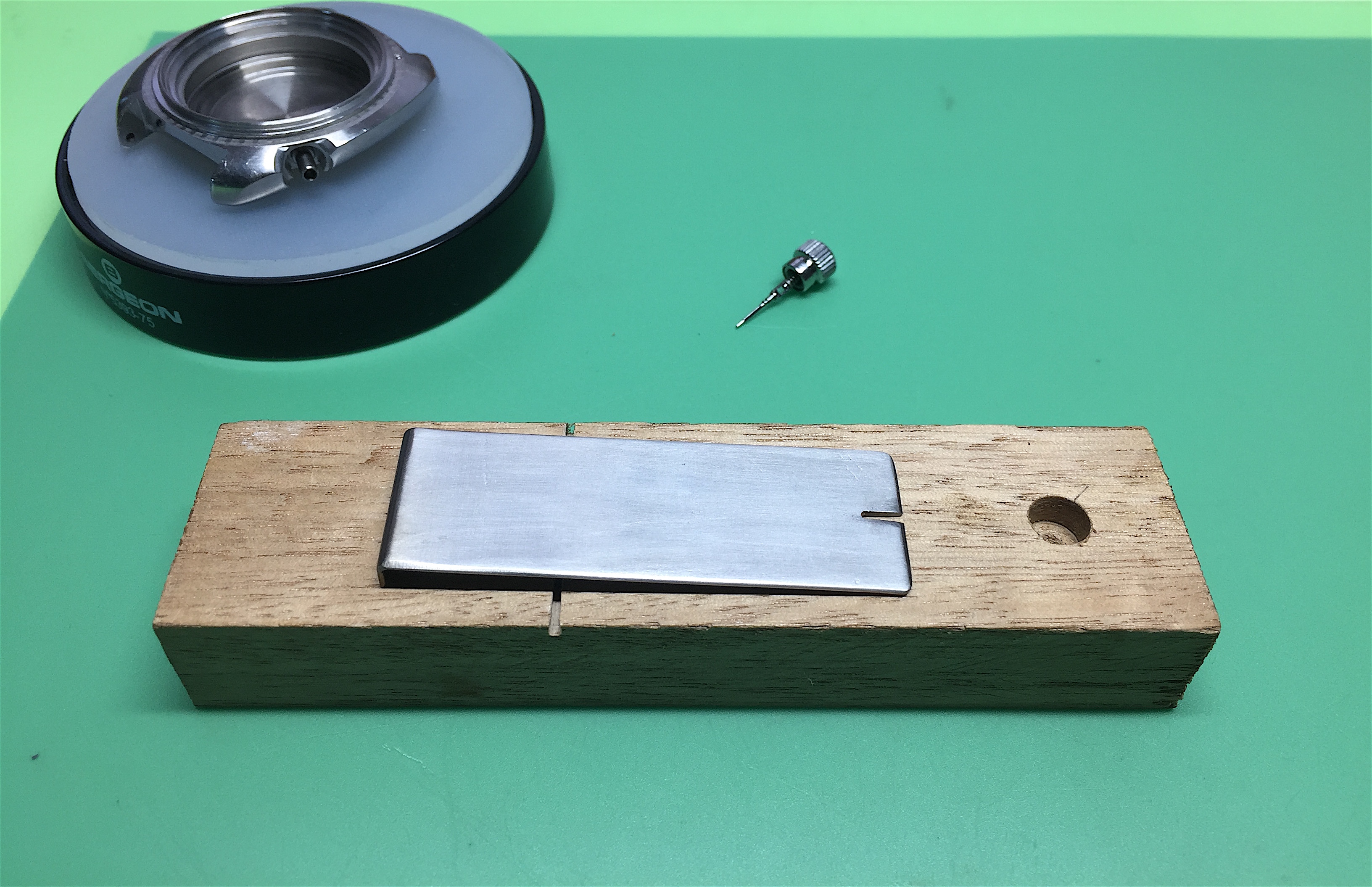 So I made a tool. A block of Tassie Oak with a 7mm dia hole for the crown and a stainless plate with a slot to fit over the stem.