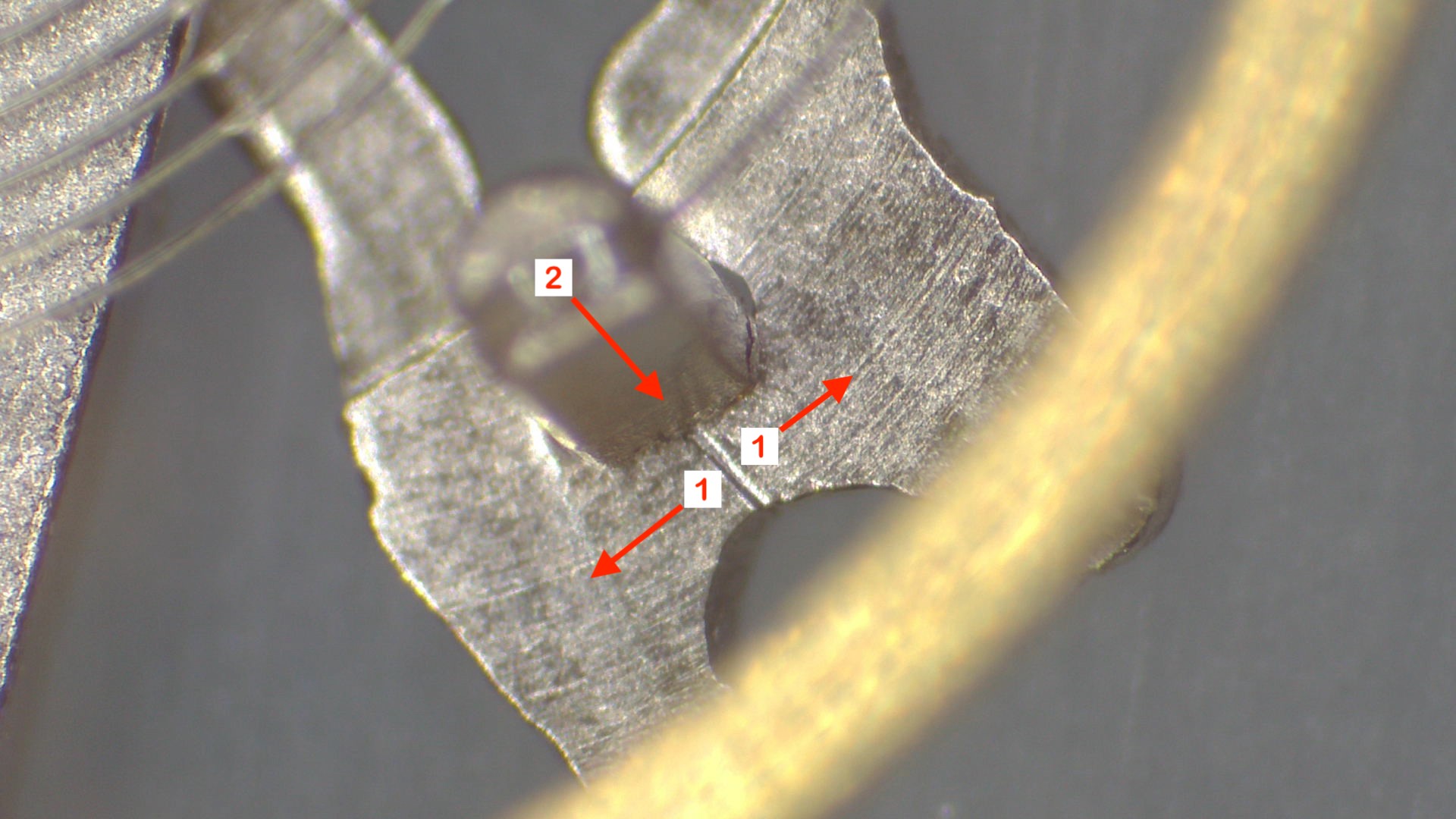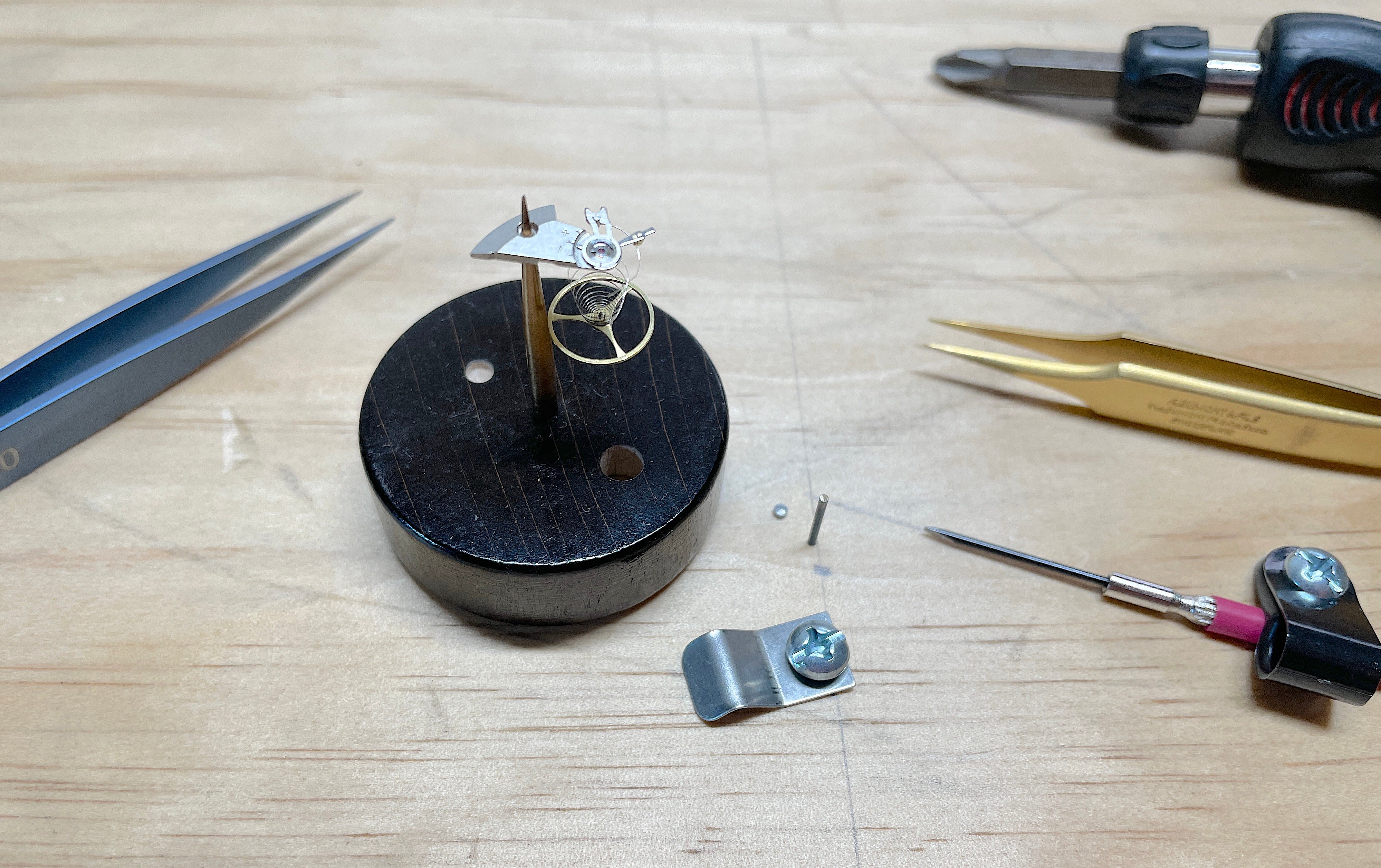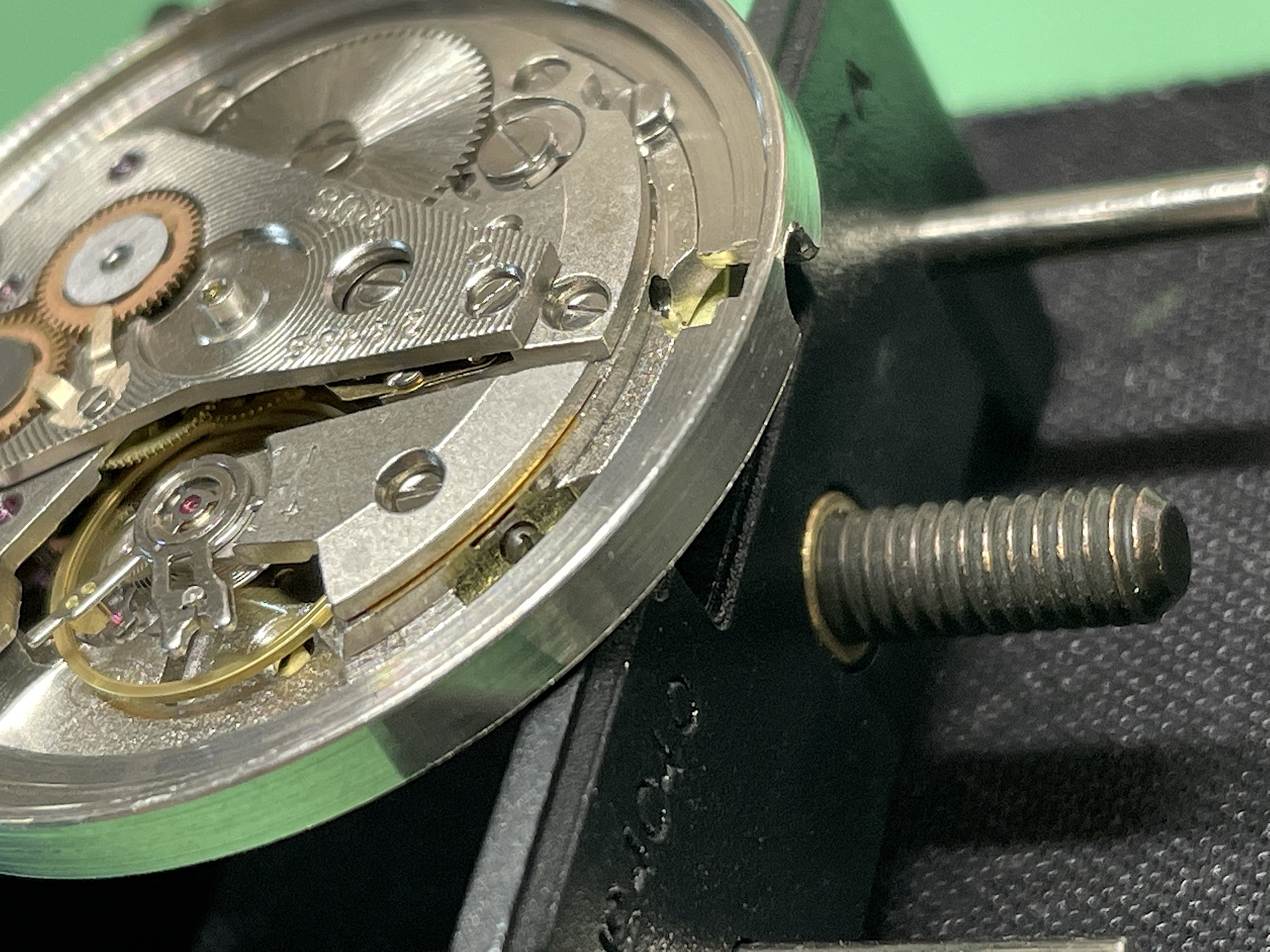 It seemed to be a simple fix, just re-attach the sud to the carrier. However! Those cunning Russkies had a special way of holding the stud in the carrier. Not content with the tried and true method of holding the stud in the carrier by a simple screw used in millions of watches, or even the ETACHRON style system used by many others, this stud is held in a split carrier, so to insert the stud, it’s necessary to (1) open the “jaws” of the carrier and (2) insert the stud into the carrier.