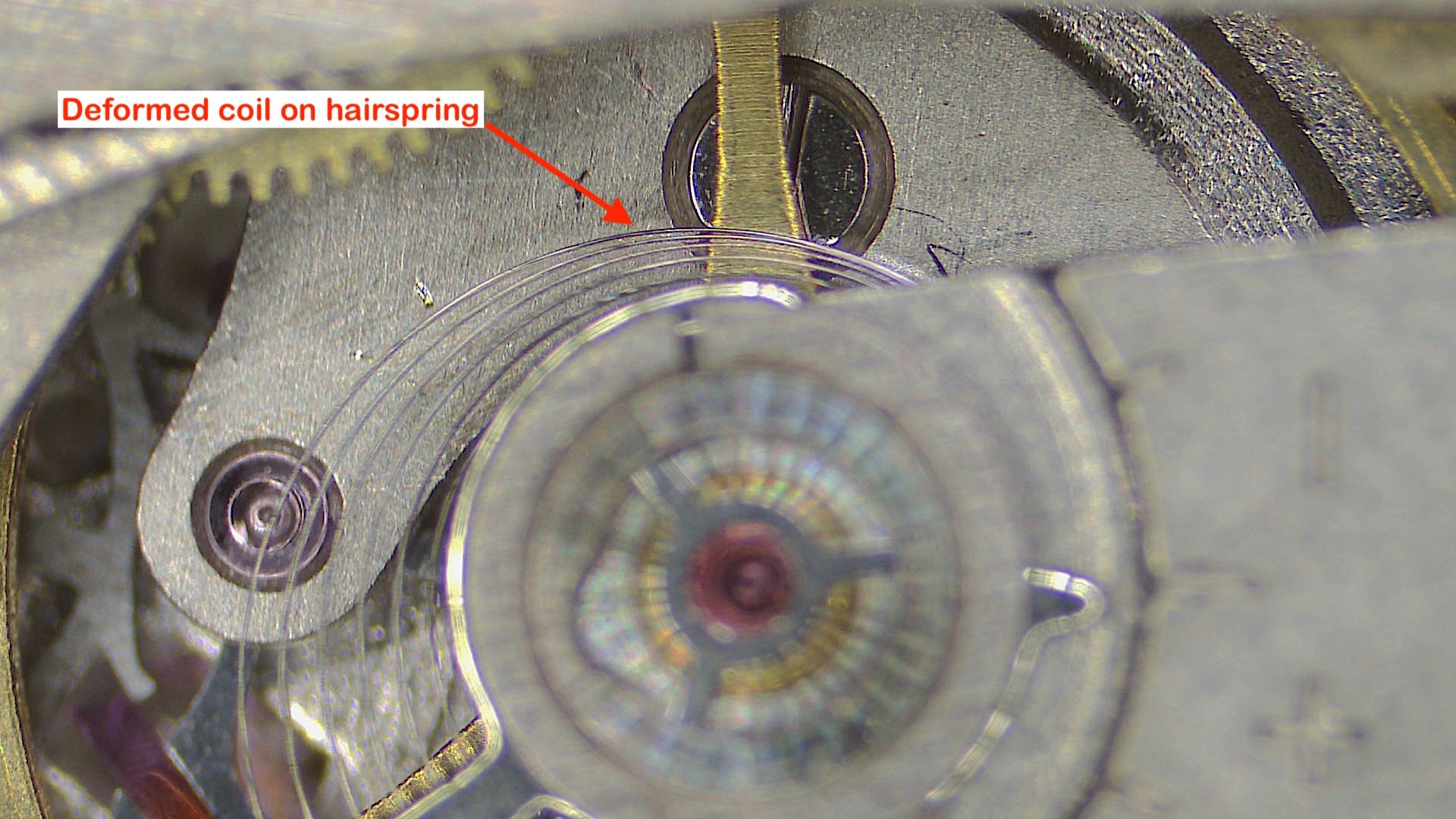 Looking closer I saw that the hairspring coil was seriously out of whack. Instead of nice evenly spaced coils, the spring was compressed to one side.