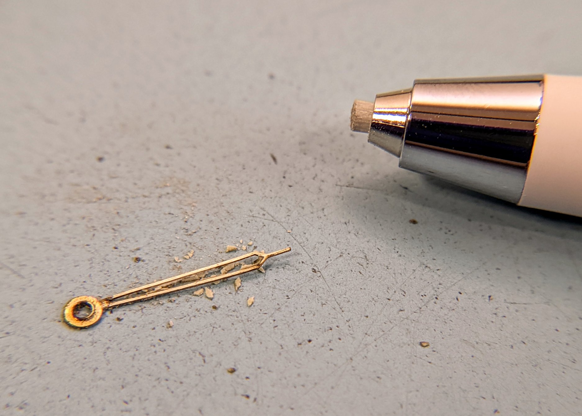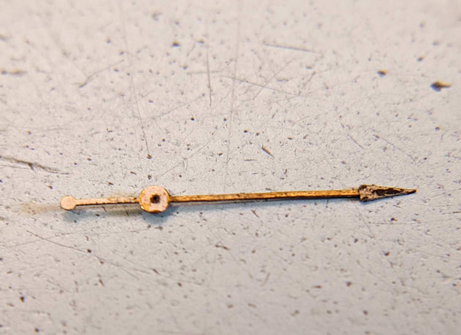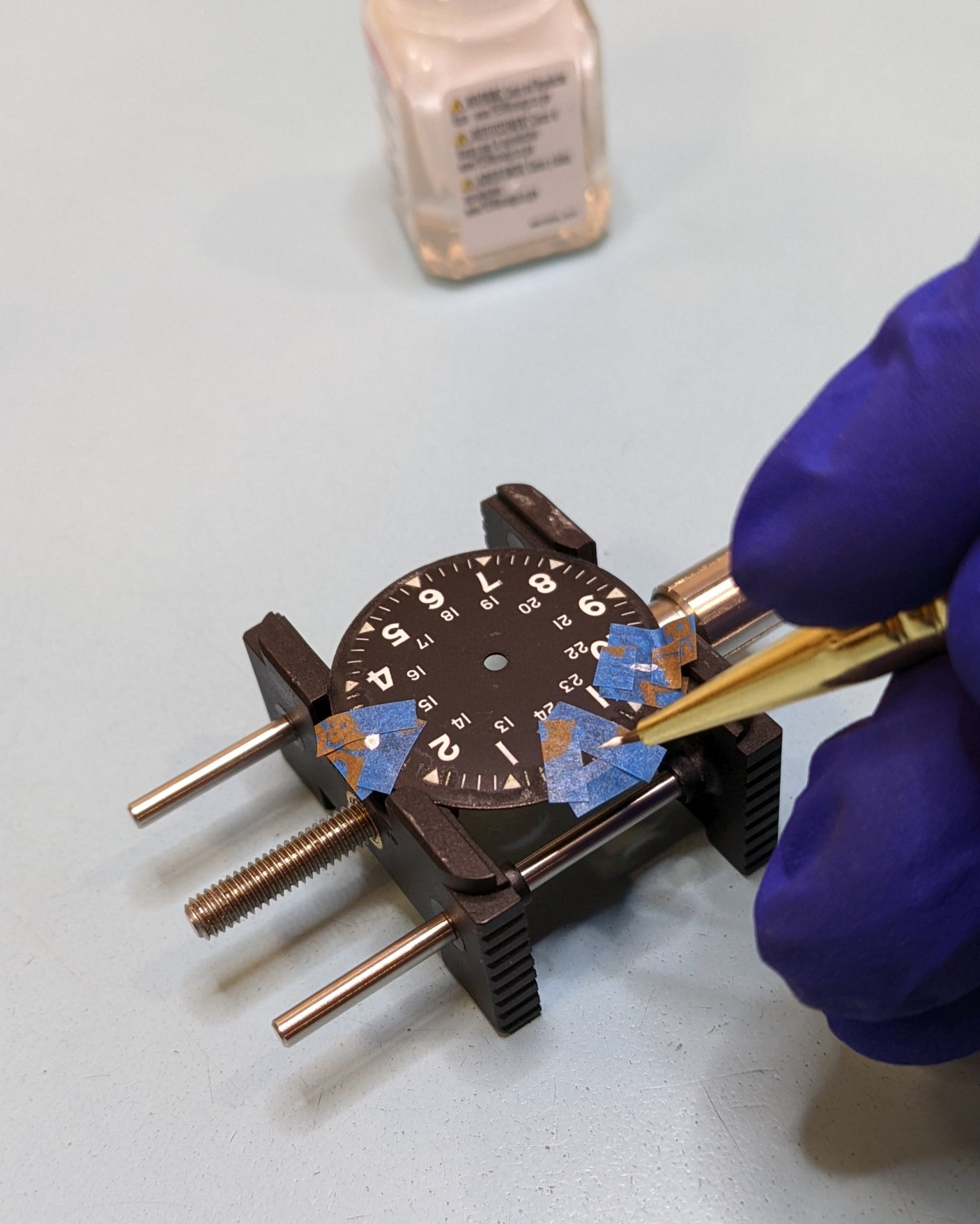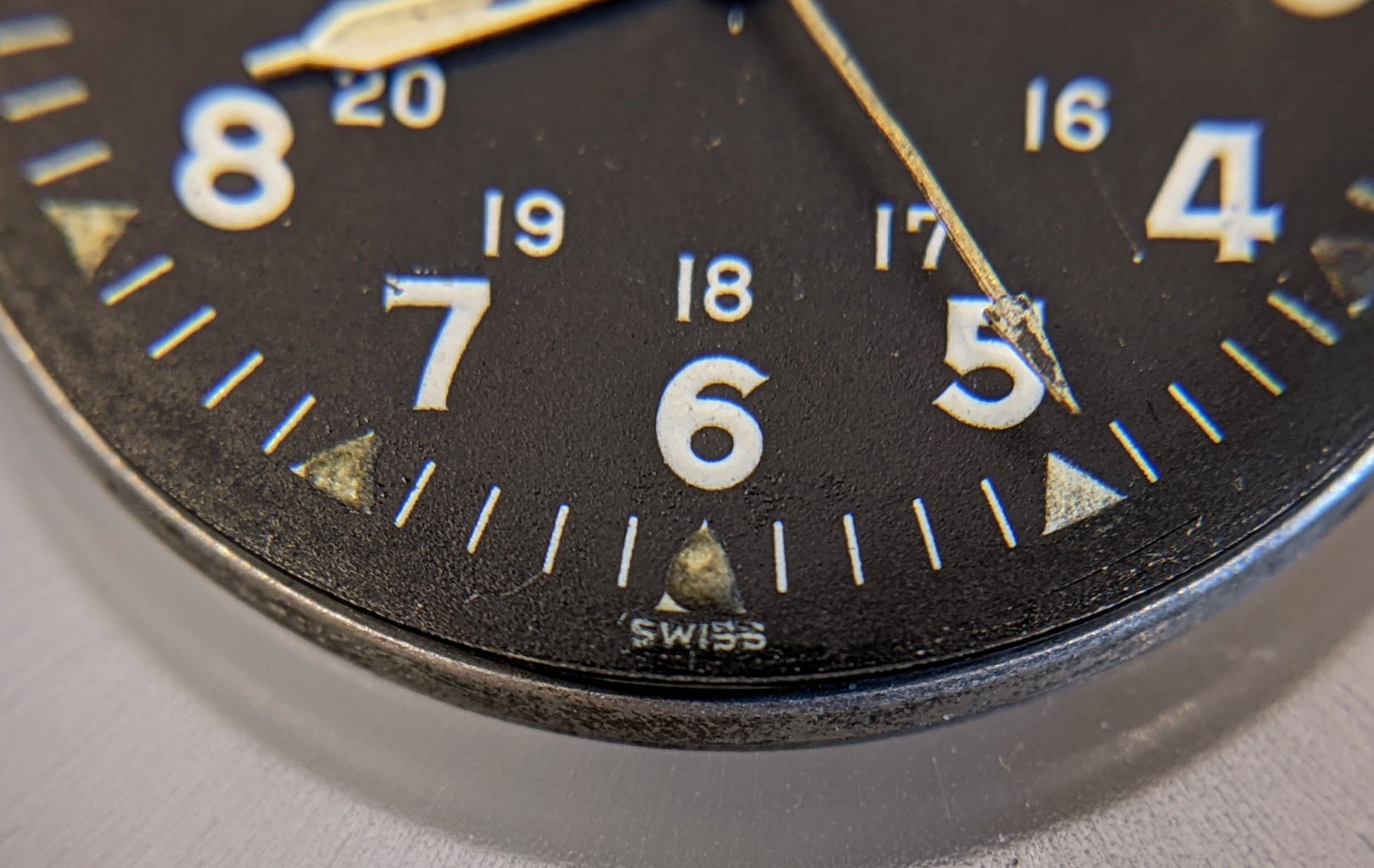 The Geiger Counter was quiet for the dial & hands, so whatever was applied before was not Radium. Gently scraped off the grotty looking old lume, but that still took off the paint for the hour index underneath. So, let's see how some flat white acrylic model paint looks.