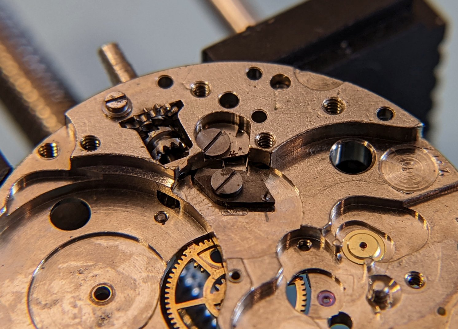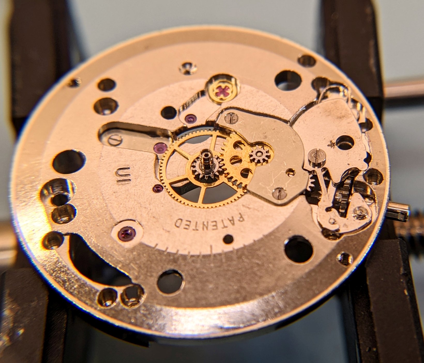 ETA 2372 base movement with hacking added in the conversion to the DR 2F2. Little bit grimy, but running & looks complete (but for the crown & stem :-p).