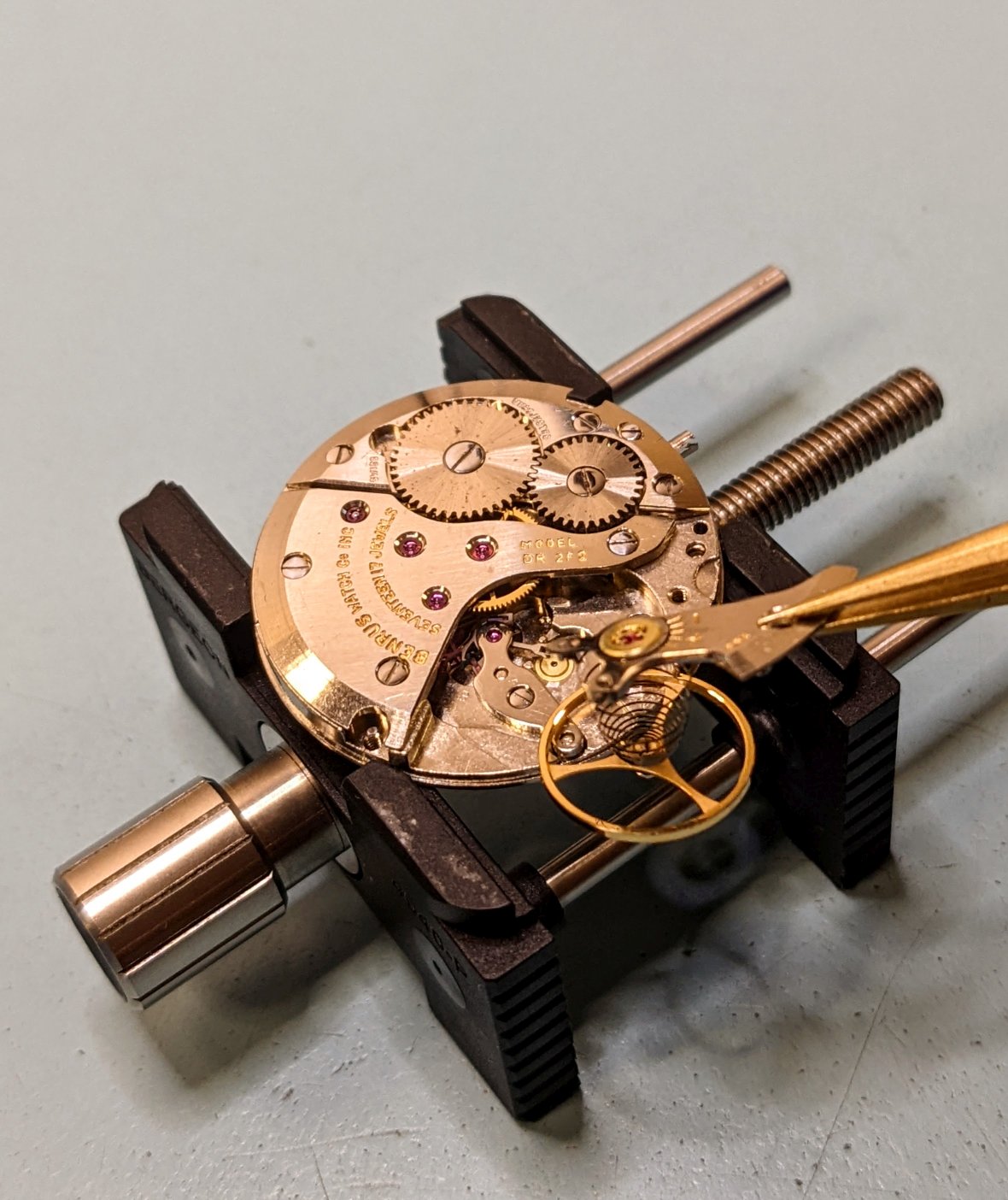 The DR 2F2 hacking lever. When the stem is pulled out to setting position the hacking lever rotates & presses the hacking pin into the side of the balance wheel (looks pretty crude, compared to the crafting & finishing of the rest of the components...)