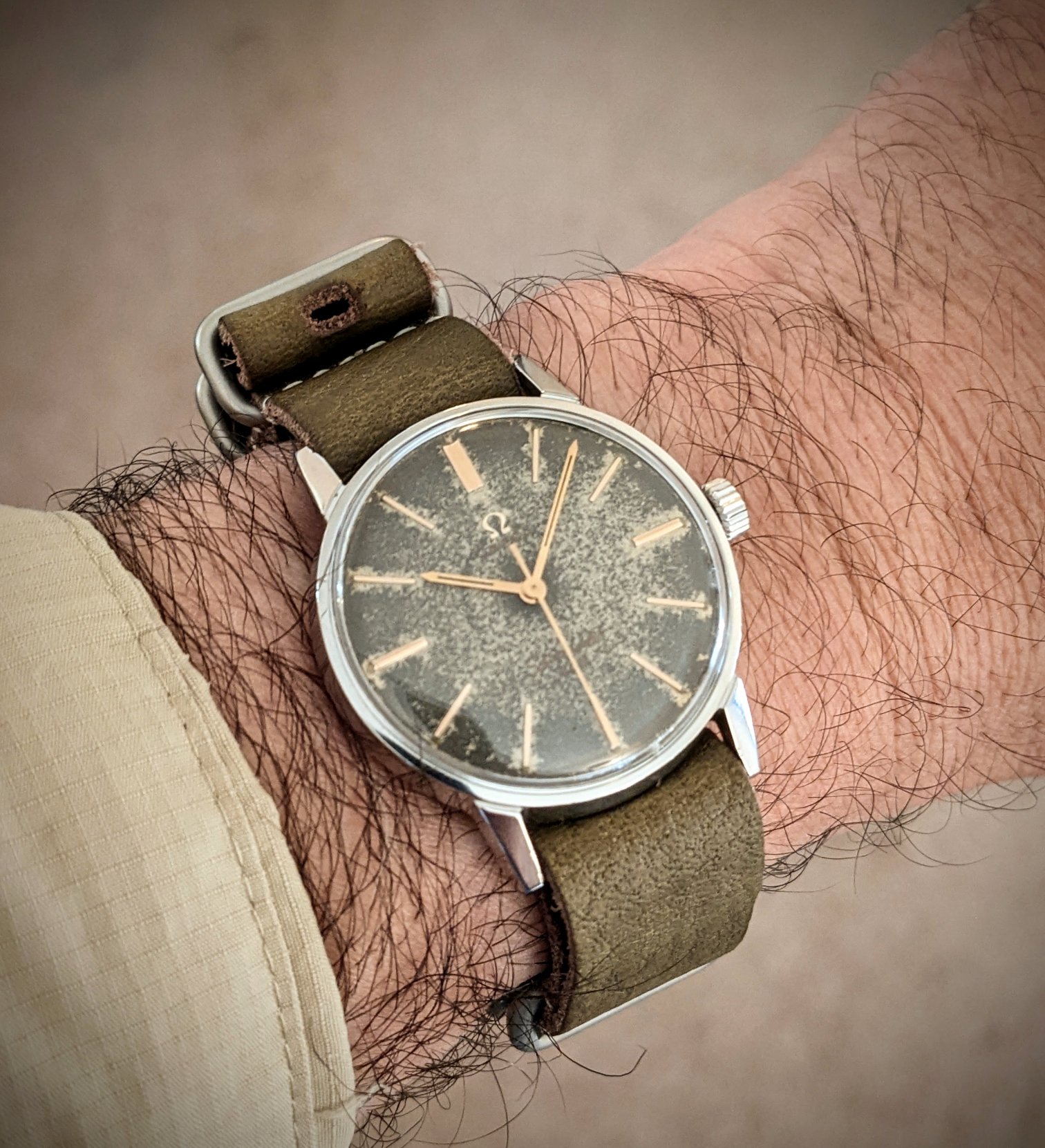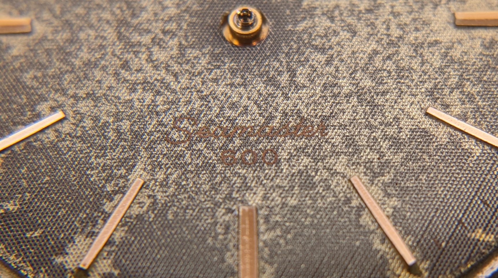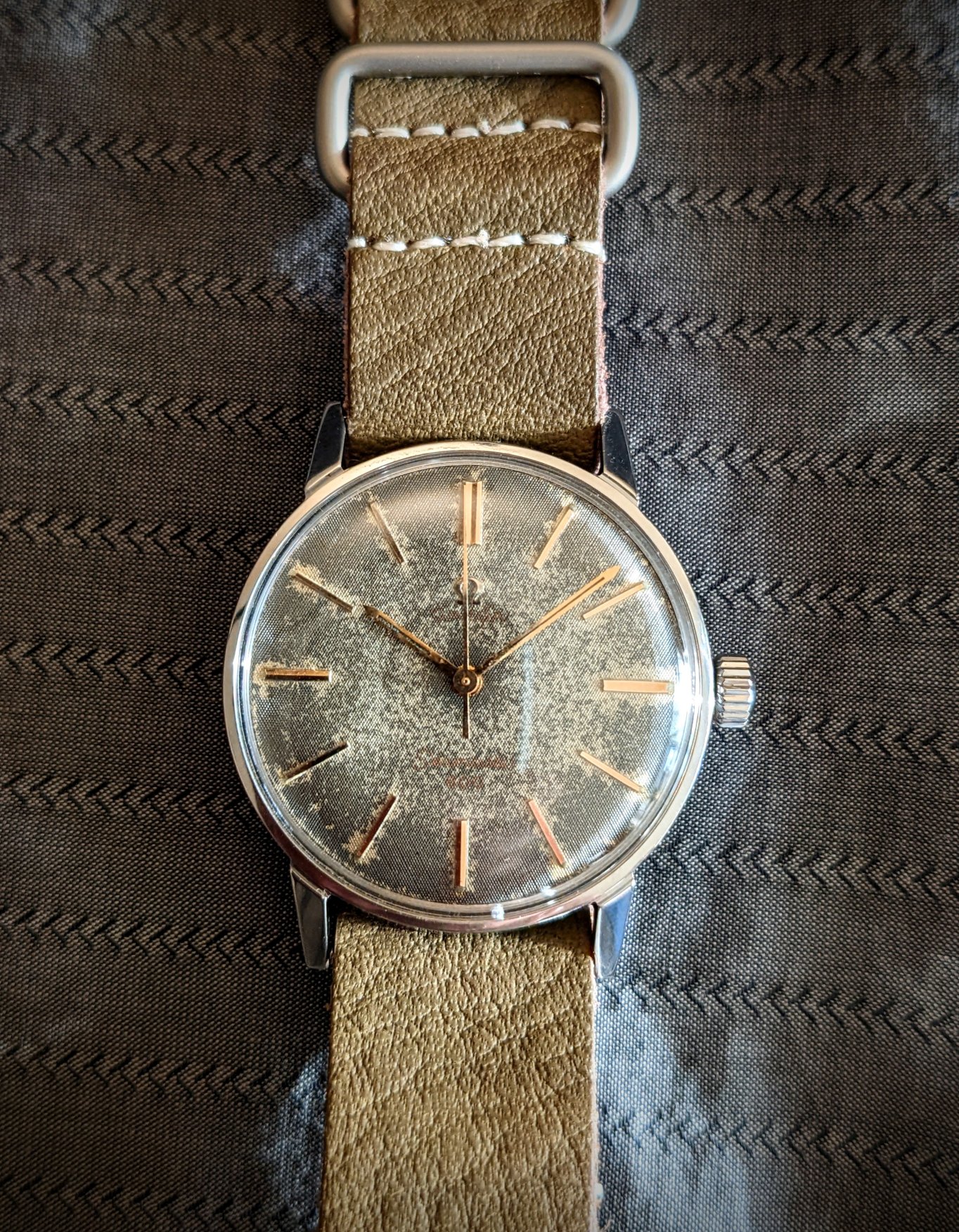 The heavily patinated dial may be regarded as ruined by some, but I kind of like the effect. Wonder if the cross-hatch texture of the dial surface contributed to the pigment degradation?