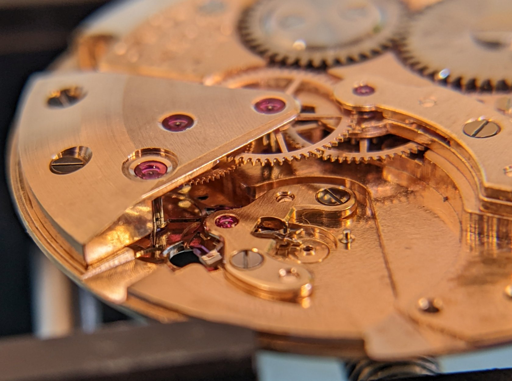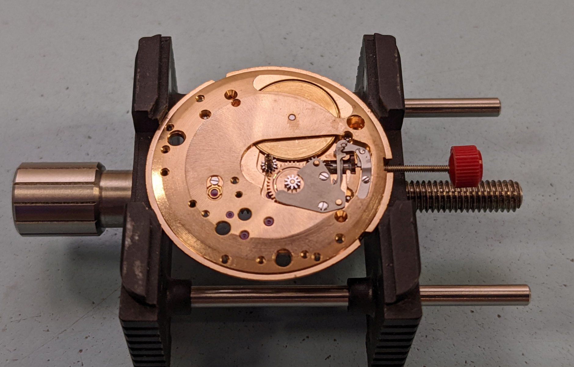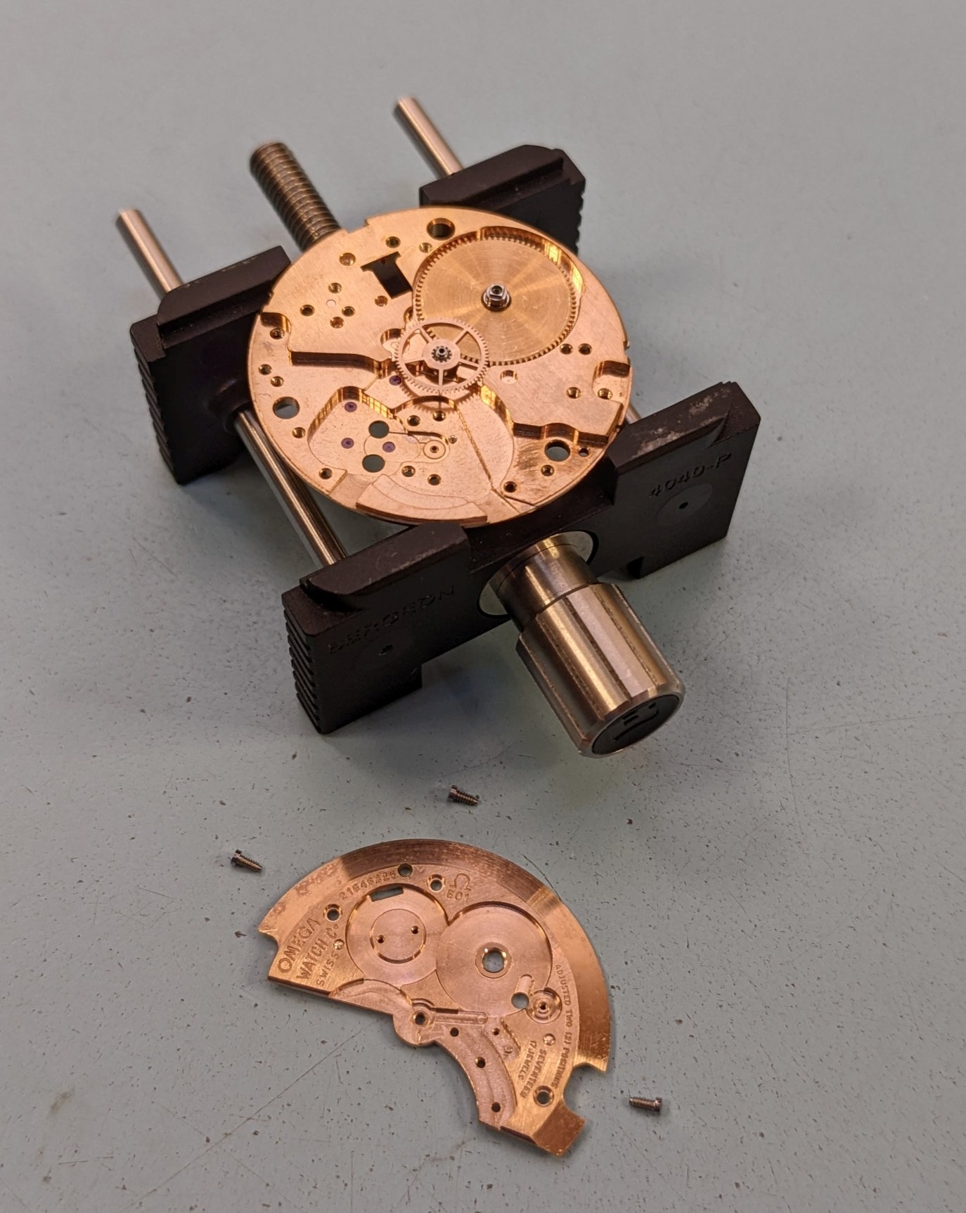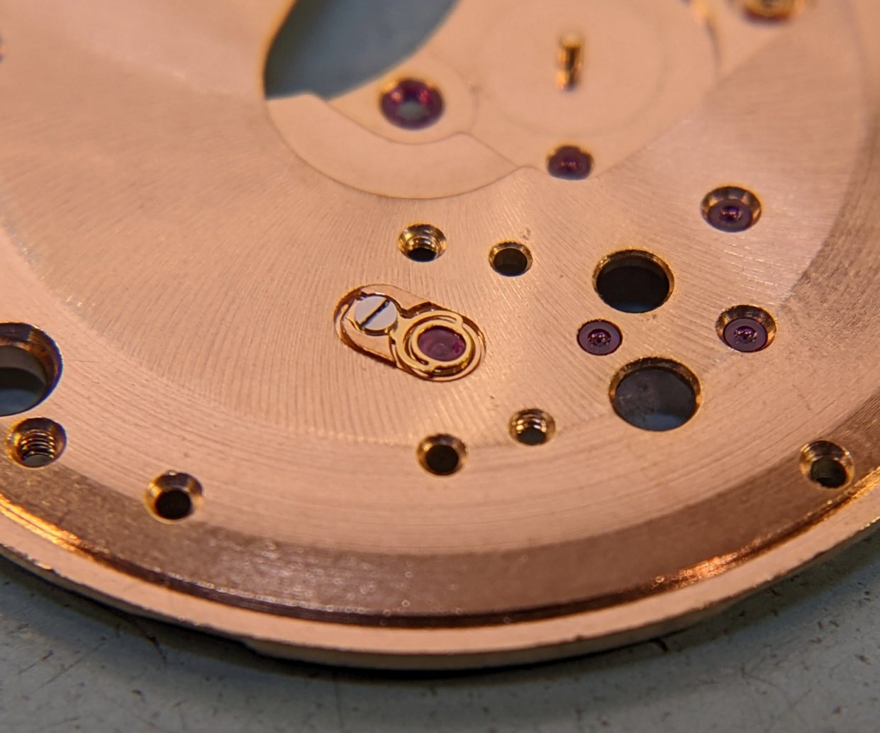 Watchmaker side. Putting the barrel bridge back on now will make life easier for holding the keyless works in