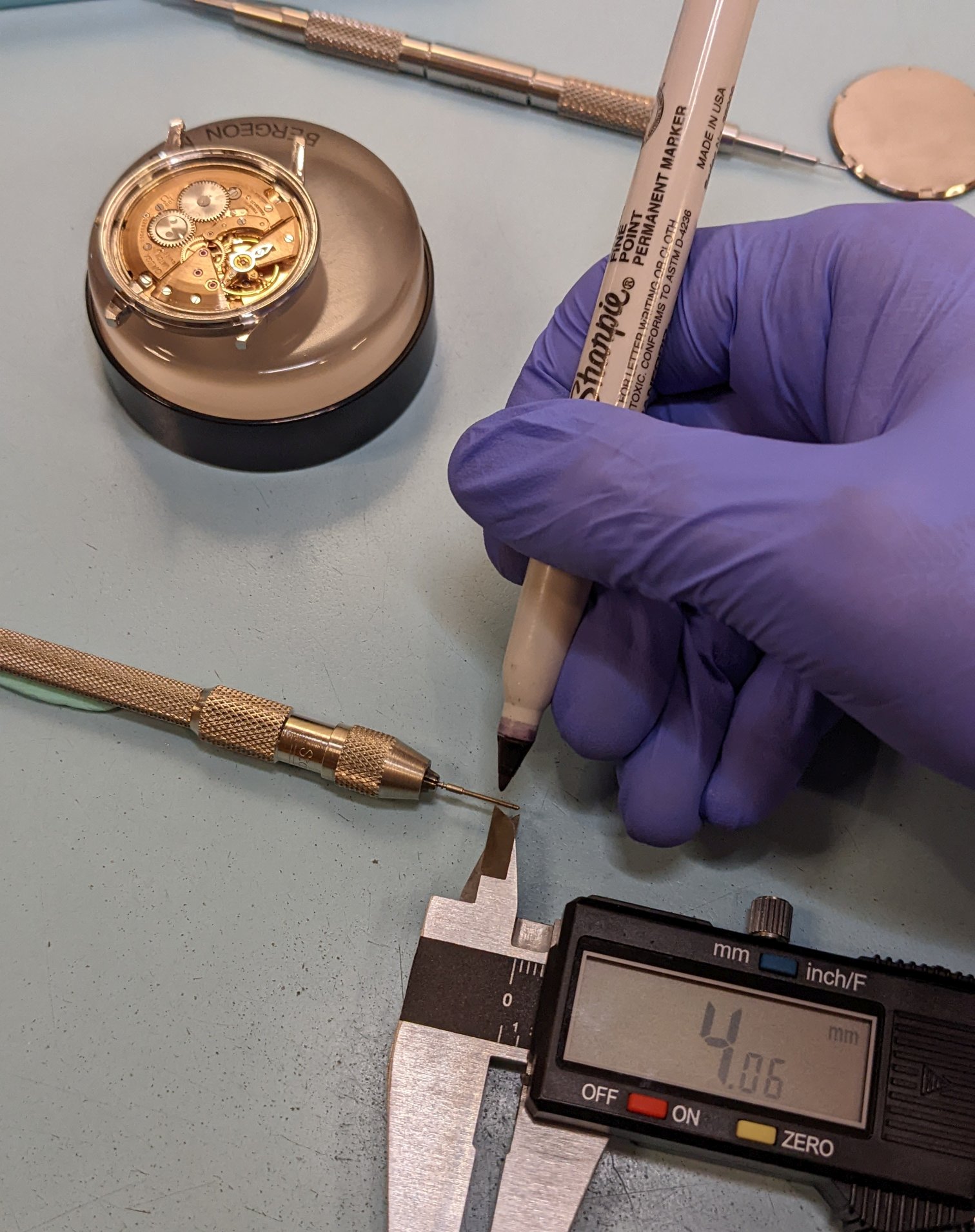 Gauging how much the stem needs to be shortened by in order for the inside of the crown to fit flush against the case.