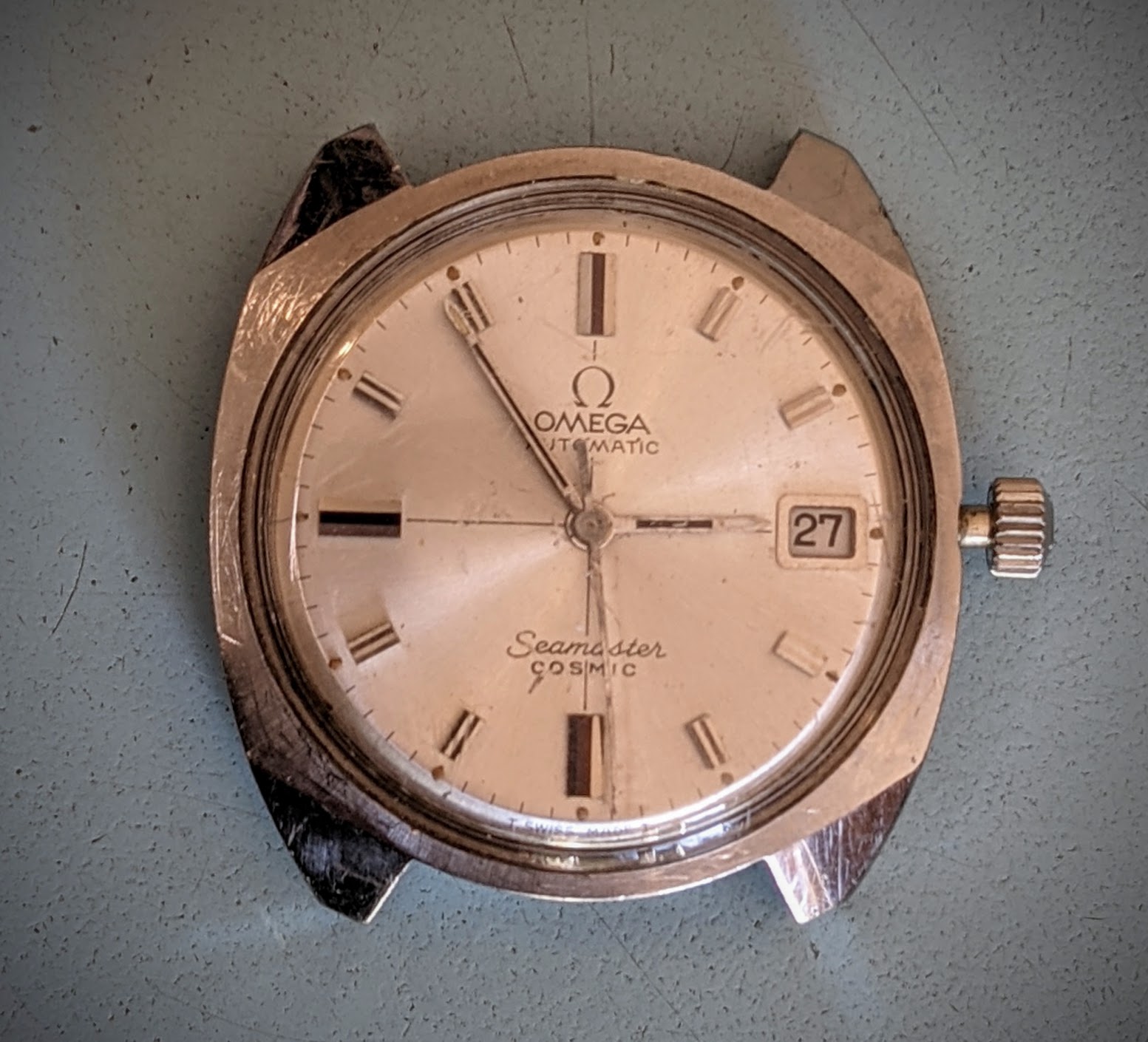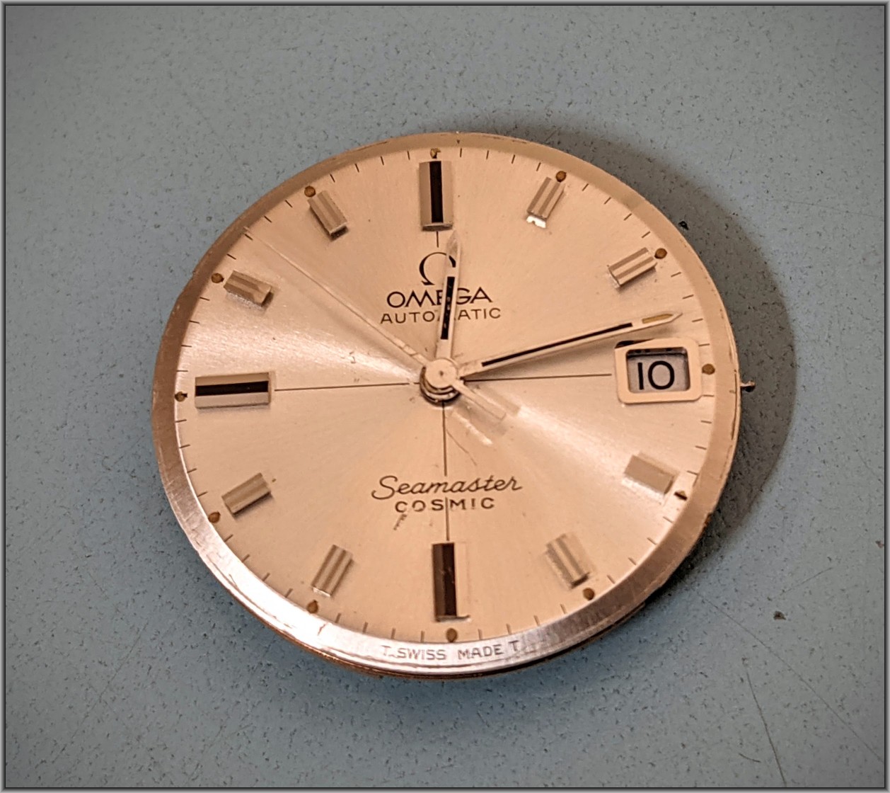 It's a nice looking watch, but it has had a long life & seen a lot of use. Case has lots of scuffs, but this is normal wear. Doesn't explain how the dial got marked up, though.