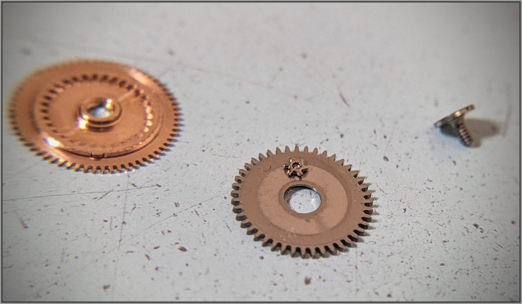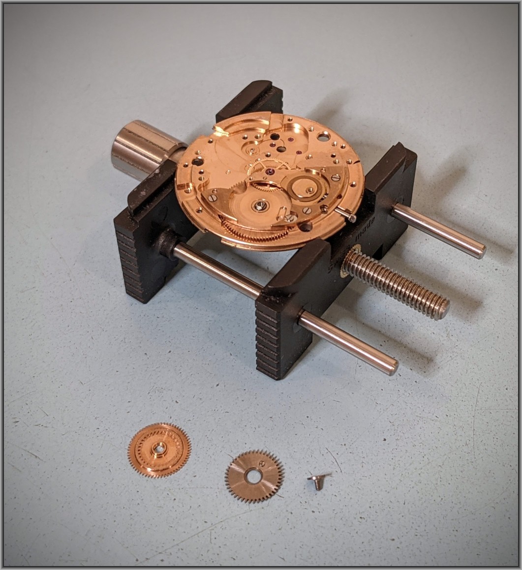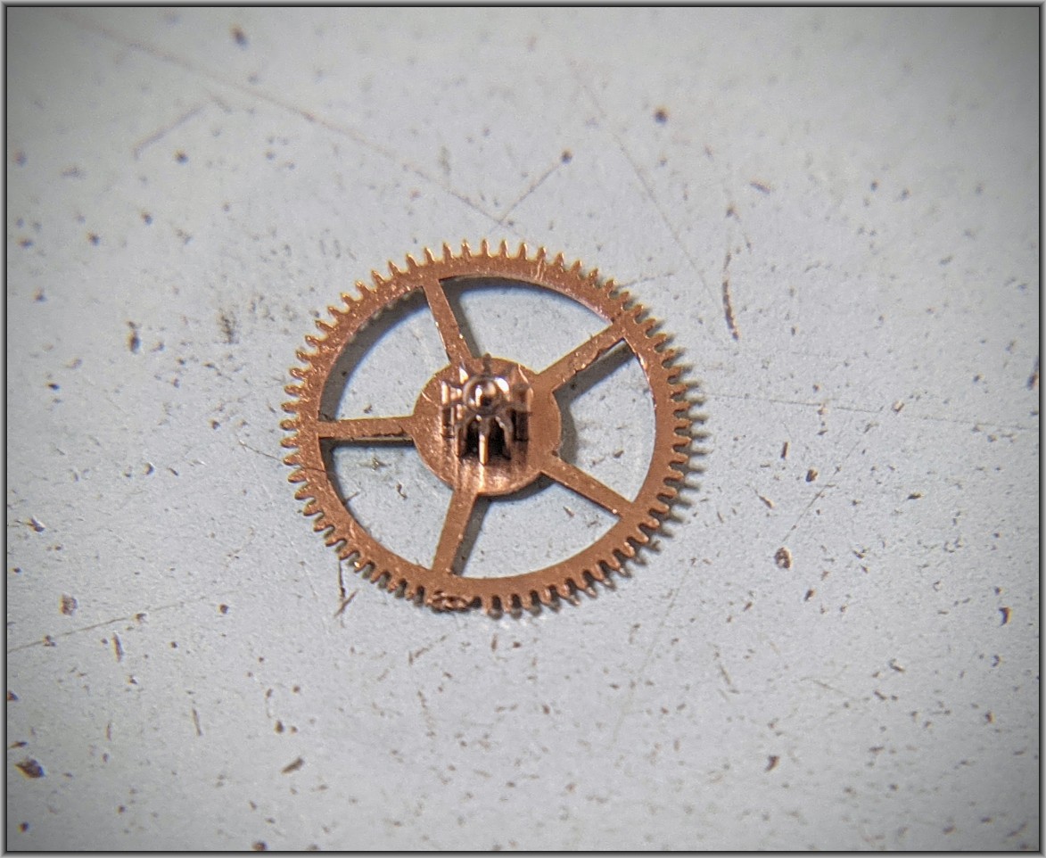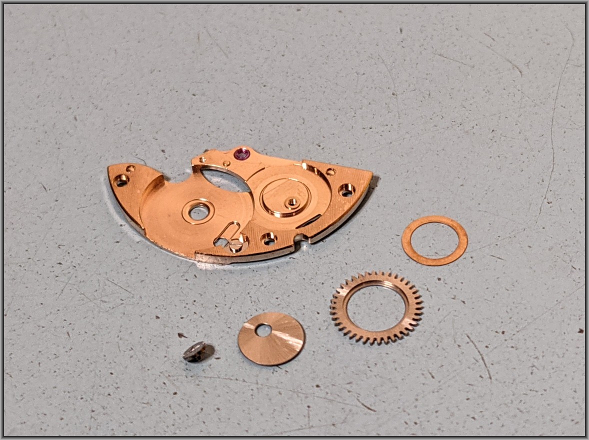 The intermediate winding drive wheel is what took the damage from those stray parts. This part is not salvageable, but was able to find a used whole auto-wind mechanism at a reasonable cost to serve as a parts donor.