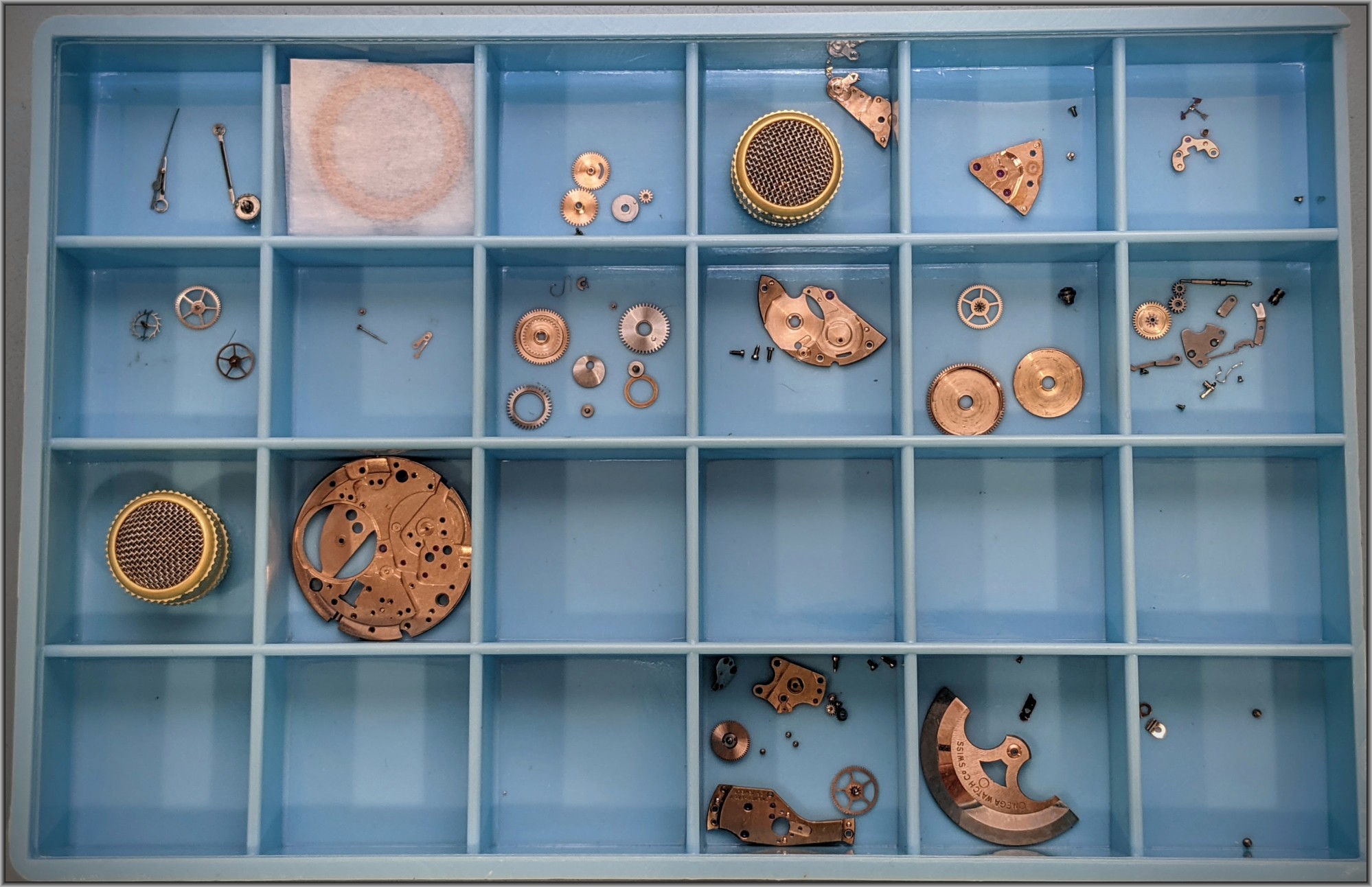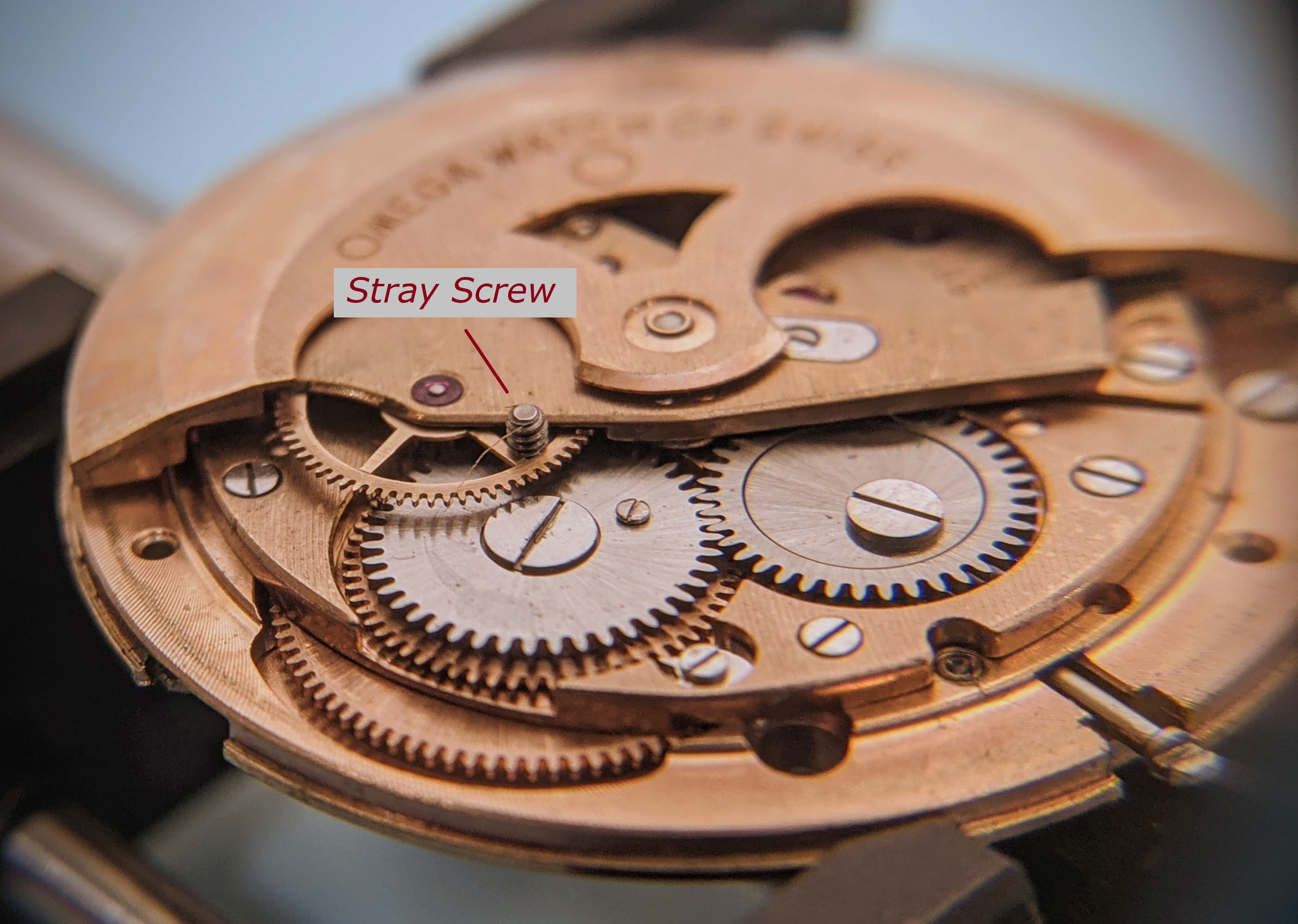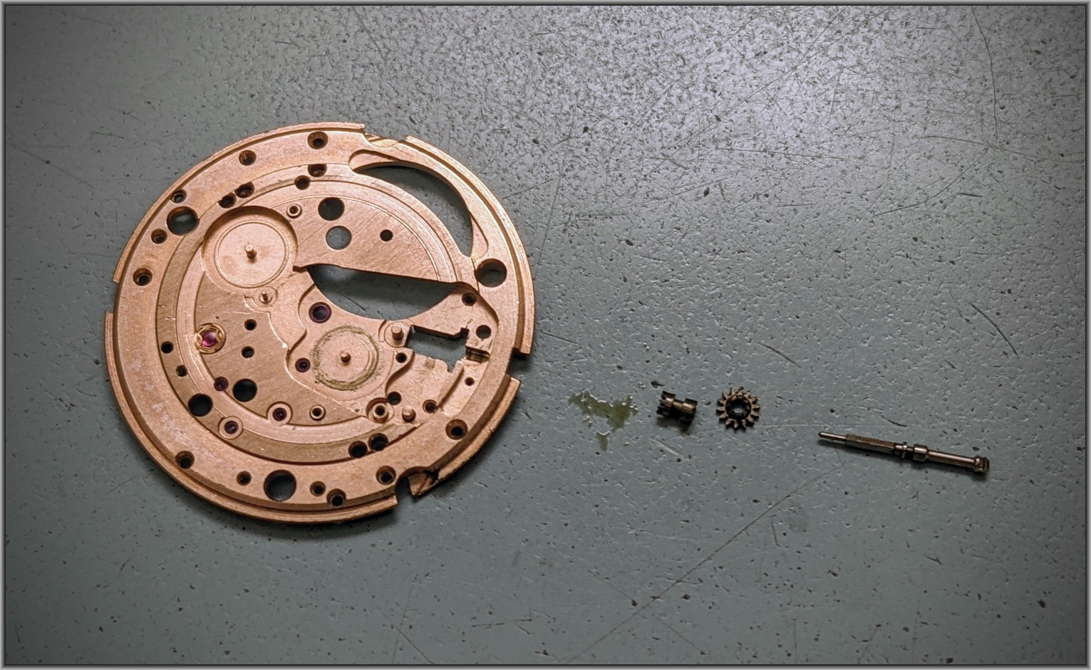 The intermediate winding drive wheel is what took the damage from those stray parts. This part is not salvageable, but was able to find a used whole auto-wind mechanism at a reasonable cost to serve as a parts donor.