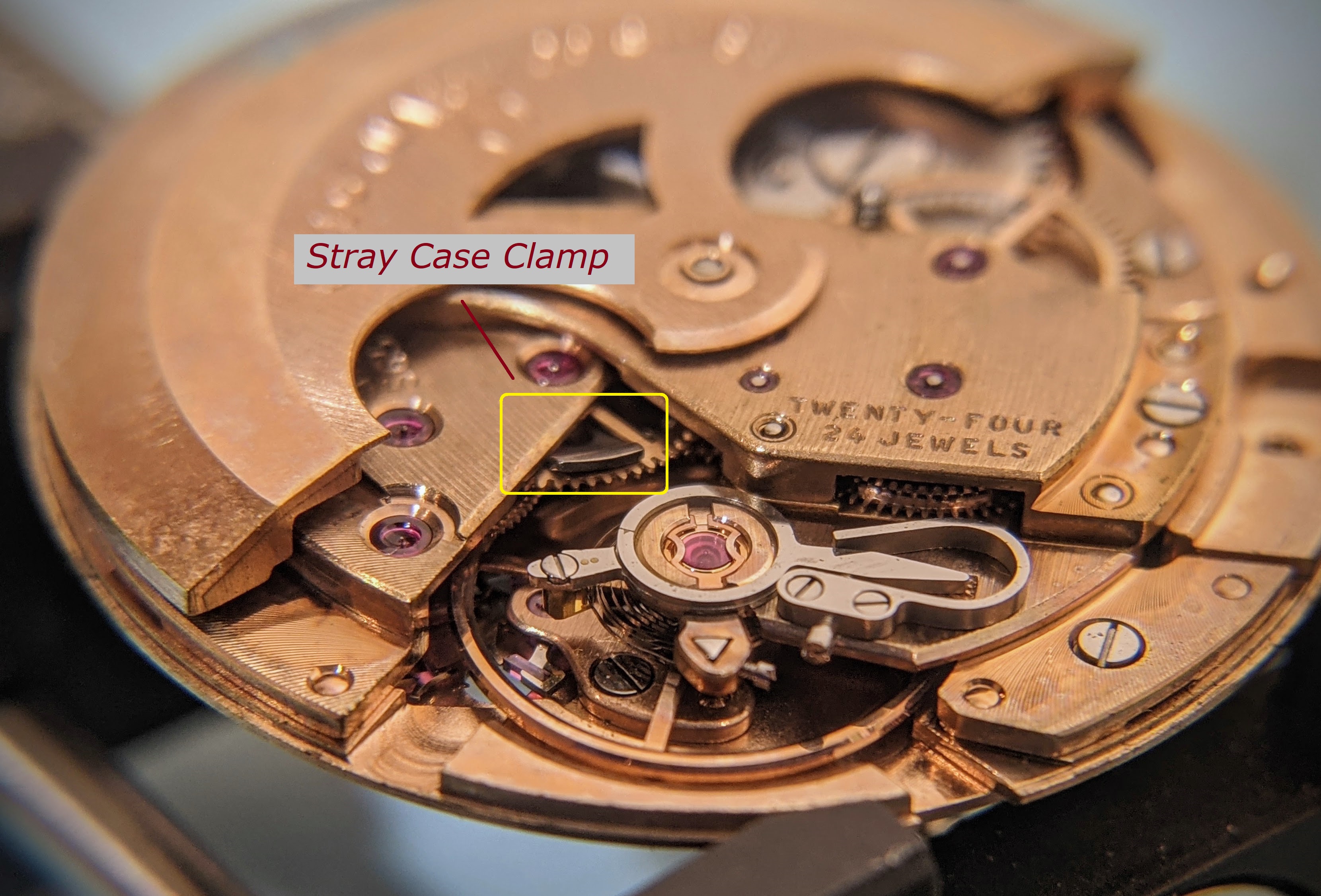 Clutch, winding pinion, & winding stem. Grossly excess oil (doesn't smell great, either...).